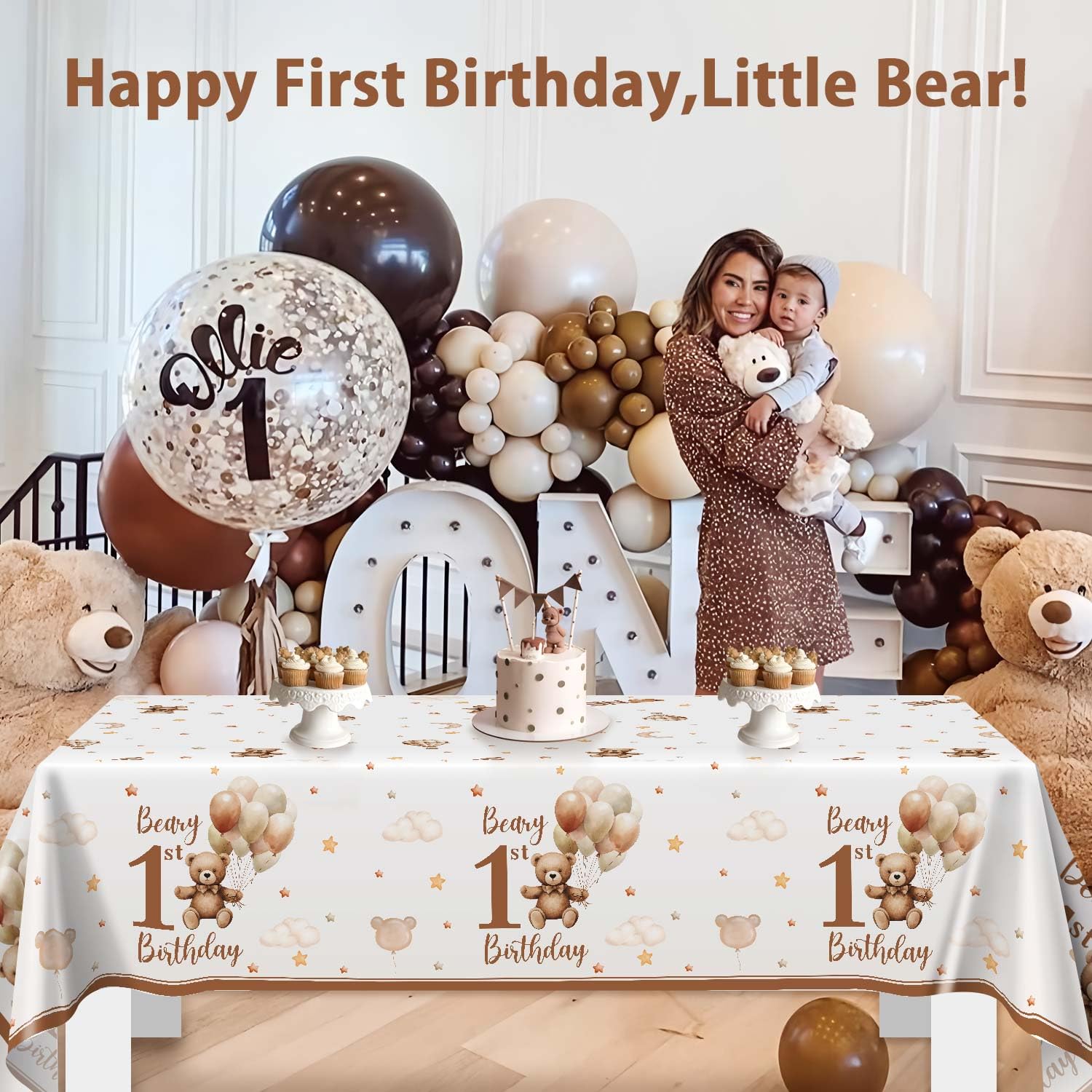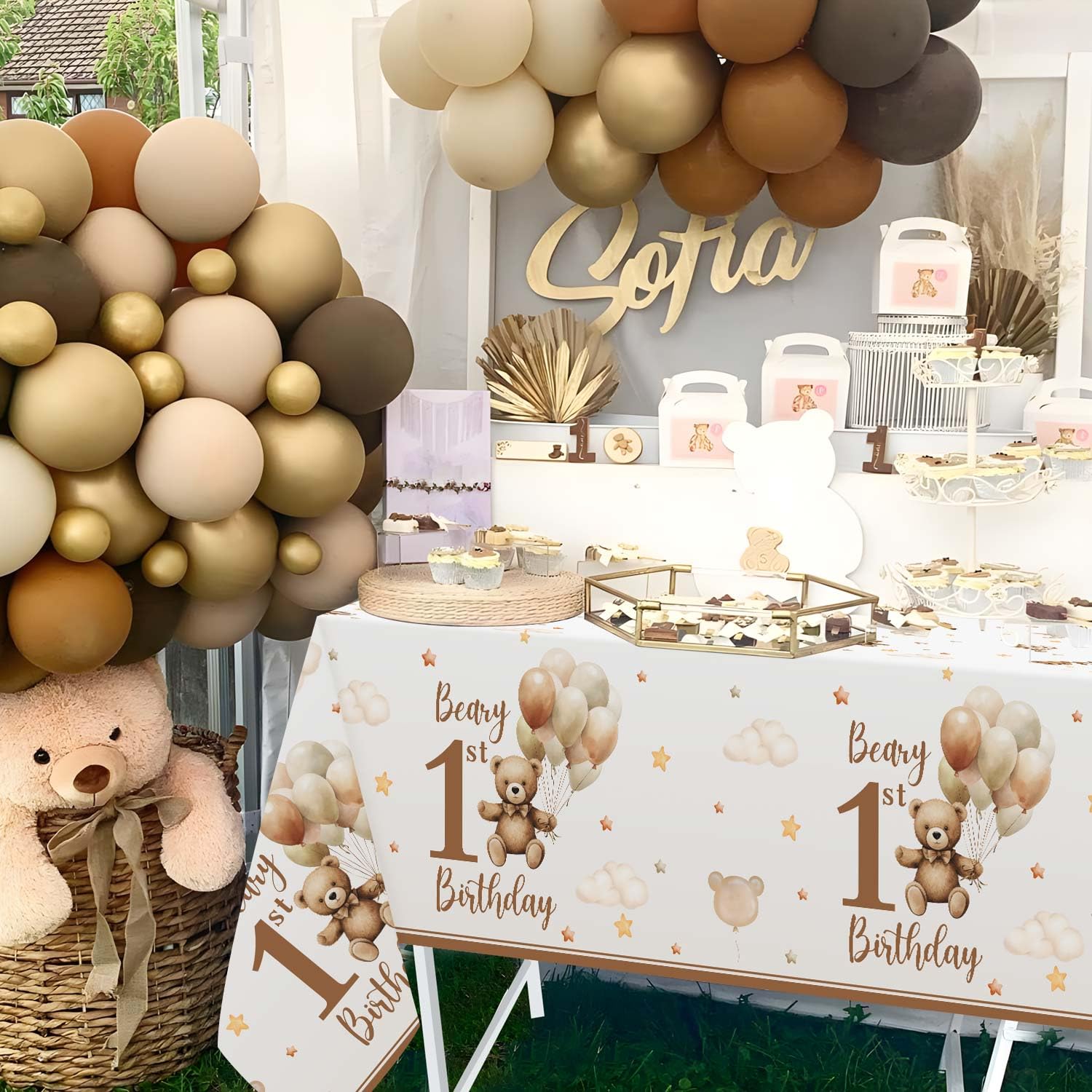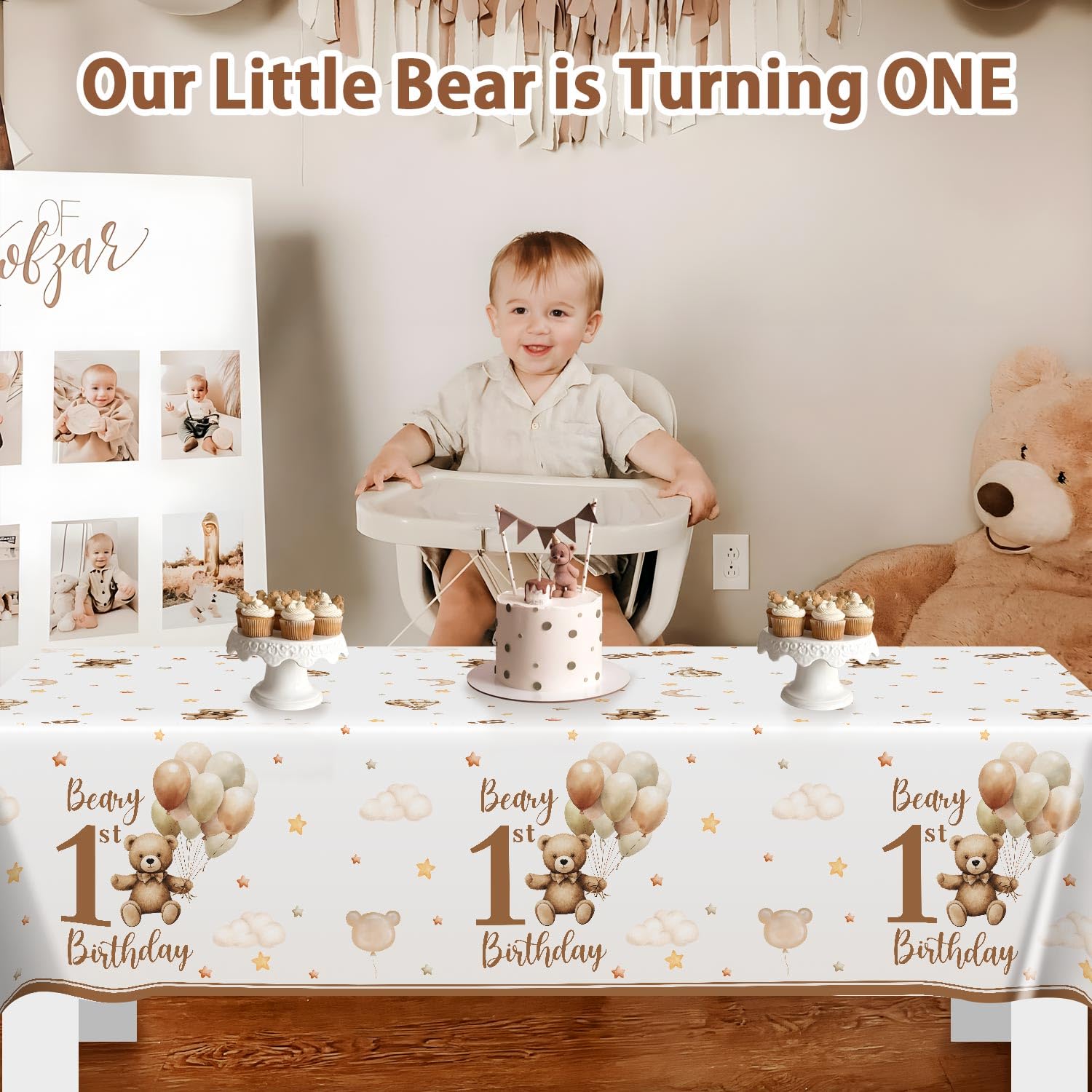 Caisehabu 3 Pcs Beary First 1st Birthday Decorations Tablecloths, Brown Teddy Bear One Year Old Large Size Table Cloths Rectangular Plastic Tablecloth 54 x 108 Inch