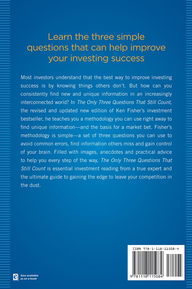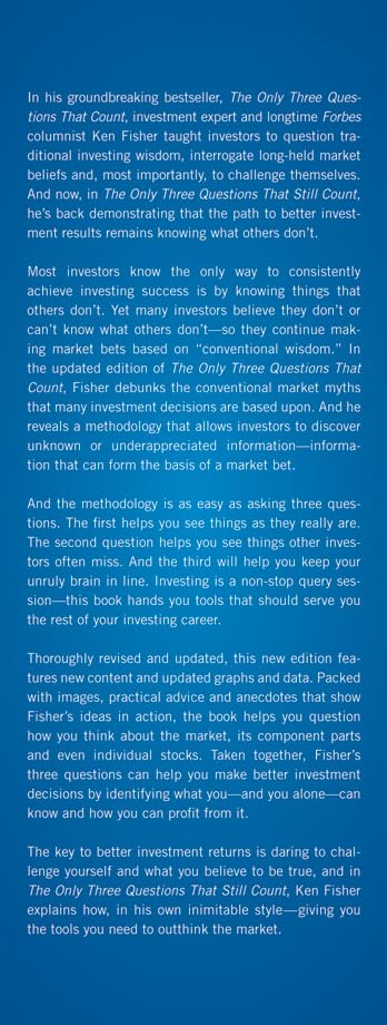 Ken Fisher explains what the competition doesn't know From investment expert and long-time Forbes columnist Ken Fisher comes the Second Edition of The Only Three Questions That Count. Most investors know the only way to consistently beat the markets is by knowing things others don't. But how can investors consistently find unique information in an increasingly interconnected world? In this book, Ken Fisher shows investors how they can find more usable information and improve their investing success rate―by answering just three questions. Packed with more than 100 visuals and practical advice, The Only Three Questions That Count is an entertaining and educational guide to the markets. But it also provides a useable framework investors can use now and for the rest of their investing careers. CNBC's Mad Money host and money manager James J. Cramer says the book "may be the single best thing you could do this year to make yourself a better investor" Steve Forbes says, "Investors will find this brilliant book an eye-opening, capital-gains producing experience" The key to improving investing results is daring to challenge yourself and whatever you believe to be true, and Ken Fisher explains how in his own inimitable style.