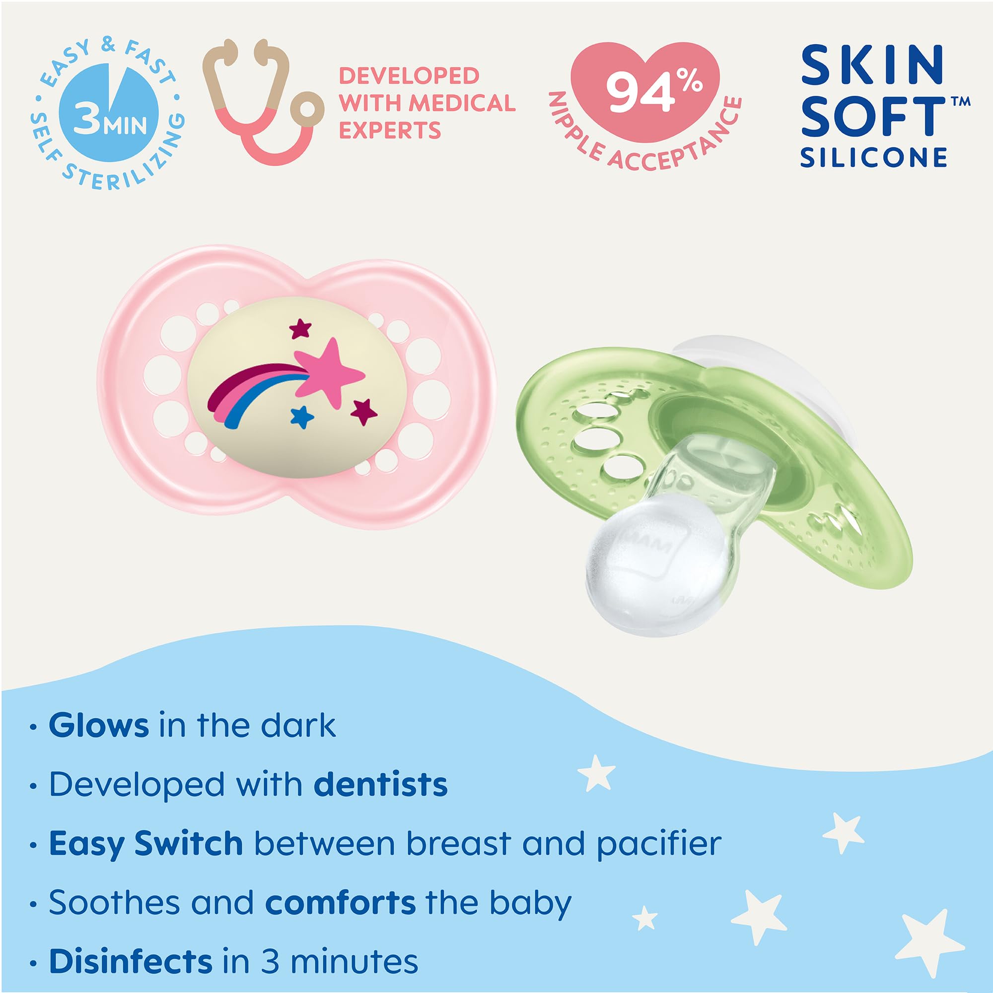 SILICONE NIPPLE: The BPA-free silicone boy and girl pacifier has the signature MAM design, with silky SkinSoft material and a symmetrical shape that's ideal for jaw and teeth development.