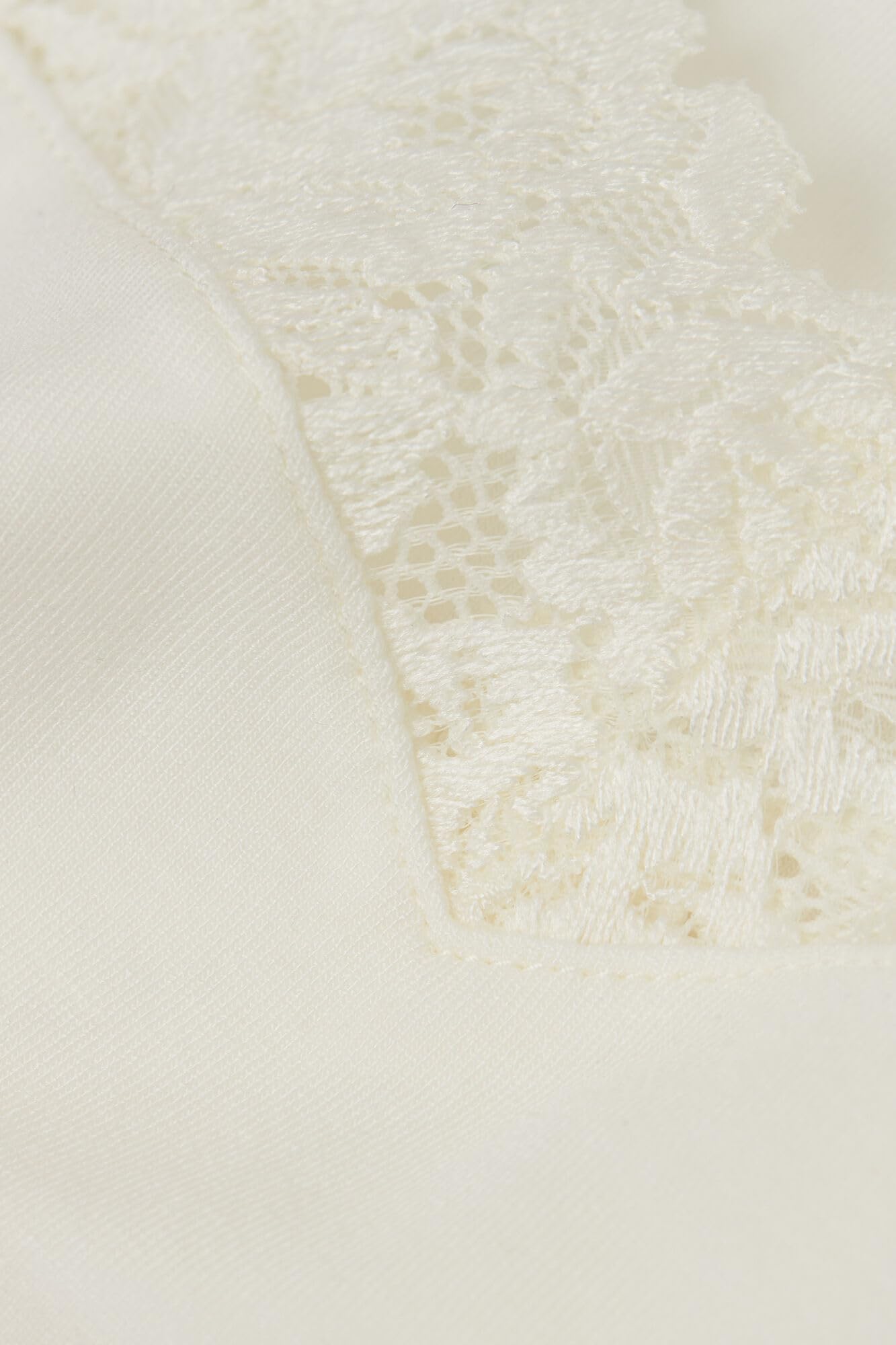 Description V-neck top made in modal and embellished with a lace ruffle. Based on the color chosen, the lace can be of contrast color or tone-on-tone. Thin straps lined in micromodal. The model is 5’ 9” (175 cm) tall and is wearing a size S. This garment contains a plant-based modal thread derived from sustainable and renewable wood sources.
