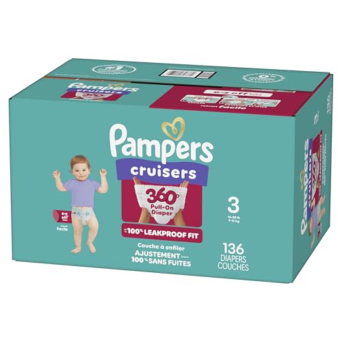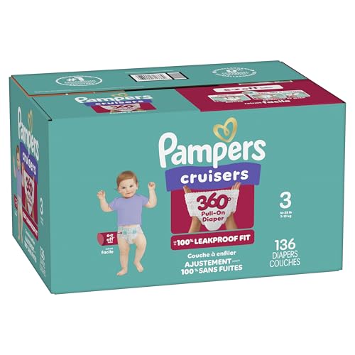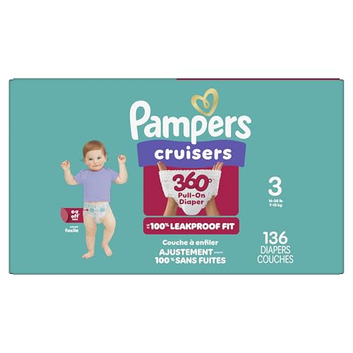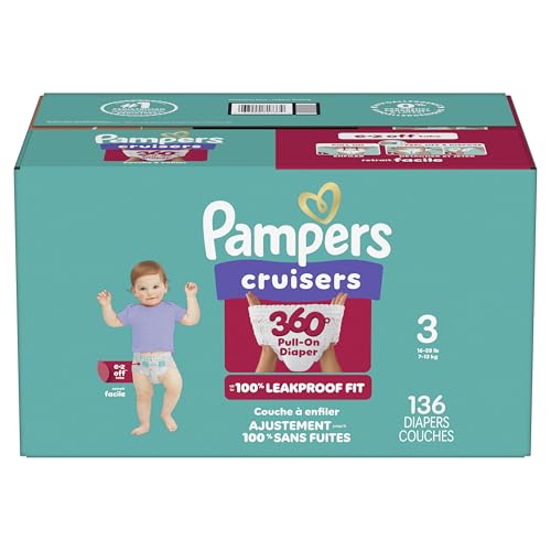Pampers Cruisers 360 pull-on baby diapers provide our best fit and protection for your active baby at any stage. Unlike ordinary disposable diapers that gap in the back, Pampers Cruisers 360 diapers stretch comfortably around your baby's waist and adapt to their every move for a flexible, Babyproof and gap-free fit that is up to 100% leakproof. Plus, they feature our Dual Leak-Guard Barriers that gently seal around your baby's legs, where leaks happen most. And forget fiddling with ordinary diaper tapes! Pampers Cruisers 360 has a 360-degree stretchy waistband designed to quickly and easily pull up onto your wiggly baby. Easy for you to pull on and take off but difficult to remove for your baby. And when a diaper change is complete, we've made disposal simple. All you need to do is RIP the Easy-Tear Side, ROLL up the diaper, then secure it with the disposal tape that comes attached to the back. Simple as that. Also, to keep your baby's delicate skin healthy, Pampers Cruisers 360 delivers breathable dryness, pulling out wetness and locking it away from skin using our exclusive LockAway Channels. Plus, Cruisers 360 is hypoallergenic and completely free of elemental chlorine bleaching, parabens and latex.** * For trusted protection, trust Pampers to help keep your little one happy and comfy on-the-go, the #1 pediatrician recommended brand. **No Natural rubber