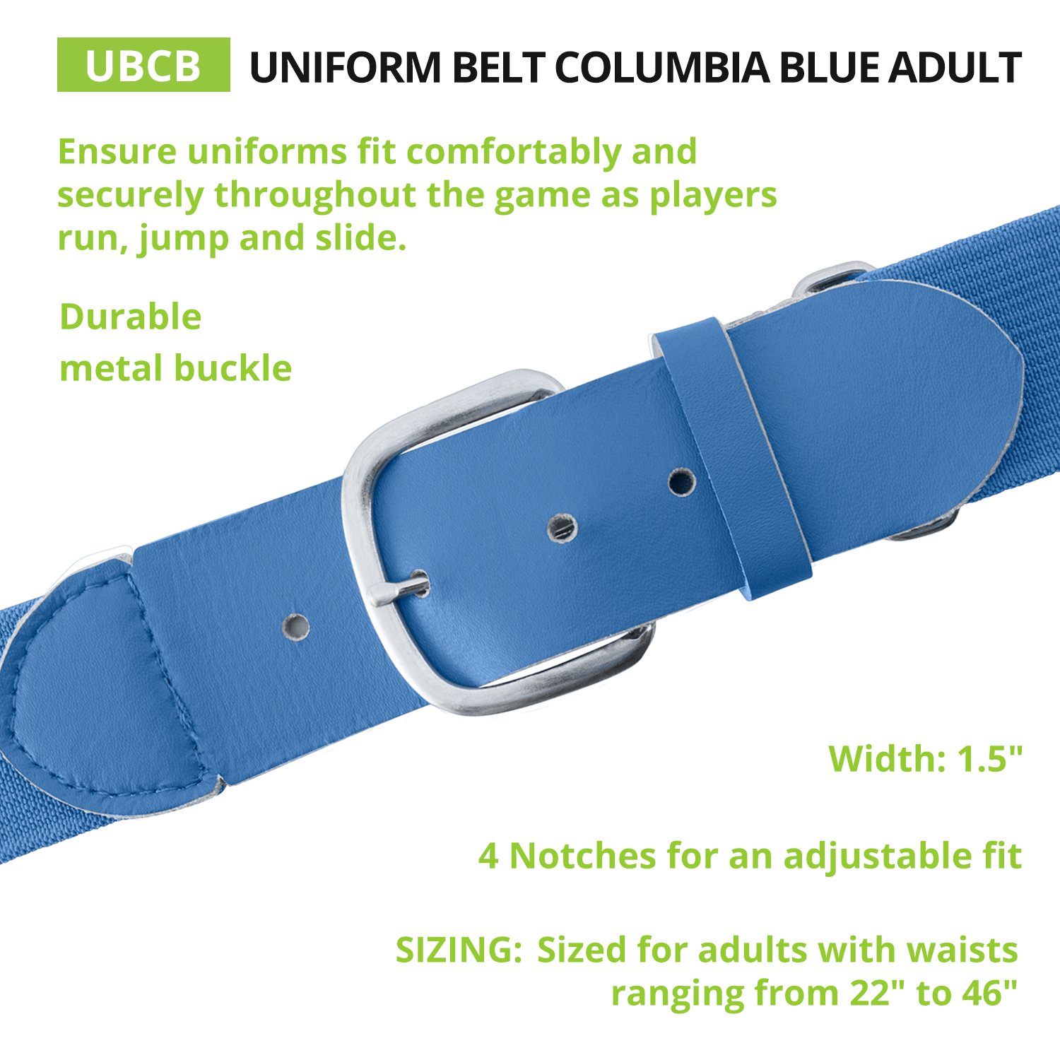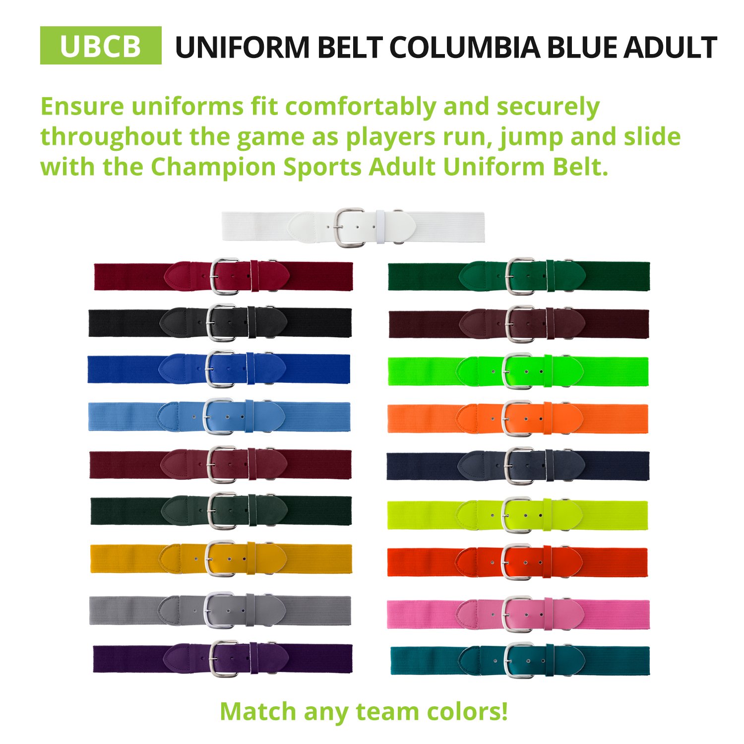 Ensure your uniform stays put with the Champion Sports Uniform Belt. Designed for versatility, this belt features an adjustable elastic band that stretches to fit youth and adult waists. A sturdy metal buckle and leather tab offer lasting durability, while the 1.5" width provides a clean, professional look. Choose from a wide range of colors to perfectly match your team's uniform.