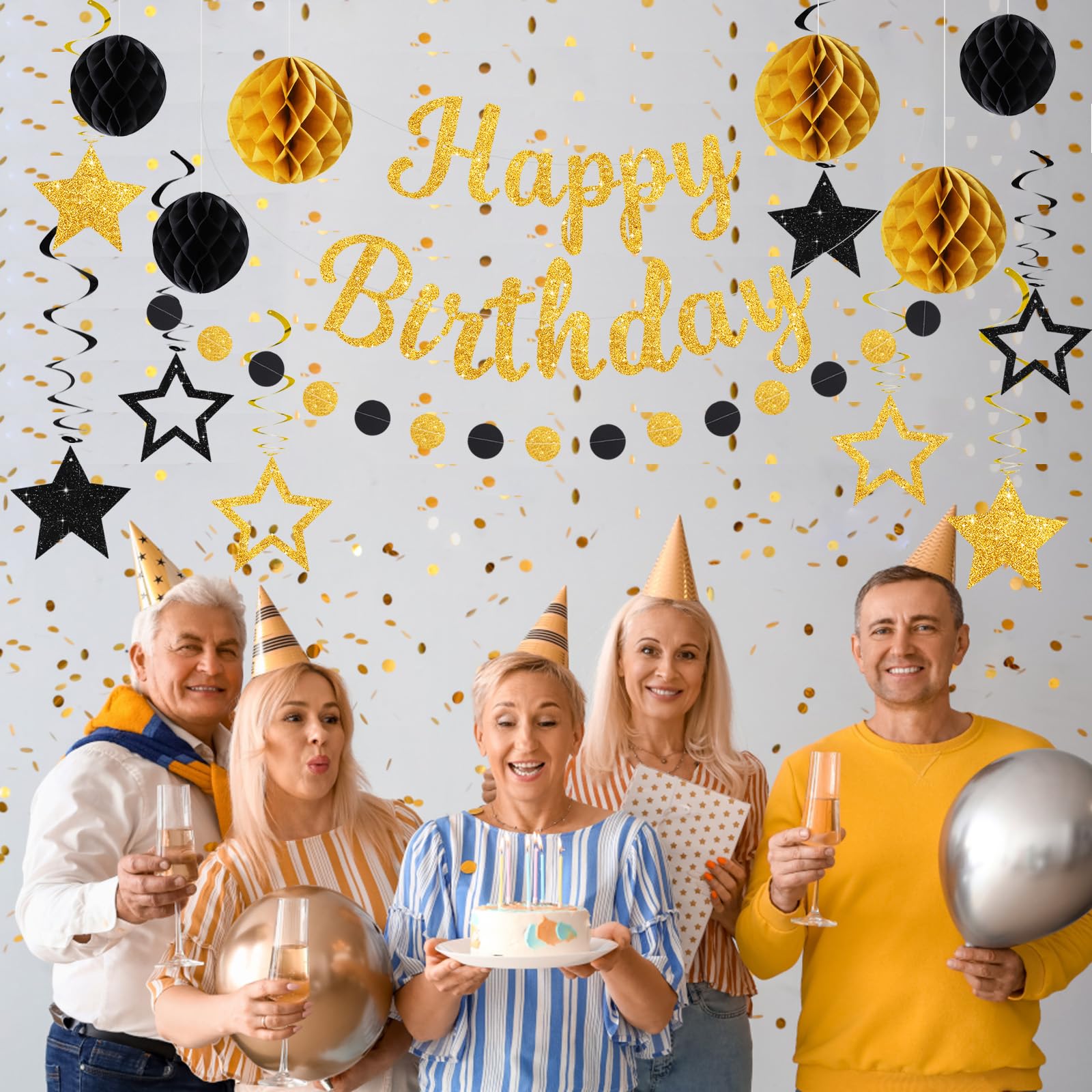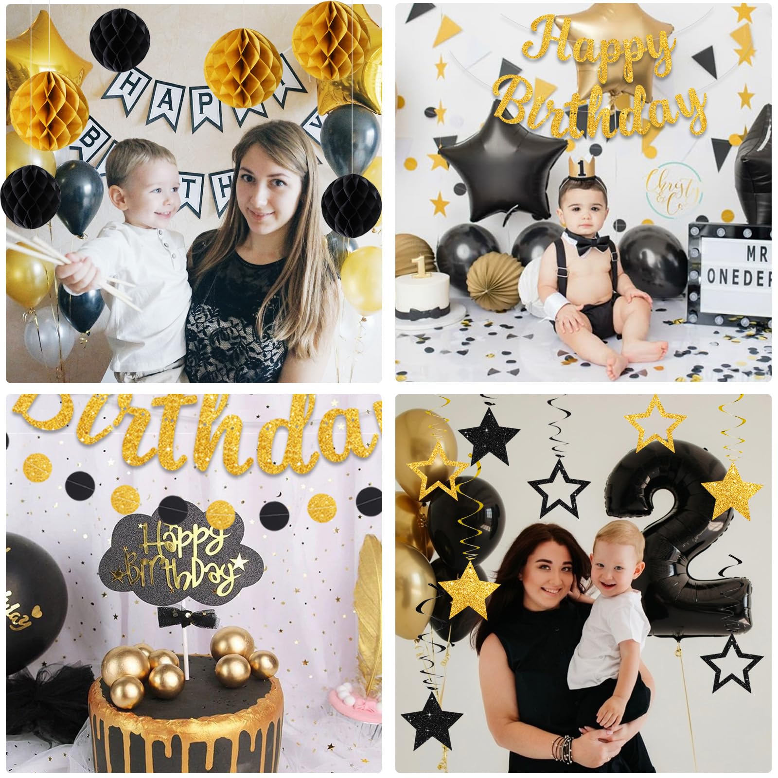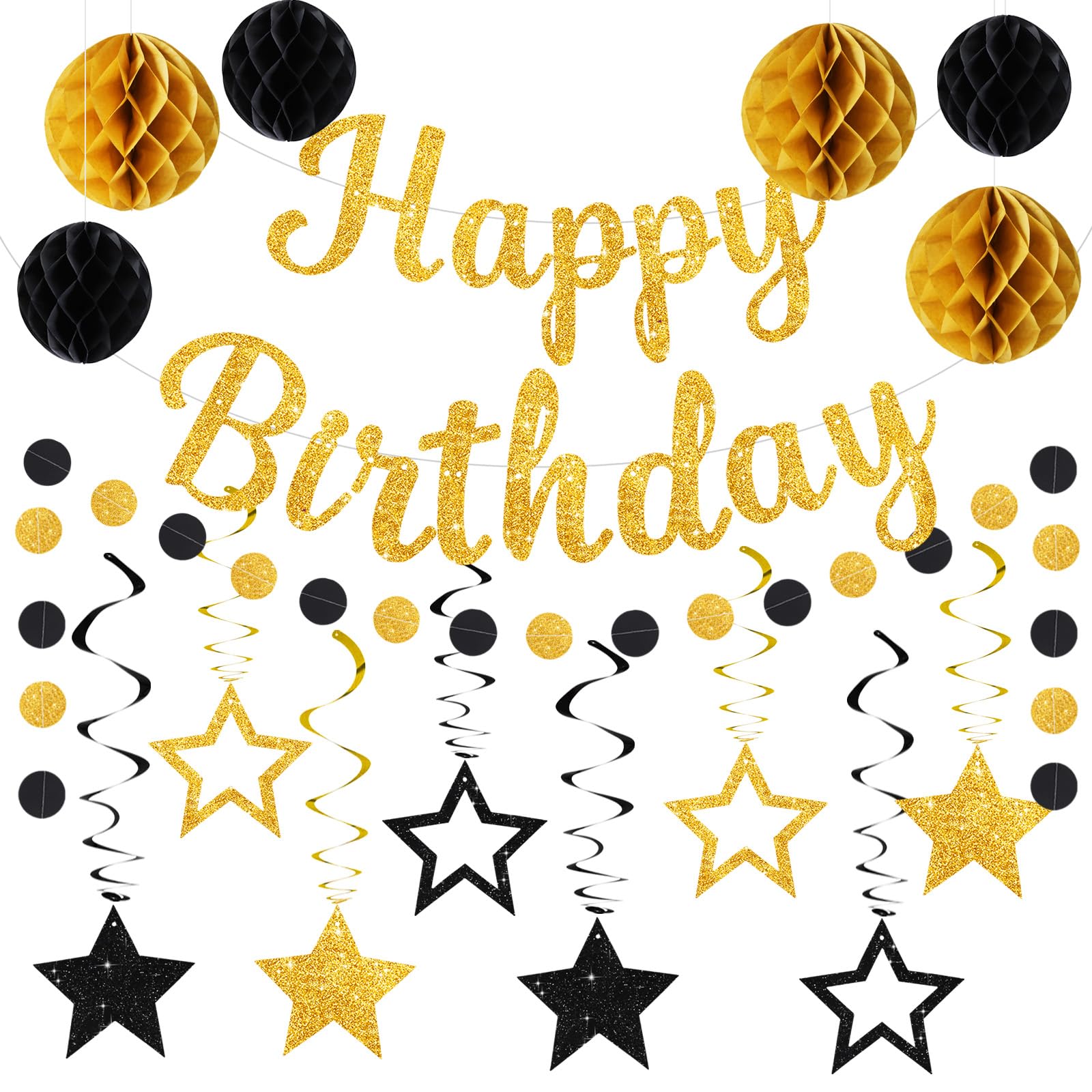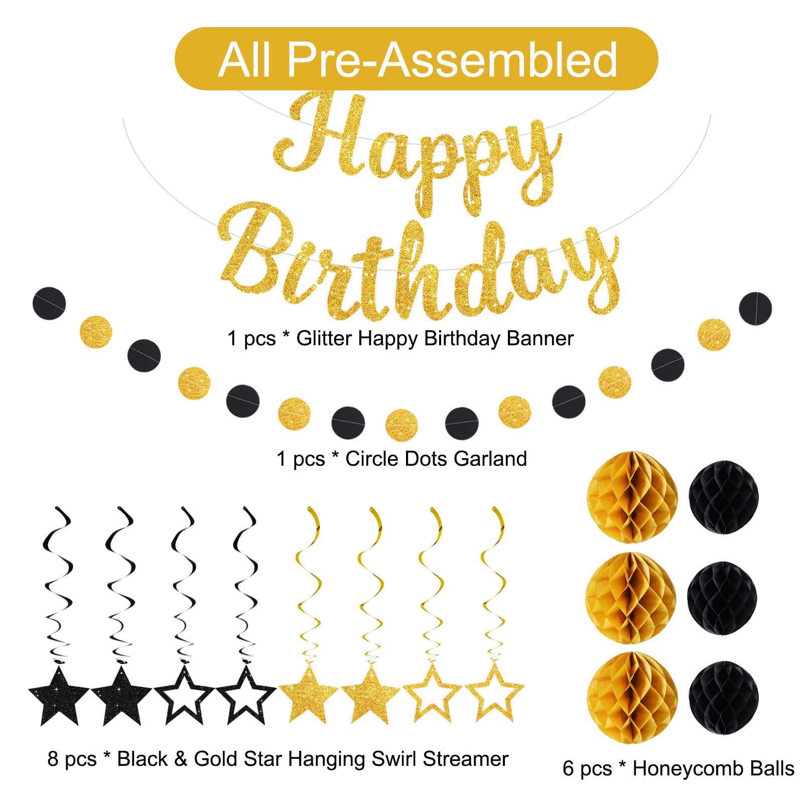 【Product name】Glitter Black Gold Happy Birthday Banner with Honeycomb Balls,Circle Dot Garland Hanging Swirls 【Product includes】(No Assembly Required) △ 1pcs Pre-Strung Happy Birthday Banner △6pcs Honeycomb Balls △8pcs Hanging Swirls Streamers △1pcs Circle Dots garland shiny color and beautiful design can decorate your party well. 【Product design】Special design △ Glitter style — bringing you a lot of pleasant visual enjoyment. △ Beautiful designs — perfect for many party decorations. 【High quality】High quality material △ Reusable —lightweight and easy to store for the next time using. △ Time saving— Everything is Pre-strung, that means NO DIY required! It is ready to hang, and it is very convenient. 【Great role】 △ Eyecatching — Party Decorations are perfect for the Special Someone Celebrating Their Big Day By Adding Color to their Event. △Impressive — Our Decorations are nice for your party,it will make your party very charming and dreamy. △ Wide applications — You can add to mantels, banisters, windows, dessert tables, or even use as a photo backdrop on your party.