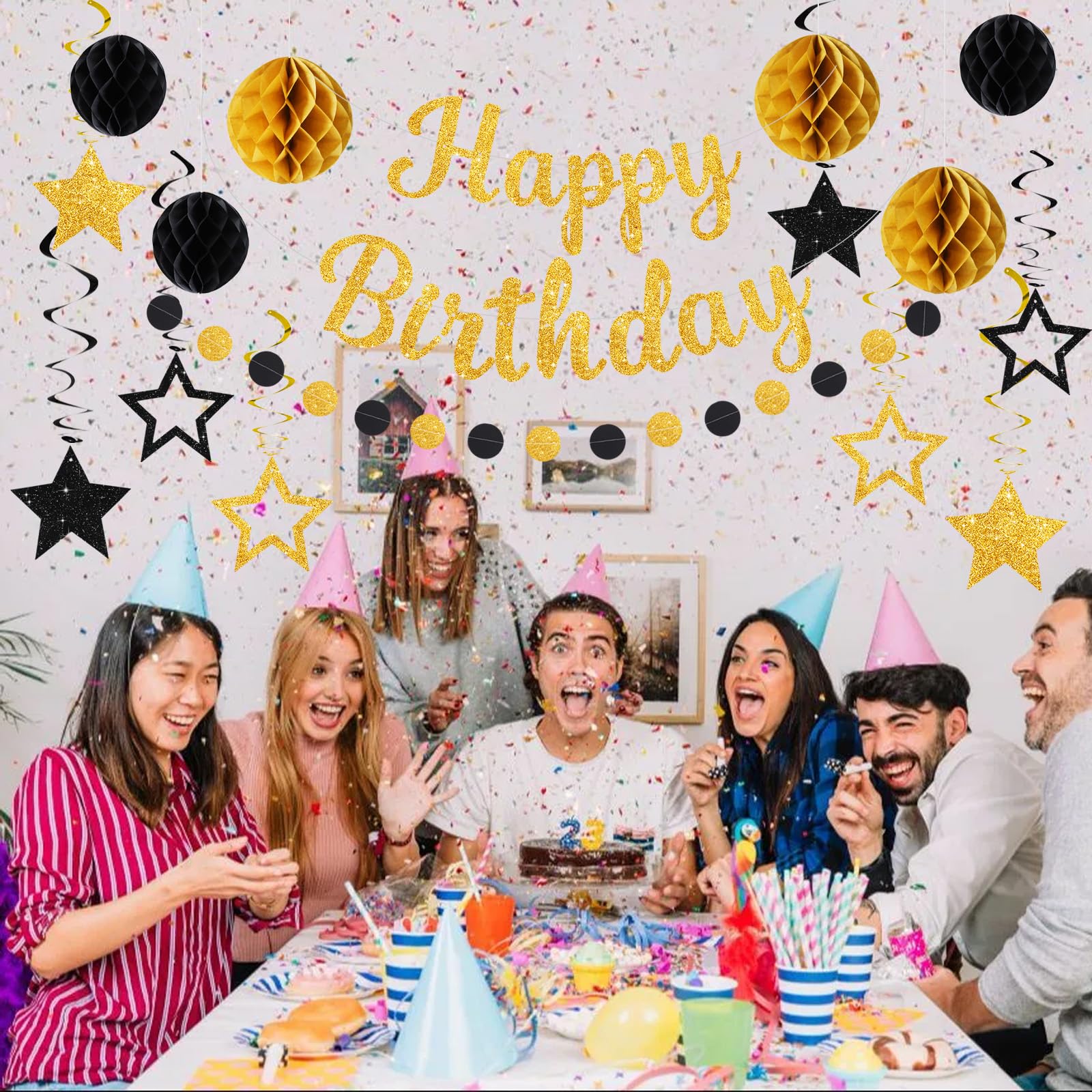 【What you will get】 1pcs Glitter Pre-Strung Happy Birthday Banner, 6pcs Honeycomb Balls, 8pcs Hanging Swirls Streamers, and 1pcs Circle Dots garland, shiny color and beautiful design can decorate your party well.
