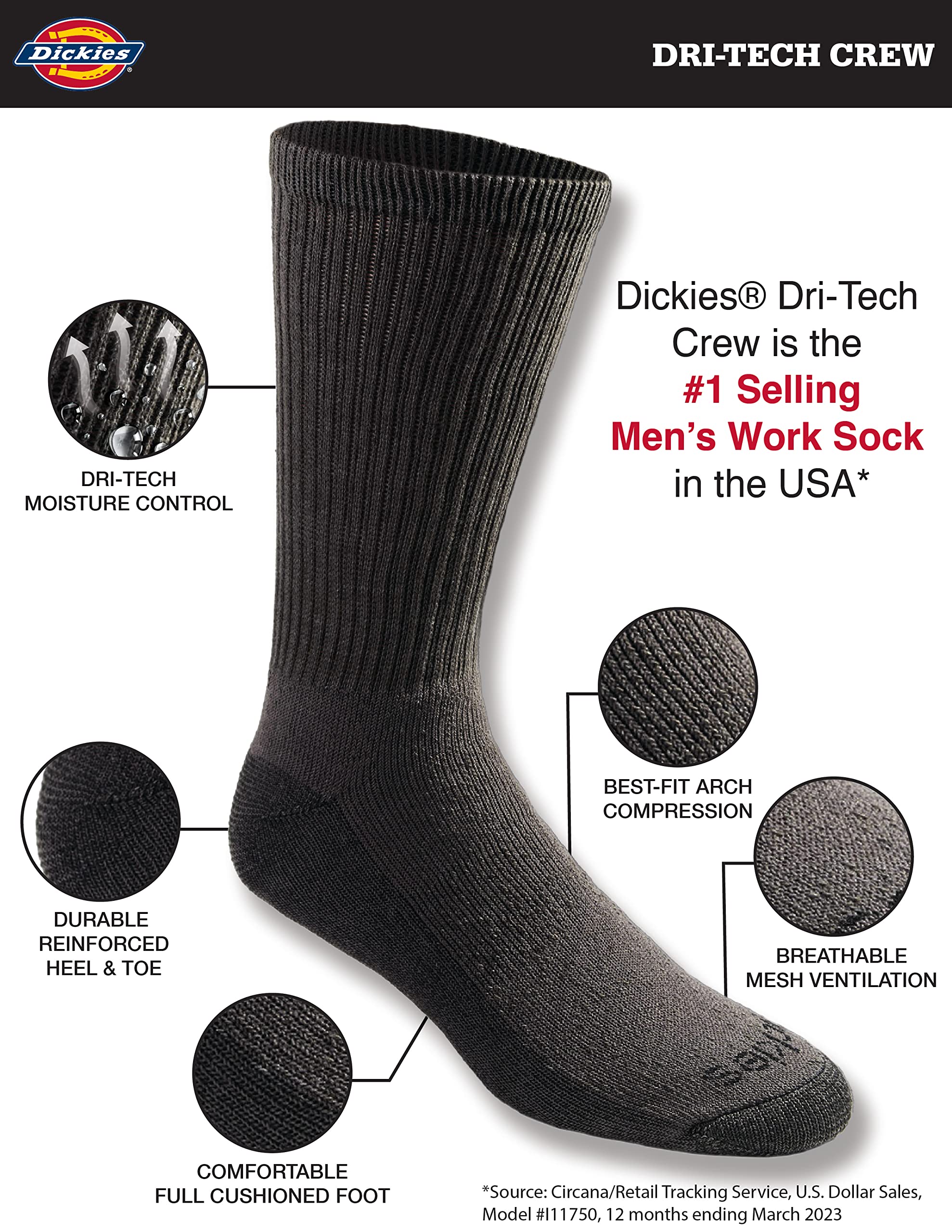 Description Dickies dri-tech comfort 6 Pairs crew with wicking, moisture management fibers keeps feet dry, ventilation channels engineered for air circulation and moisture control, arch compression hugs feet and keeps socks in place, while providing in-step support, Reciprocated heel and toe for superior fit and full cushion comfort