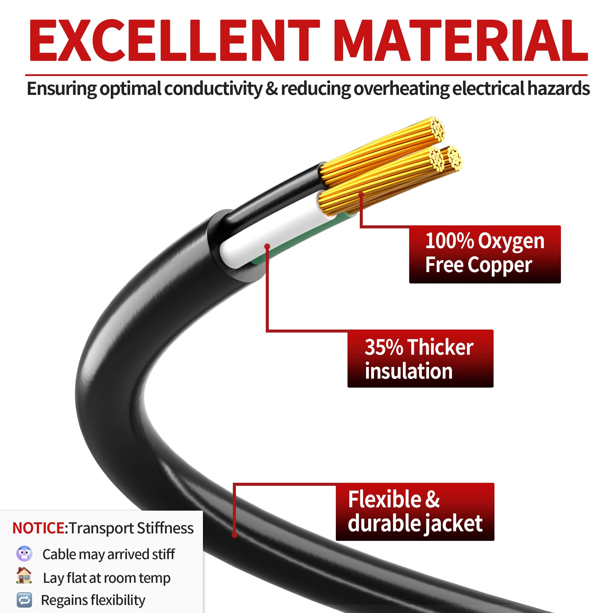 Durable Construction: Black outdoor extension cord are made of 3 strands of pure copper core with thicker insulation in the middle and IP65 vinyl outer jacket; The pins of the extension cord 15 ft male plug are made of special material that will not rust or corrode; The vinyl outer jacket is flame retardant, IP65 waterproof, -58°F cold and corrosion resistant; 15 ft extension cord length is equivalent to an SUV, easily covering the distance from the corner of a wall to the center of a room