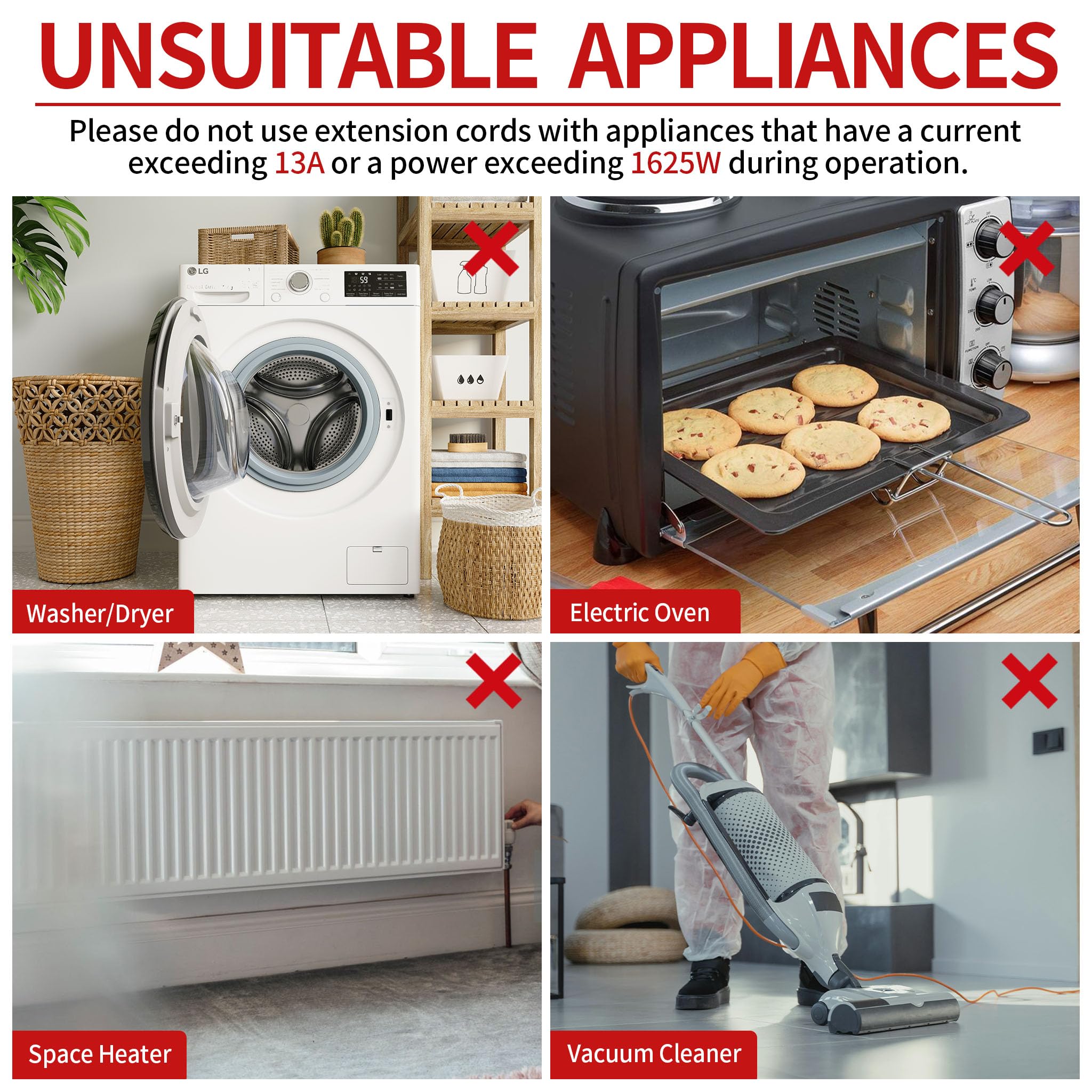 Versatile and Convenient: 15' extension cord Whether working outdoors on garden lawn, installing outdoor lighting or using power tools; Indoors electric appliance and in your personal craft studio using power tools black extension cord outdoor will provide the convenience and practicality you need; do not use extension cords with devices rated for more than 13A 125V current or 1625W power