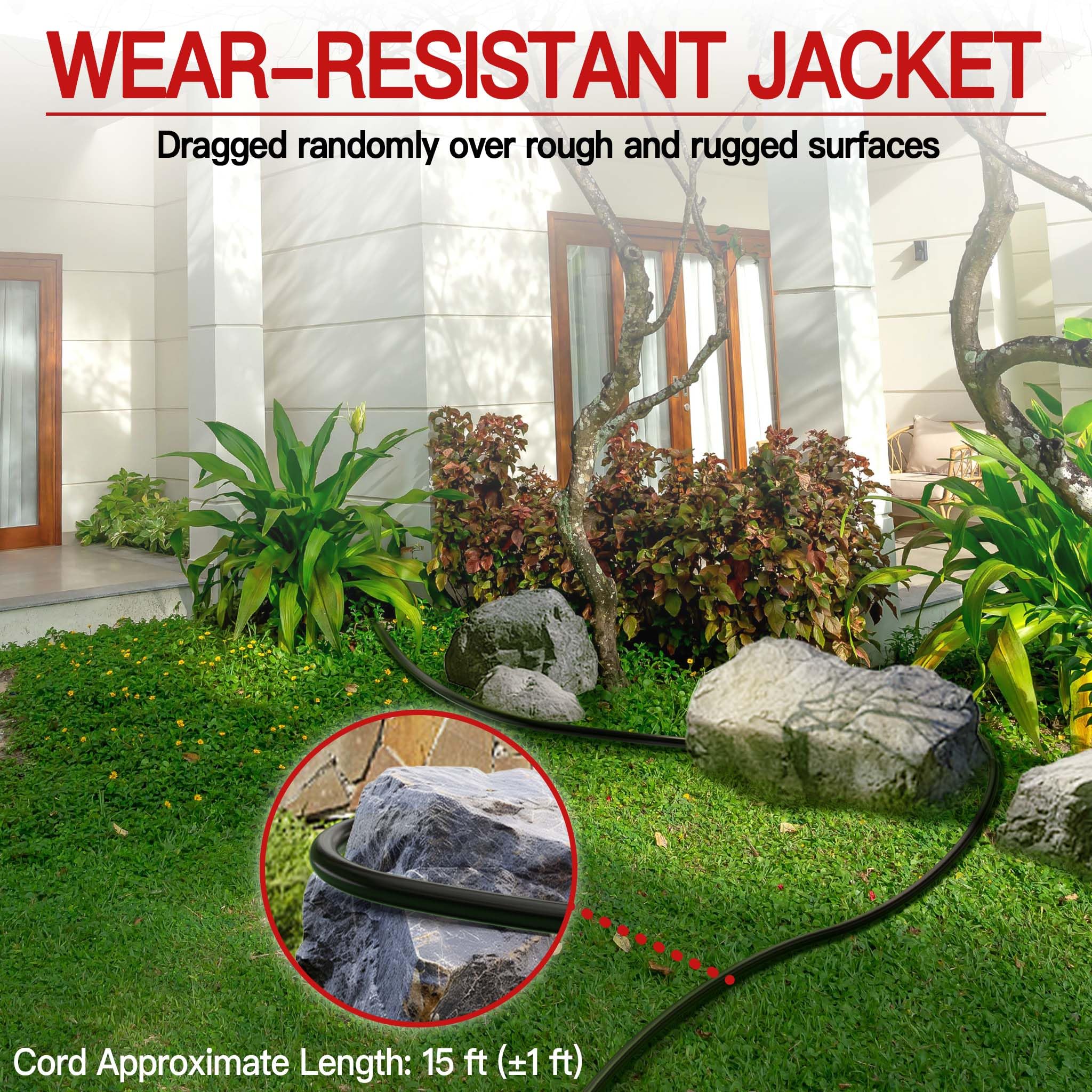 Weatherproof & Abrasion-resistant: 15ft extension cord designed to withstand the elements; 15 foot extension cord is waterproof and weatherproof; Confidently use black extension cord outside without worrying about damage caused by wind, sun UV,rain, snow, or extreme temperatures; It's abrasion-resistant to combat drag when you're on rough and rugged surfaces