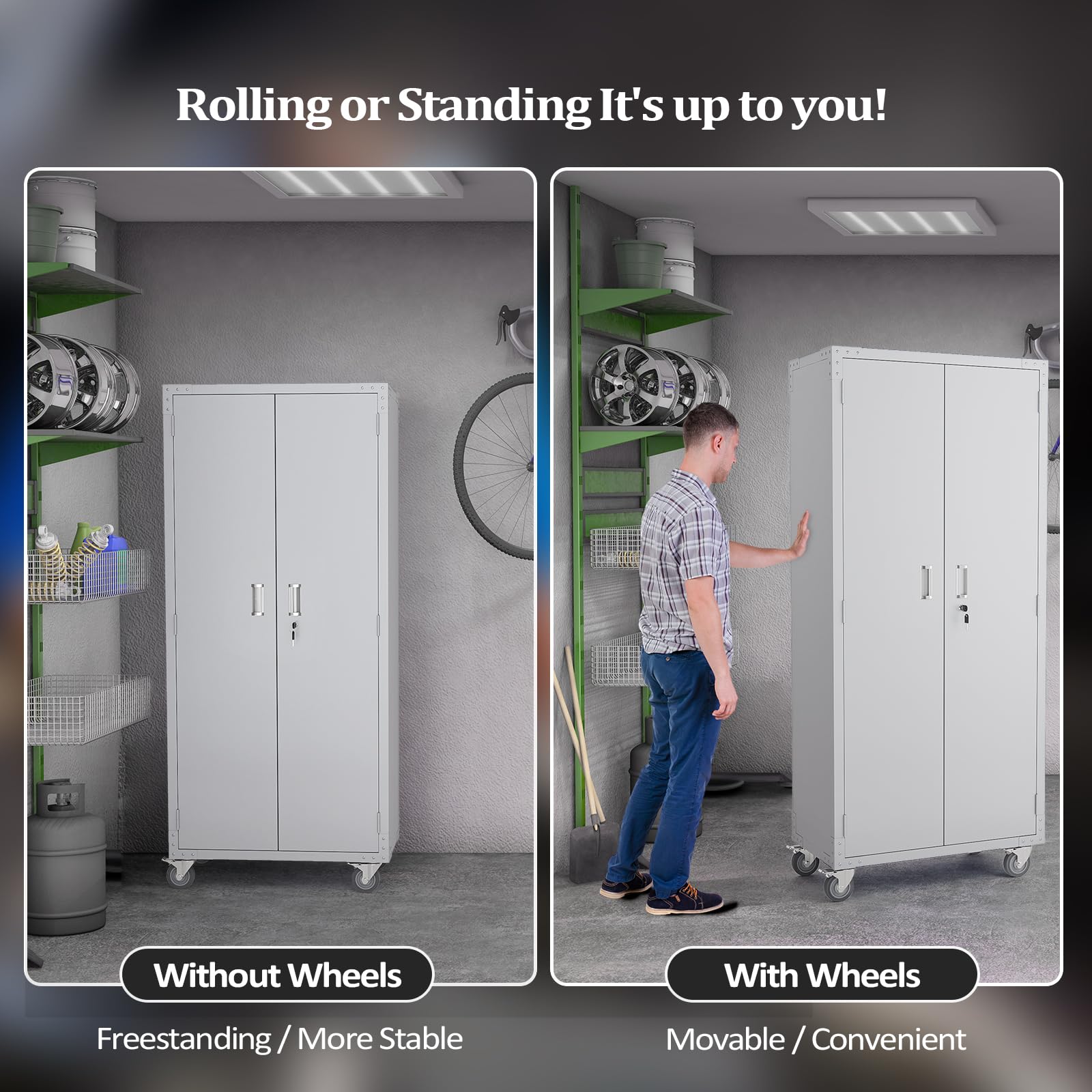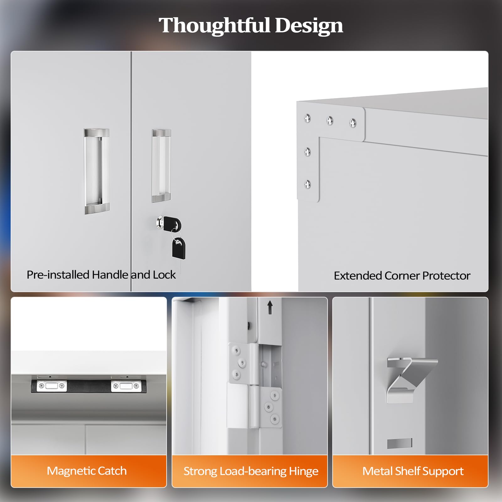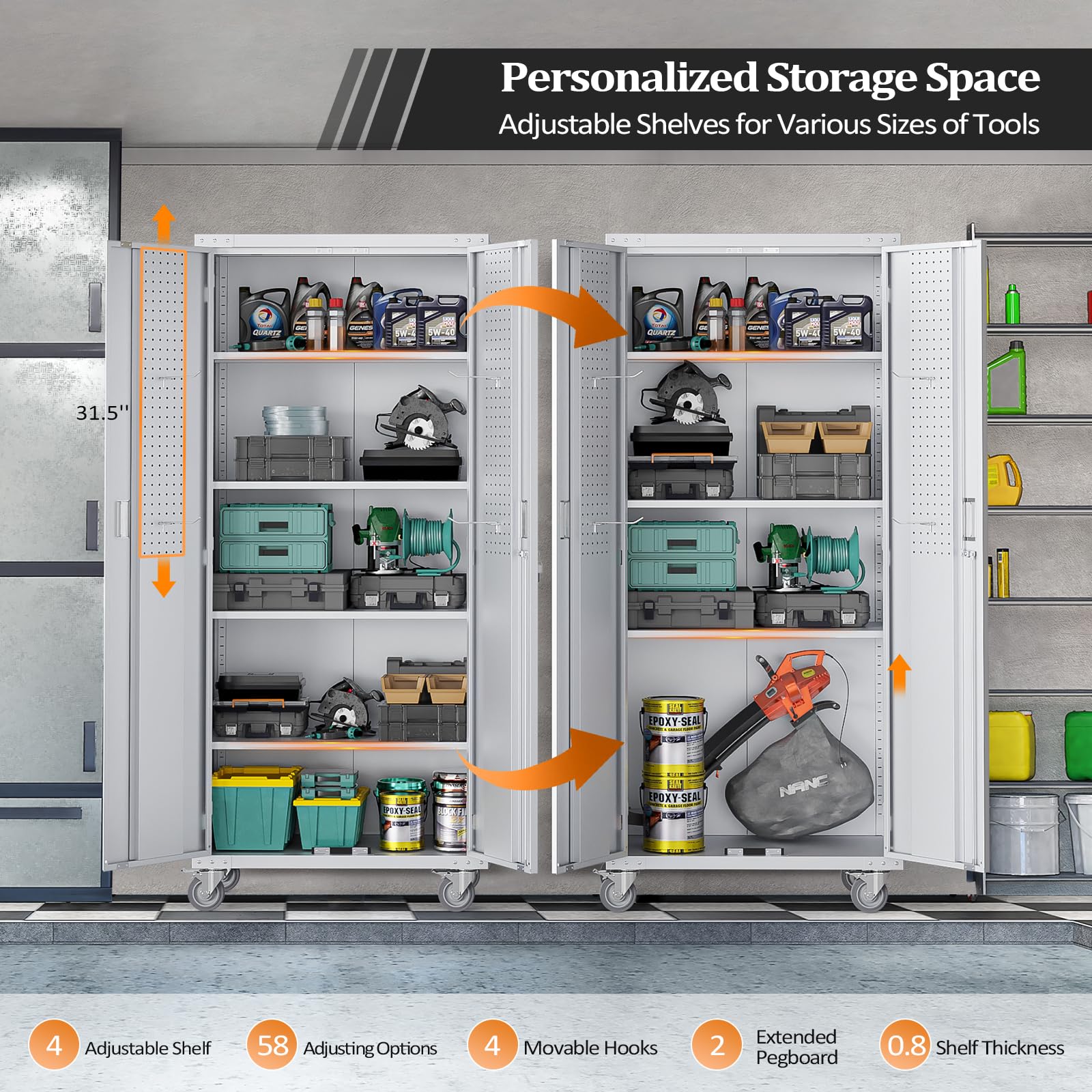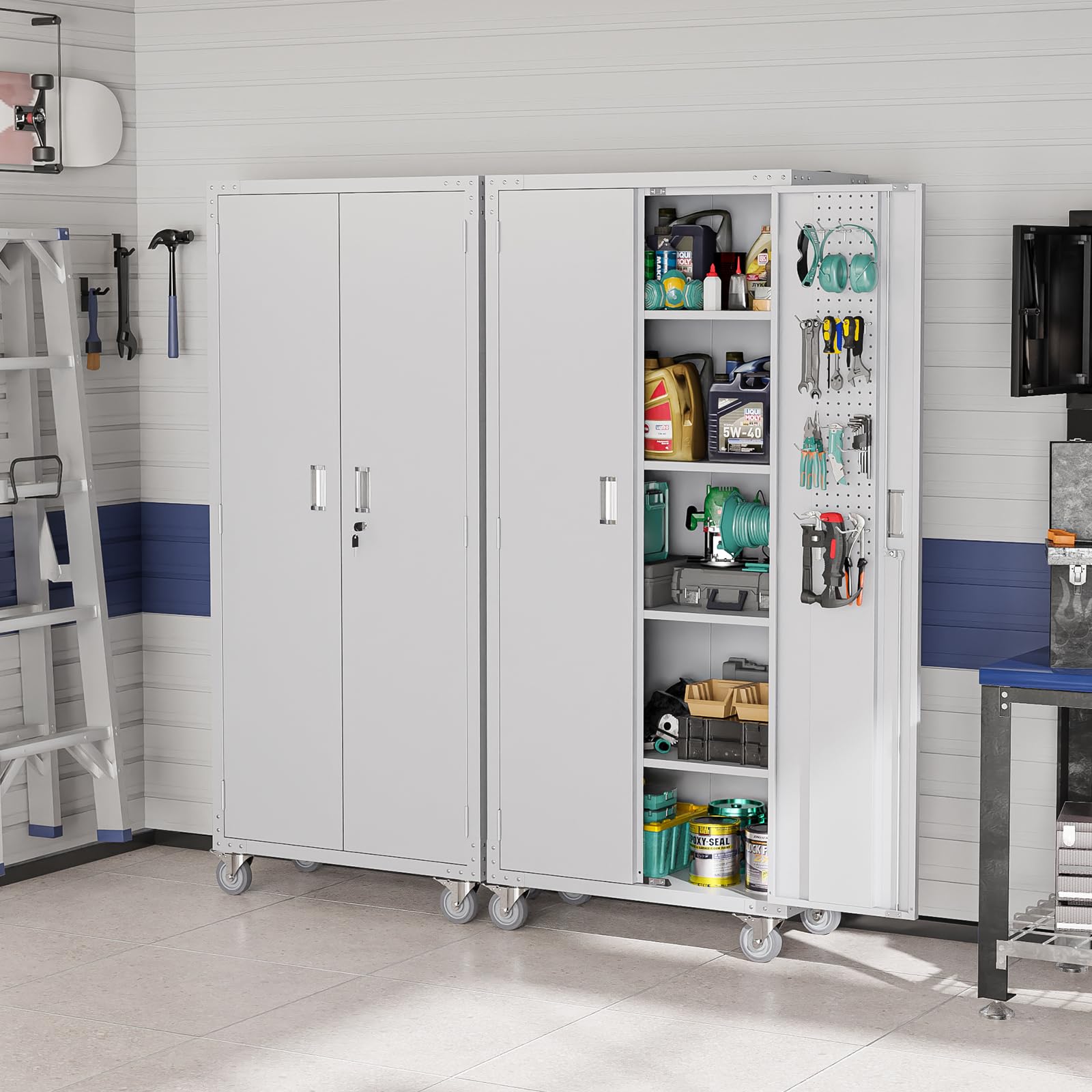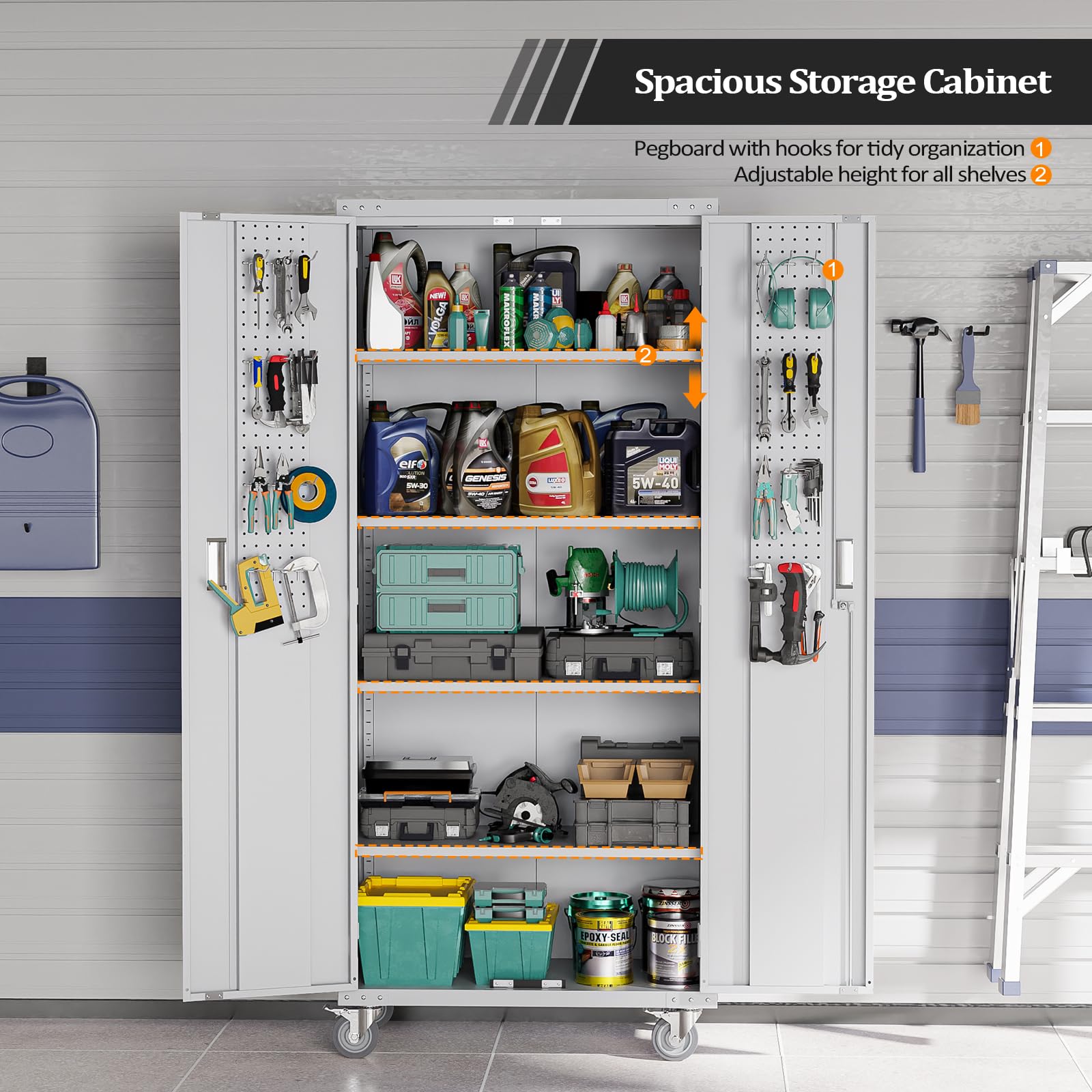 【Multi-functional Lockable Doors】VINGLI metal cabinet has lockable doors with 2 keys, which will keep all your belongings secured. The extra built-in pegboards with hooks are helpful to declutter your garage tools or office sundries. The locking handles and magnet devices are friendly to users