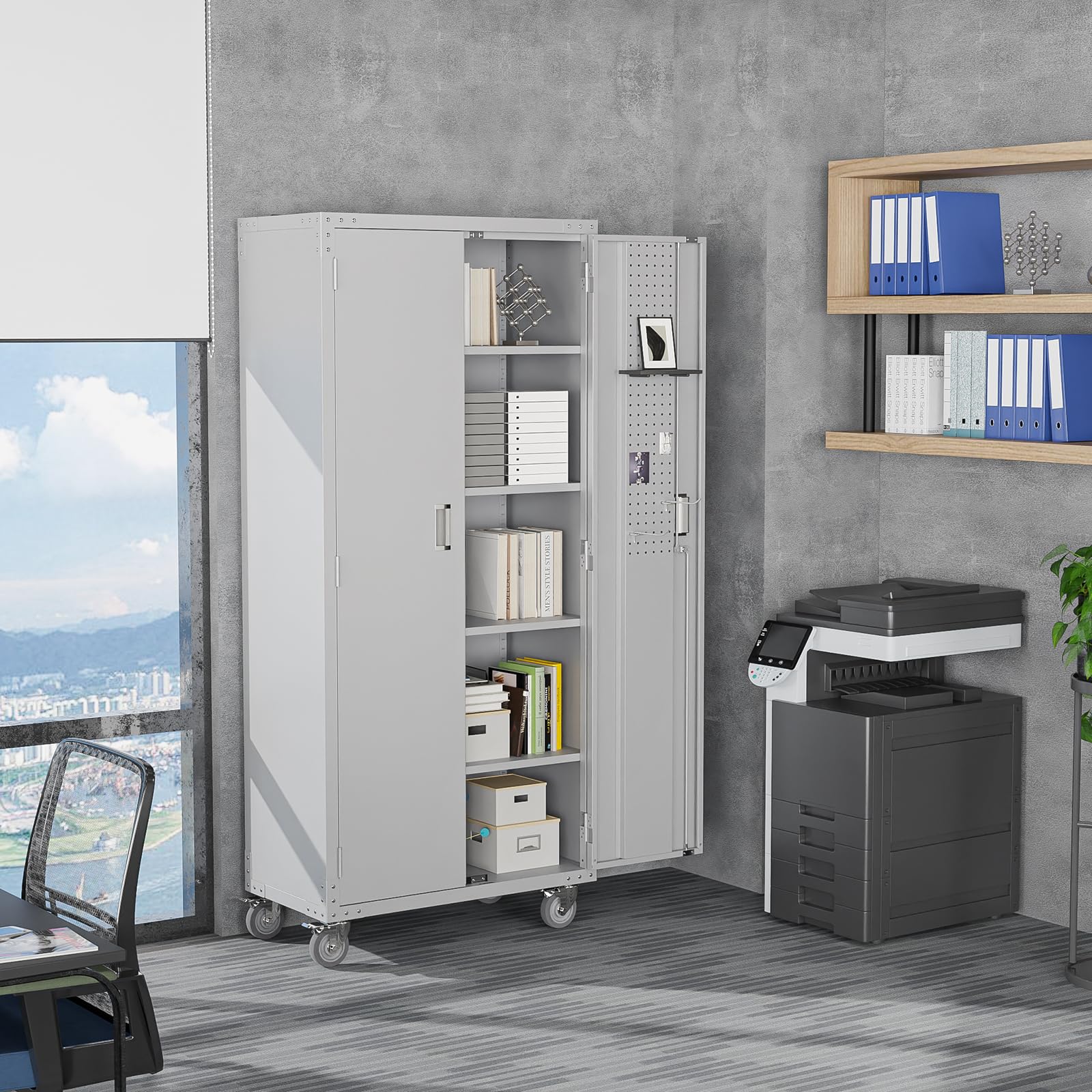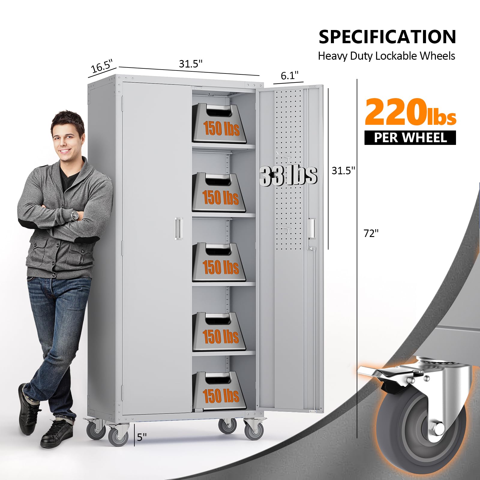 【Excellent Load-bearing Capacity】With a strong and durable metal frame, this steel storage cabinet allows you to store heavy garage instruments up tp 150lbs per shelves(750lbs in total). It is perfect for office, garage, gym, workshop, classroom, utility room, etc.