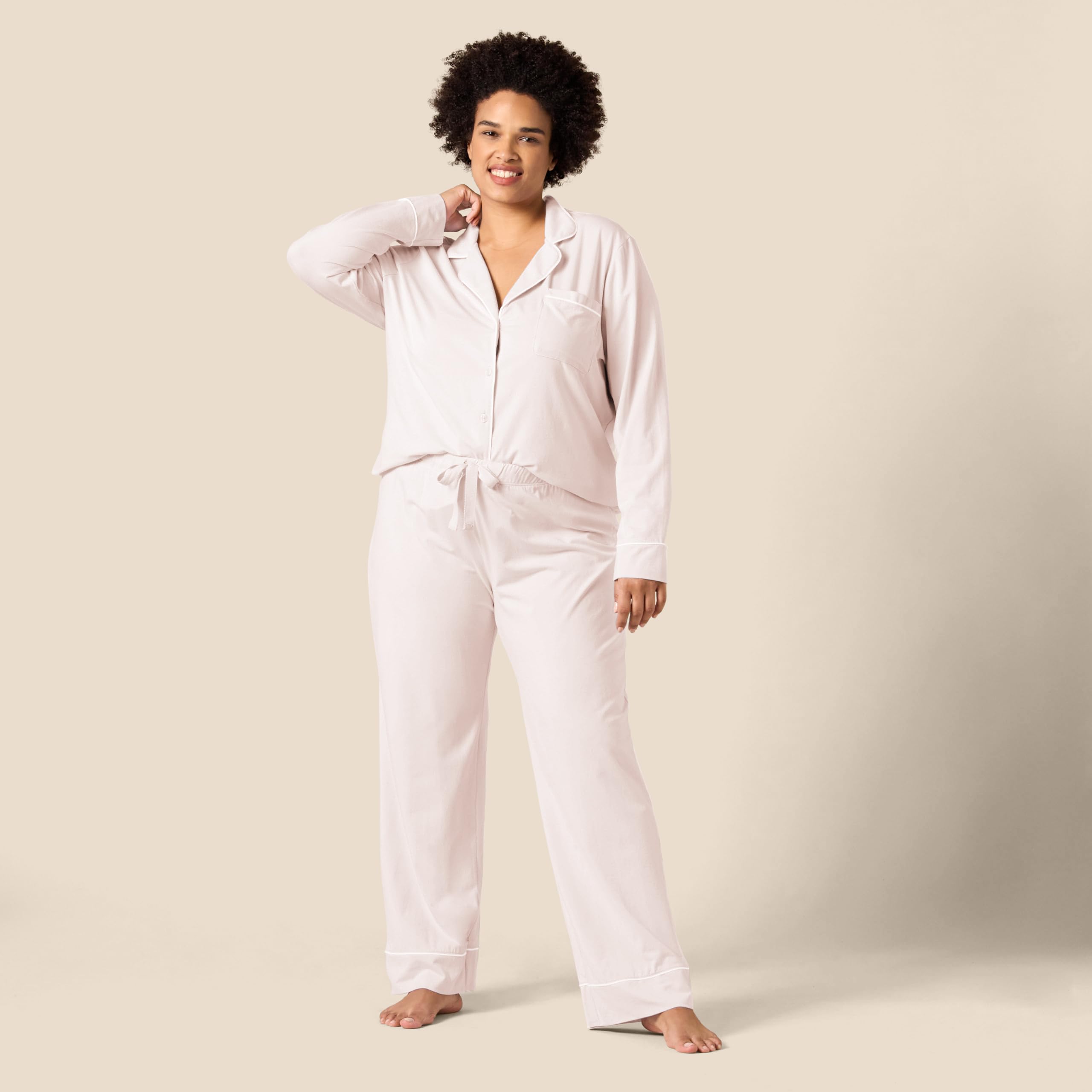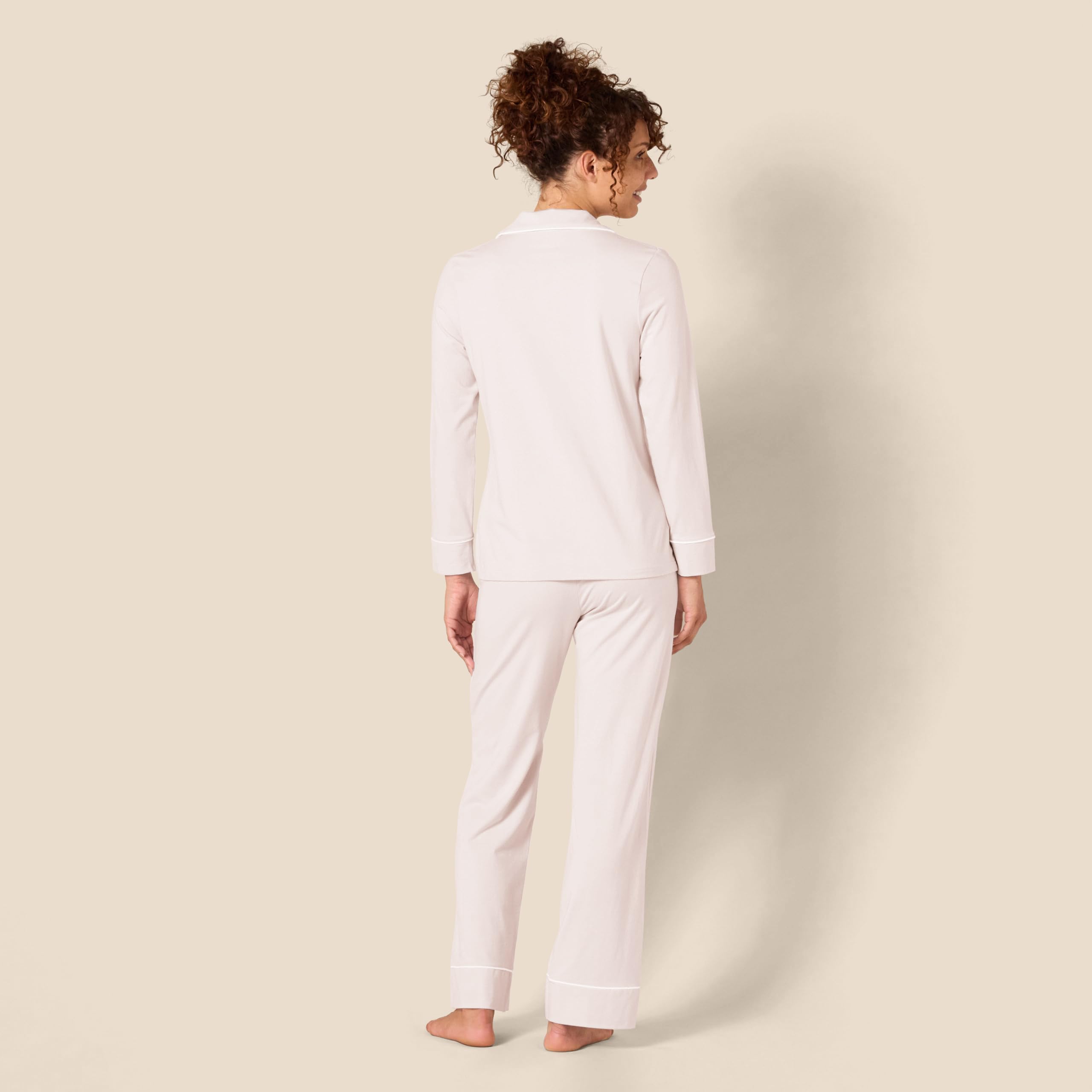 DETAILS: This set features a button-front long sleeve top with classic notch collar and single patch pocket. The pant is designed with an elasticated waistband with adjustable tie waist. Modern framing with delicate contrast piping at sleeve and leg cuffs.