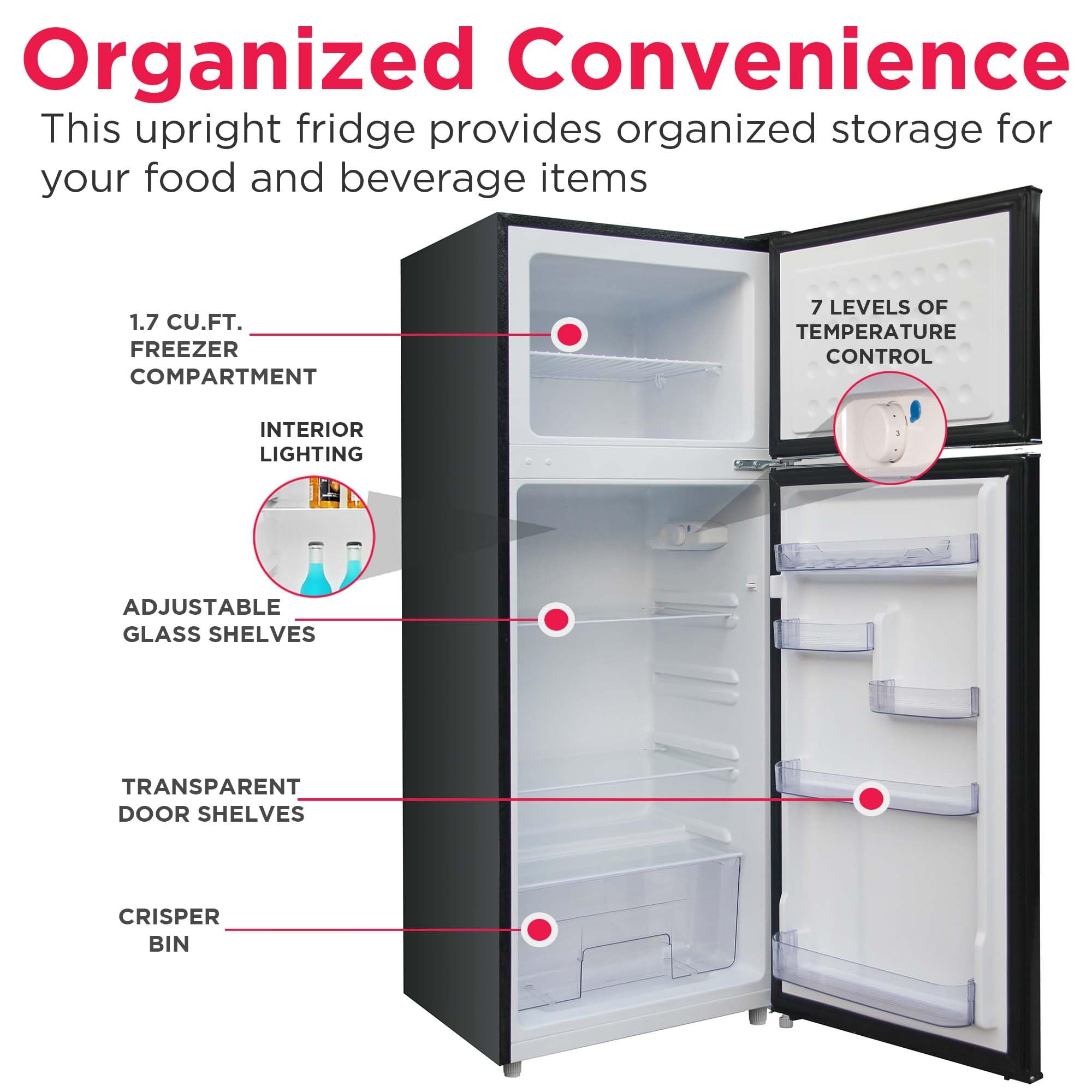 Organized Convenience - Equipped with removable glass shelves, a transparent crisper, and a full-width door bin, this small upright fridge offers organized and convenient storage for all your food and beverage items.