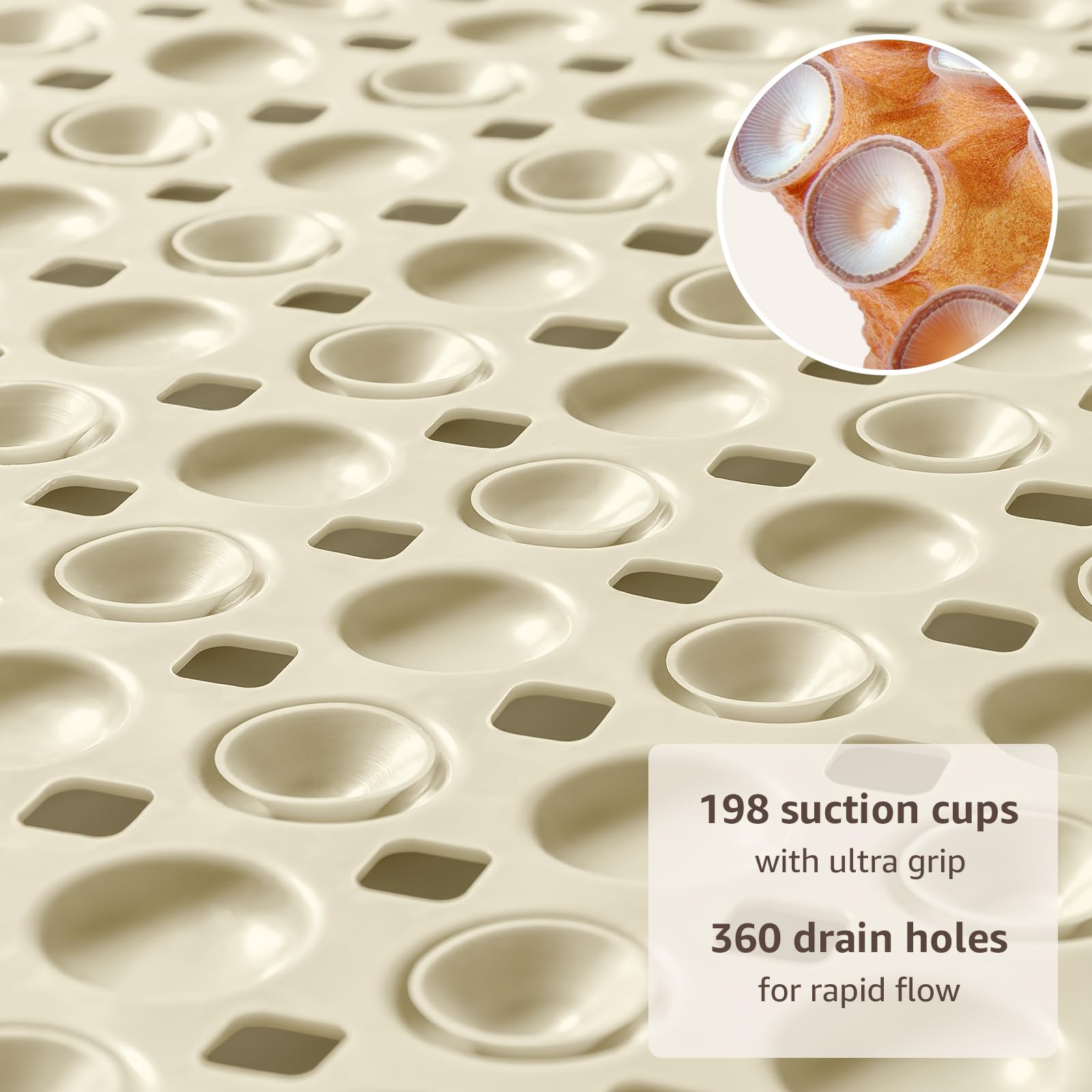 198 SUCTION CUPS Ultra Grip: 198 high-density suction cups lock this non-slip bathtub mat to tub and shower floors, eliminating slips even when wet. Ideal for shower mats for inside shower safety