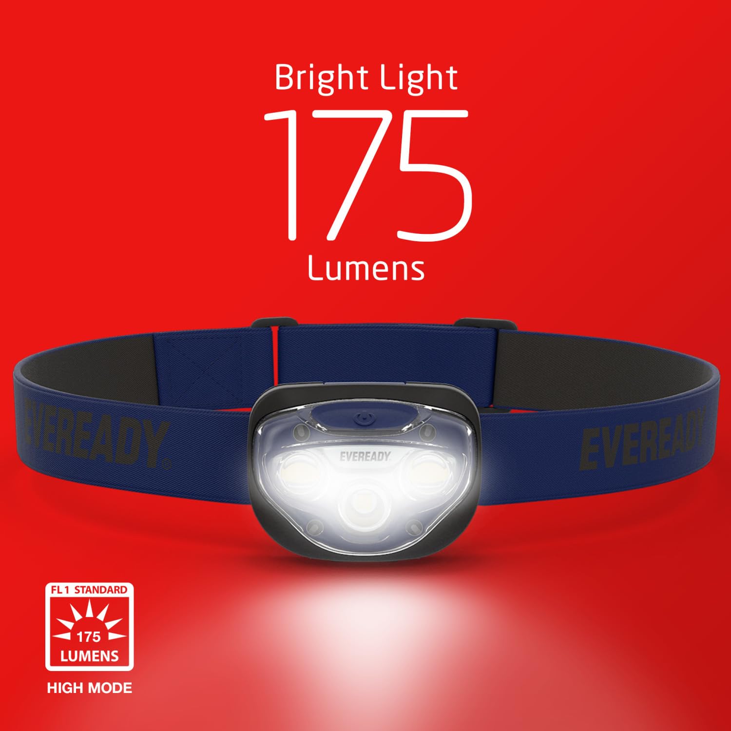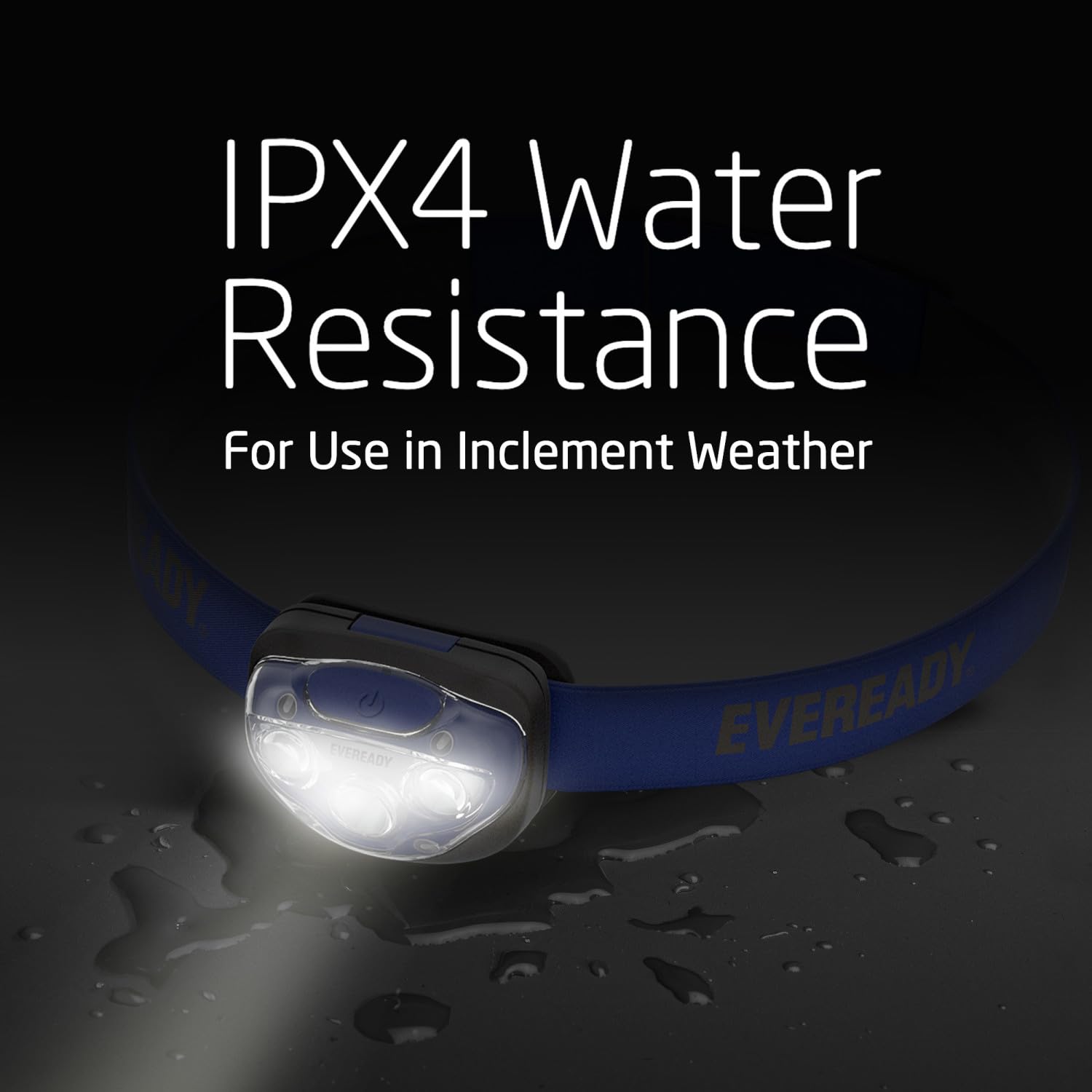 Keep your hands free with these Eveready LED Headlamp. This innovative indoor and outdoor light lets you use your hands while you work, making it a great lighting solution for work or outdoor adventures. Up to 4 times brighter than standard LED technology, this LED headlamp casts a 165-foot beam that lets you see far ahead. Powerful white LEDs provide excellent all-around coverage to work by, and modes for High and Low let you adjust the light intensity of the work headlamp to suit your task. A convenient push-button lets you toggle between modes. The ultralight headlamp has adjustable straps for comfortable wear, and the pivoting head lets you direct the beam to wherever you need bright, white light. A shatterproof lens, IPX4 water-resistance and impact-resistance ensure dependable use on work sites and outdoors. Always Trusted. Always Ready. EVEREADY.