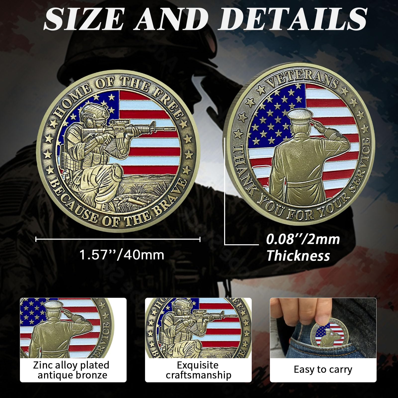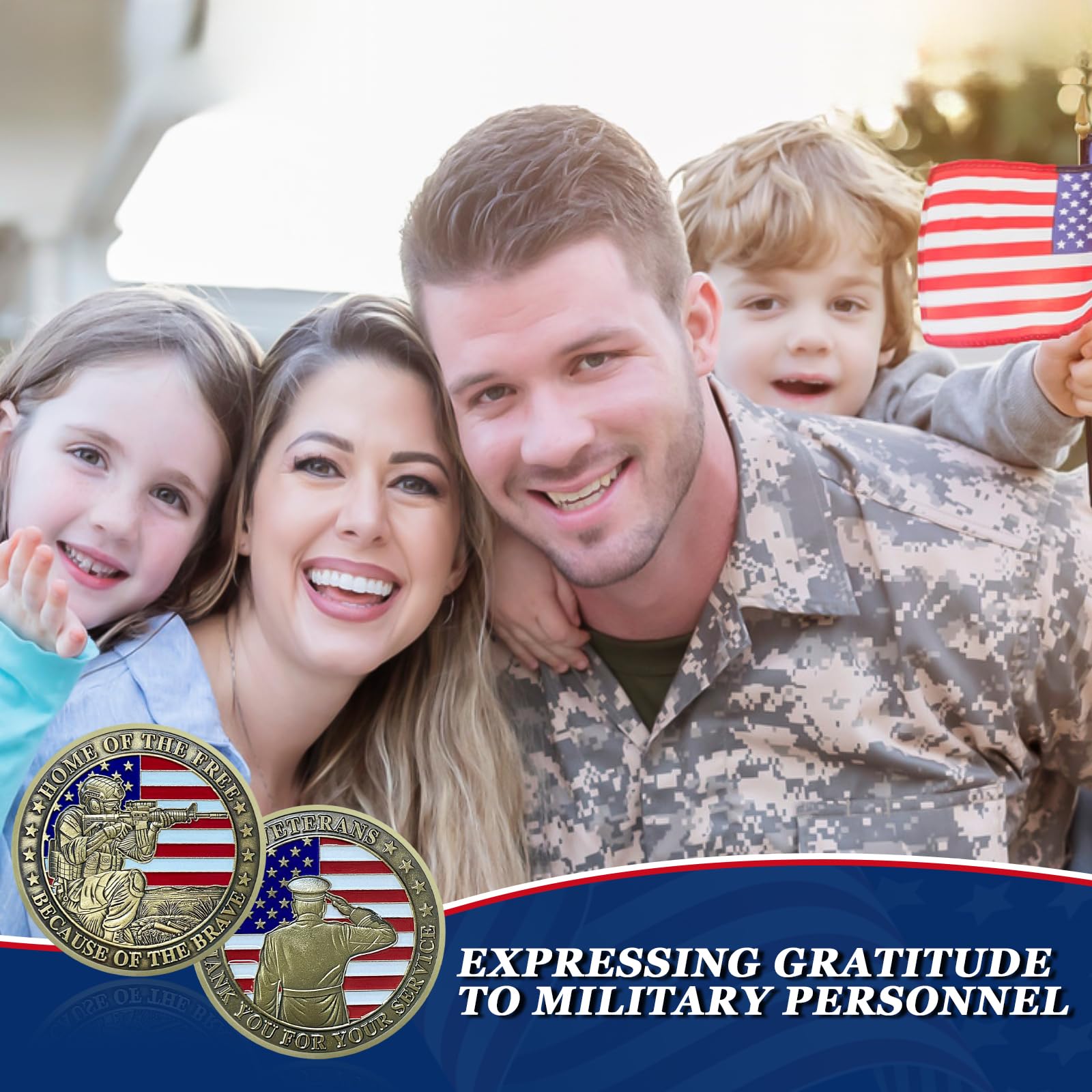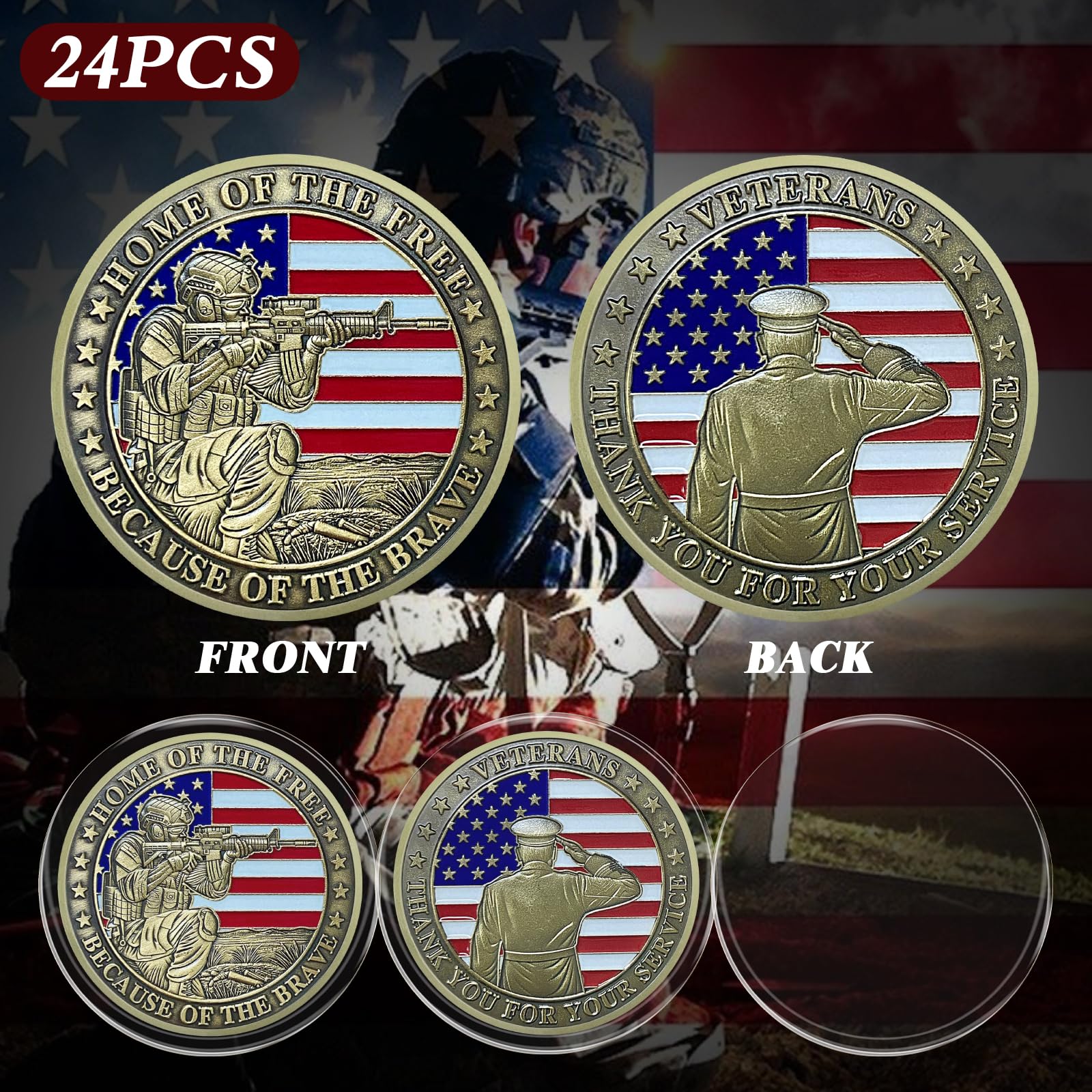 【Large Quantity for Your Use】Our Military Gift Set of 24 military challenge coins is perfect for honoring our brave service members. These military coins are crafted with exceptional skill. They are more than just tokens; they are a tangible expression of honor and gratitude. The phrase "Home of The Free Because of The Brave" powerfully conveys our tribute to the courage and dedication of those who protect and defend our nation
