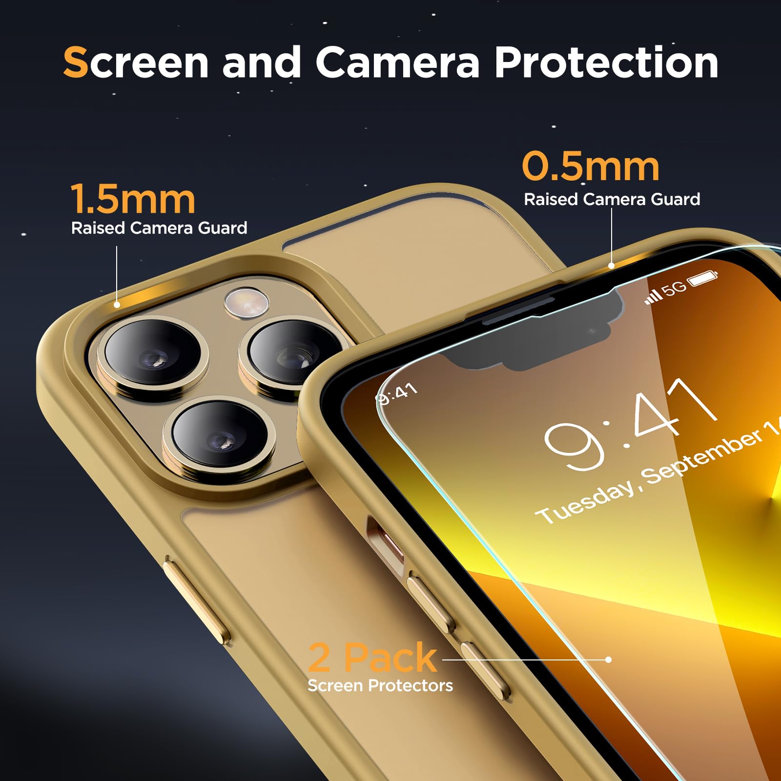 [Rugged Camera and Screen Protection]: This phone case for iPhone 13 Pro comes with 2 high-quality tempered glass screen protectors included in the package. The camera frame is raised by 1.5mm to safeguard the camera lens, preventing dust accumulation and preserving the camera's original performance. Additionally, the screen protectors effectively shield the screen from scratches, ensuring comprehensive protection for your phone.
