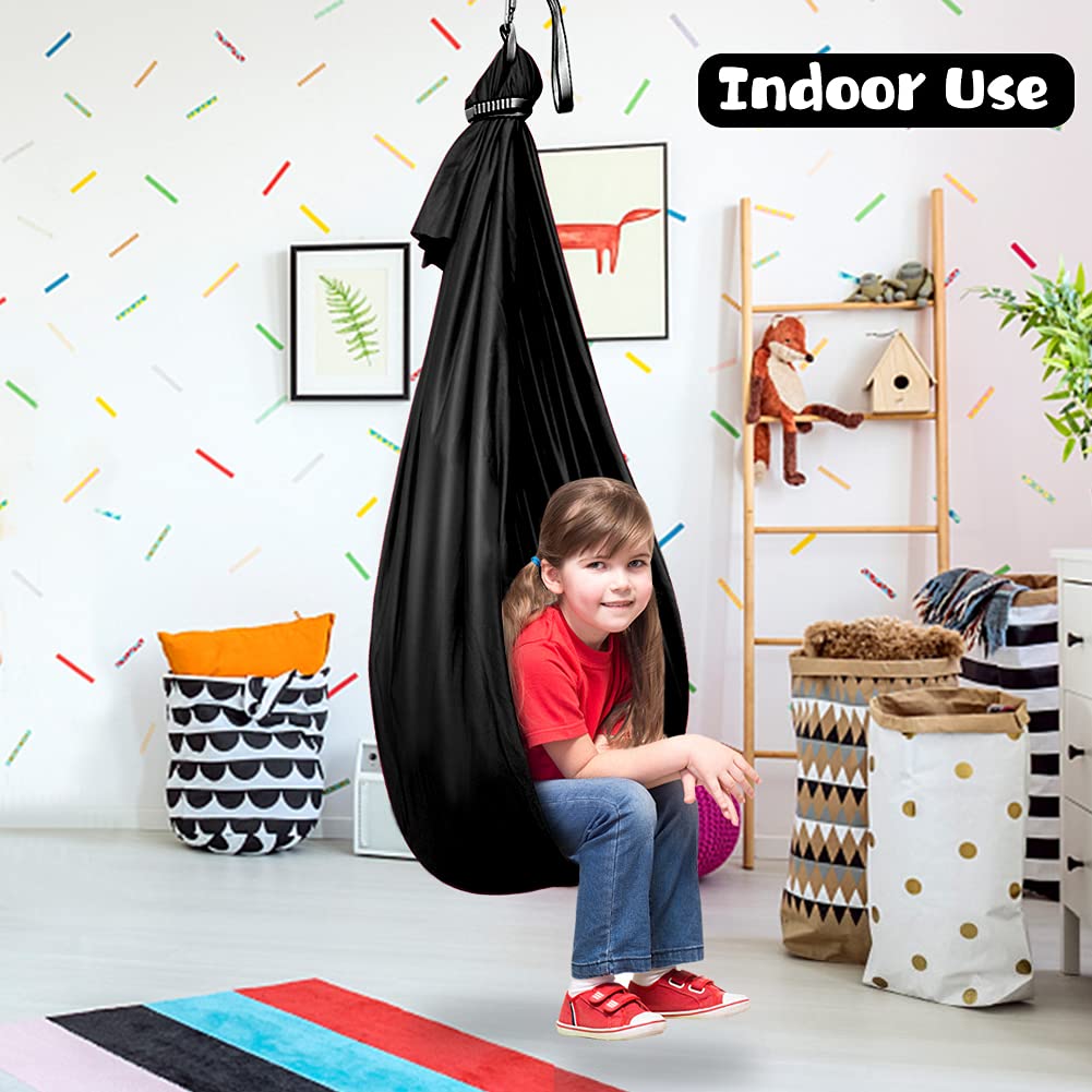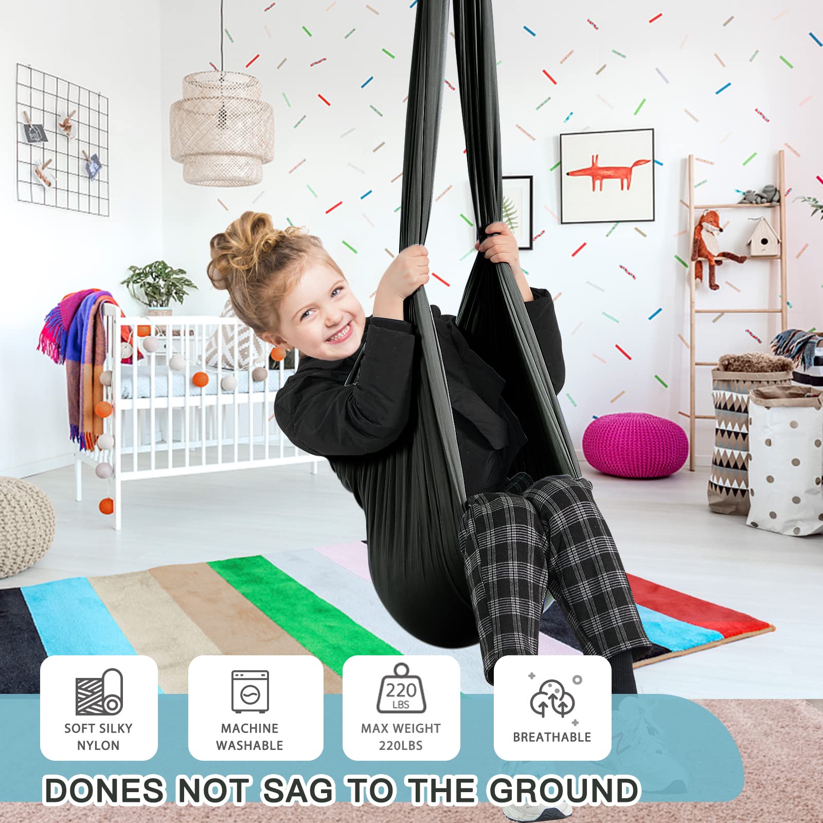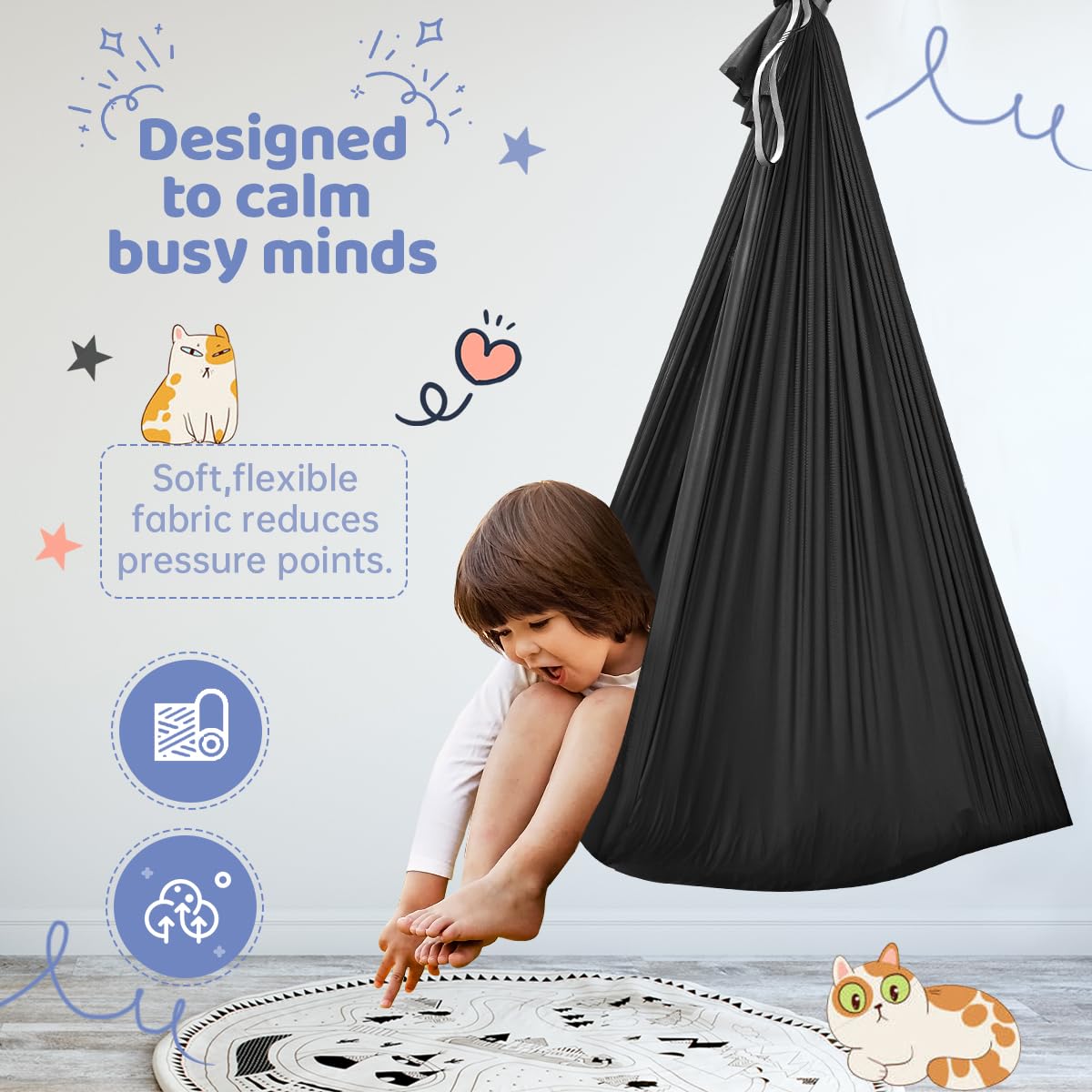 [SOFT SILKY NYLON]: This therapy swing is made of high quality material--soft & silk nylon. The fabric measures 110"L x 63W". Kids can sit and cocoon comfortably in the hammock with a sense of calmness. Our upgrade hammock can block out unwanted sensory stimulation.