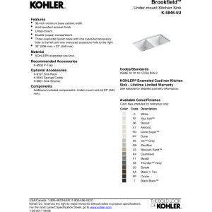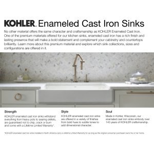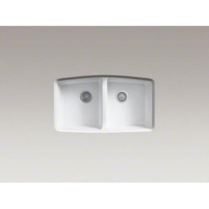 Product Description The classic Brookfield sink has been updated with a slimmer divider and expanded bowls that offer nearly 20 percent more workspace. Two deep basins minimize splashing and provide ample capacity for cleaning pots and pans. Crafted from enameled cast iron, this sink resists chipping, cracking, or burning for years of beauty and reliable performance. From the Manufacturer The classic Brookfield sink has been updated with a slimmer divider and expanded bowls that offer nearly 20 percent more workspace. Two deep basins minimize splashing and provide ample capacity for cleaning pots and pans. Crafted from enameled cast iron, this sink resists chipping, cracking, or burning for years of beauty and reliable performance.