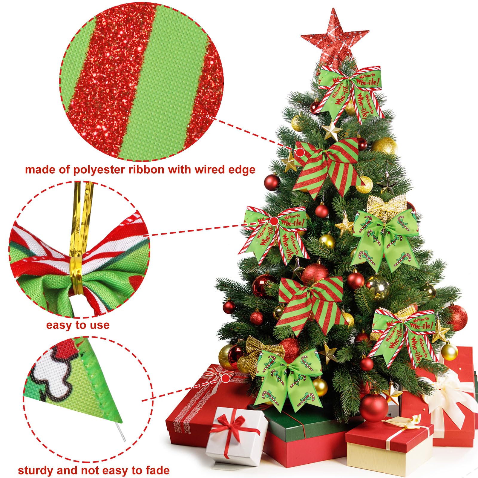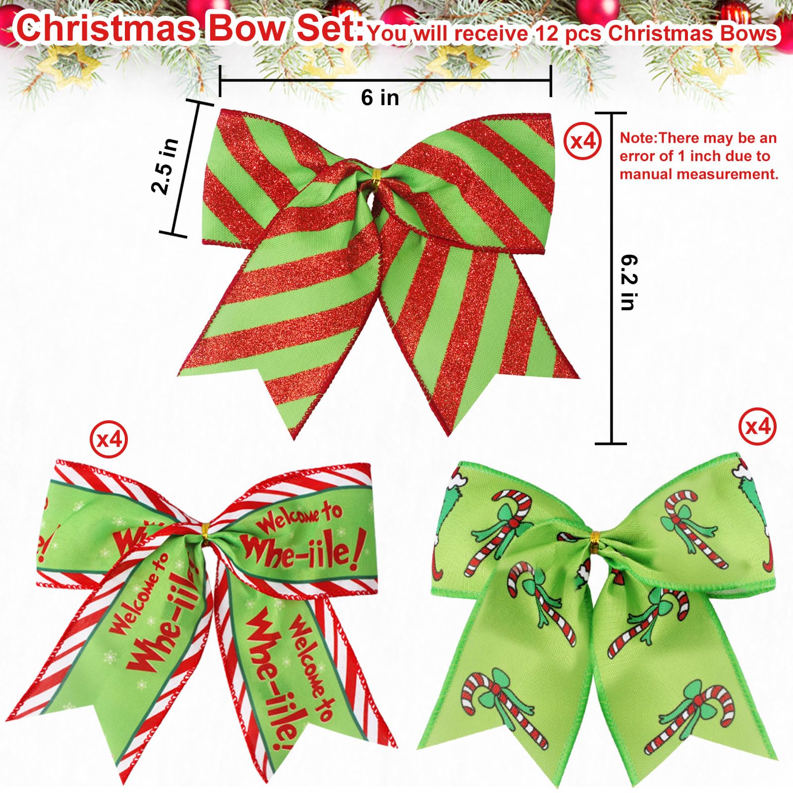 Christmas Bow Set: You will receive 12 pcs Christmas Bows,size is about 6 x 6 inch,crafted from 2.5 inch wide ribbon,suitable size for decorate Christmas tree or gift wrapping etc. You can use them to decorate your Christmas tree,house and gift