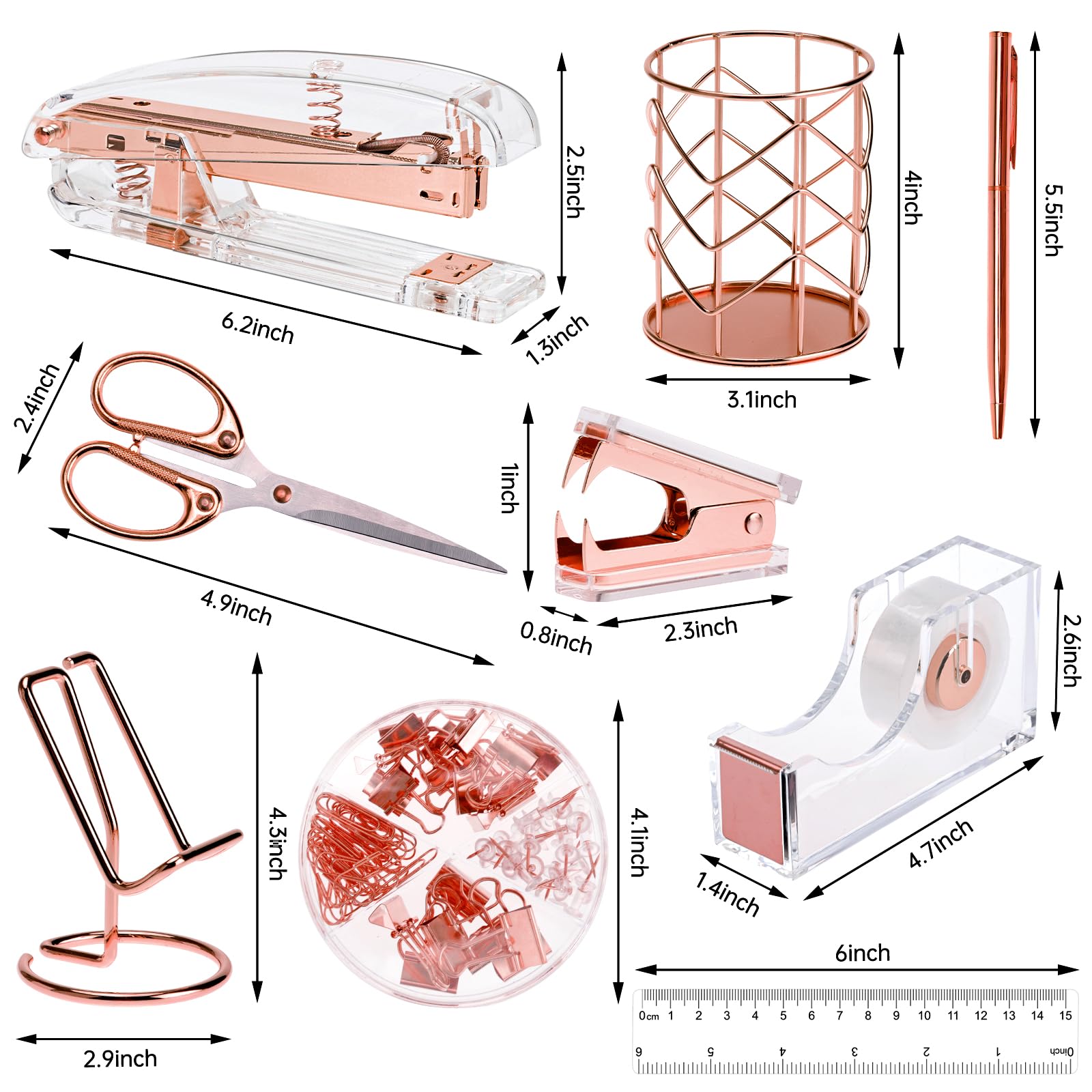 Size: Stapler: 6.2 x 1.3 x 2.5 inch, phone holder: 4.3 x 2.9 inch, scissor: 4.9 x 2.4 inch, tape holder: 4.7 x 2.6 x 1.4 inch, pen: 5.5 inch, pen holder: 4 x 3.1 inch, staple remover: 2.3 x 1 x 0.8 inch, ruler: 6 inch