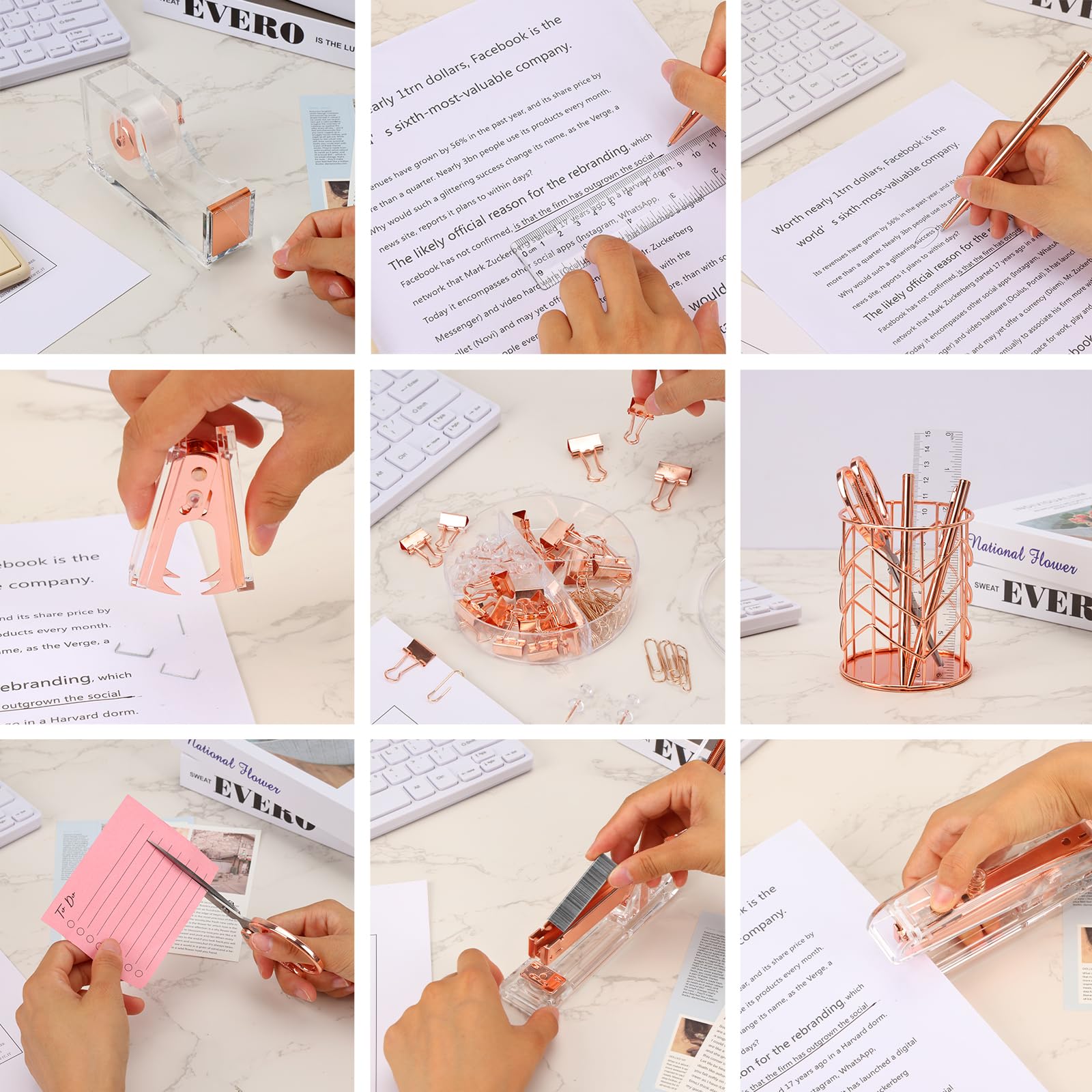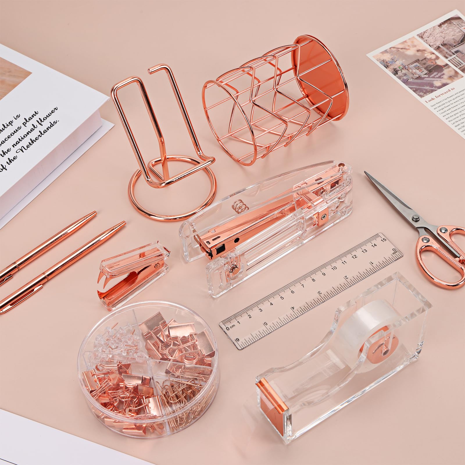 Packing Listing: 1x stapler, 1x staple remover, 1 x tape holder, 1x ruler, 1 x scissors, 1 x box of binder clips, 1000 x staples, 1 x phone holder, 1 x pen holder, 2 x pen, 1 x transparent glue ; This rose gold office set is rich in content and perfect for your desk, improving your productivity and making your office convenient and efficient.