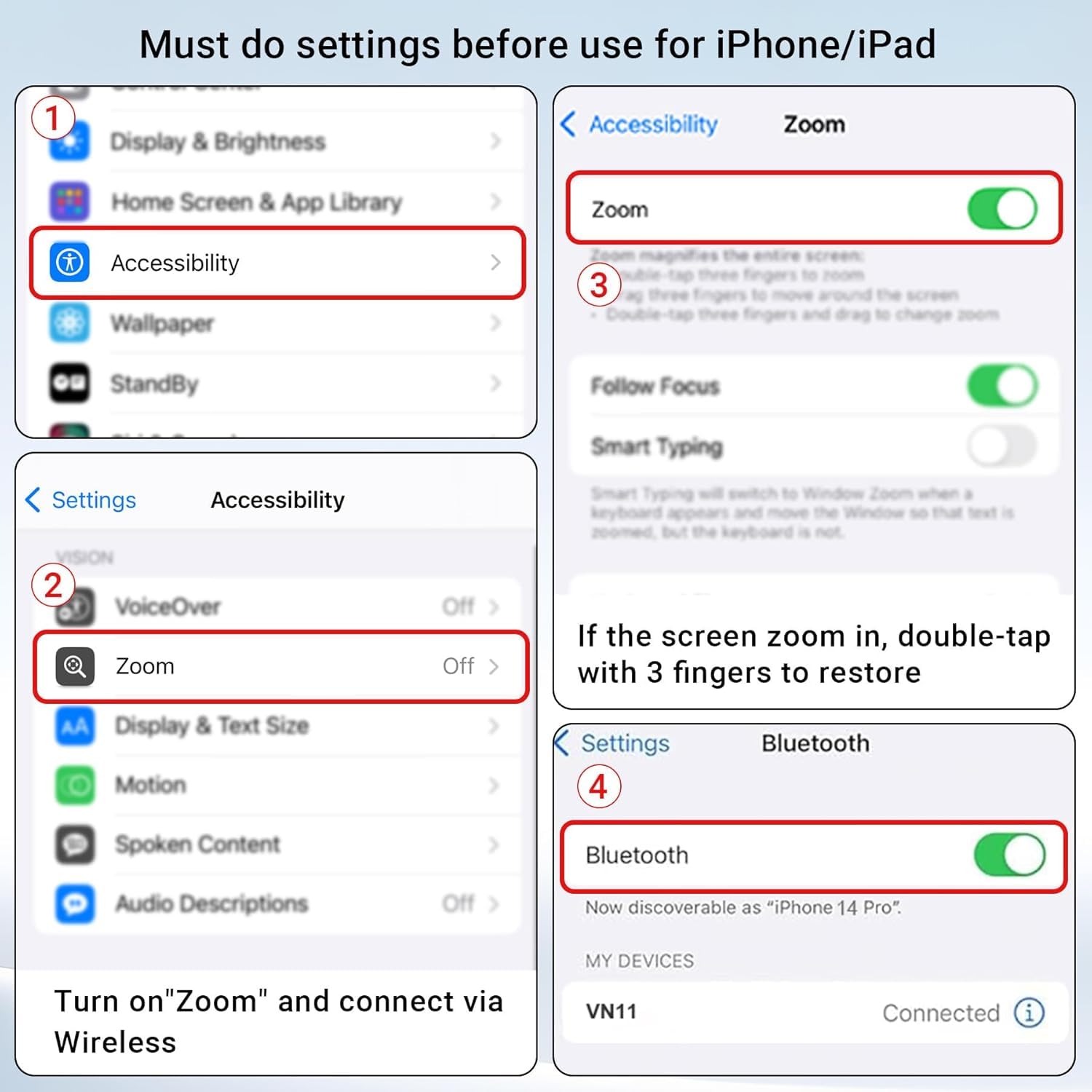 【Zoom in & out】This remote shutter with zoom feature (Must open zoom in accessibility setting for iPhone/iPad) can help you easily zoom in and out from a distance when taking photos and videos, bringing great convenience and making your shooting more professional