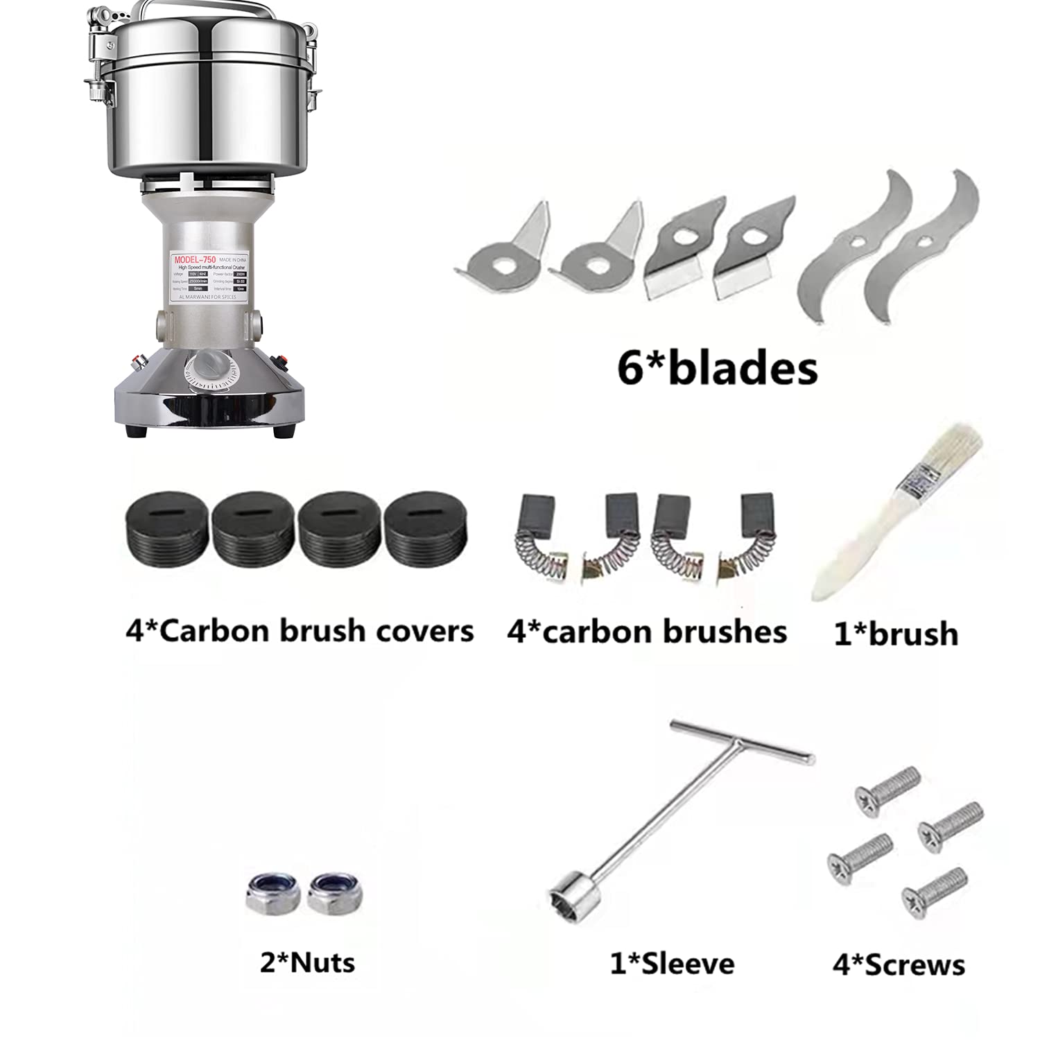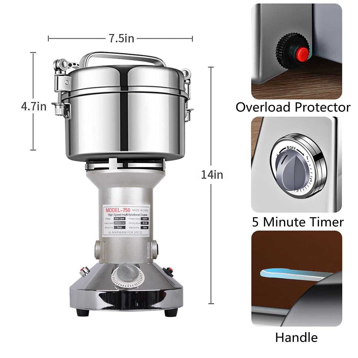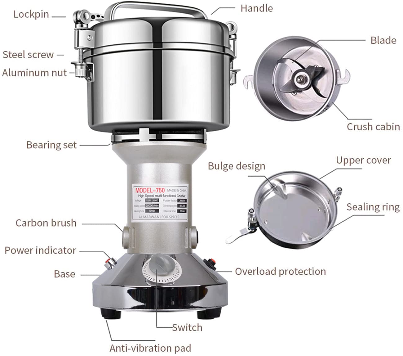 ✅ MIXER GRINDER : Power:2000W ; Capacity:750g; Interval Time:5-10 min;Rotating Speed: 25000R/Min,Triples blade: grinding blade, rotary blade, and powder removal blade, can be pulverized easily. Crushing fineness reaches from 50 to 300 mesh no more than a minute.metal motor blade: wear resistance good .Dry raw materials only.wet, moisture or oil materials can't be ground