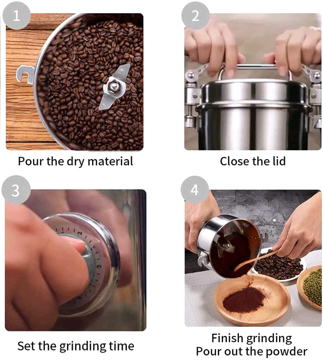 ✅ SUPER SAFE:Electric herb grinder made of food-grade stainless steel, sturdy and durable.The spice grinder electric will automatically turn off the power when overloaded, to protect your safety, gently press red button reset, you can continue to use it normally.Recommend use time is no more than 3 minutes. Do not continuously operate the machine, and it takes 5-10 minutes to rest after every 3 minutes of grinding work.