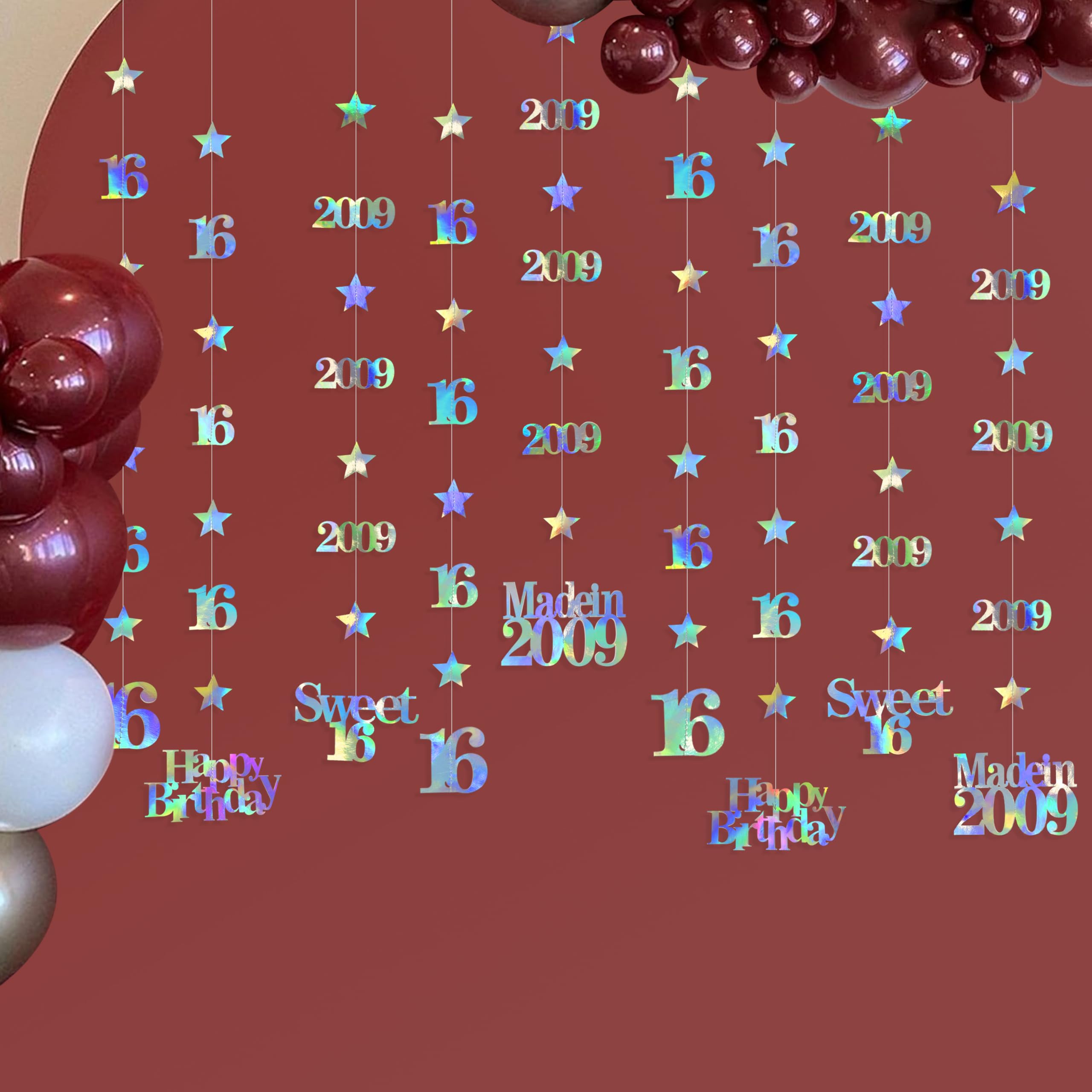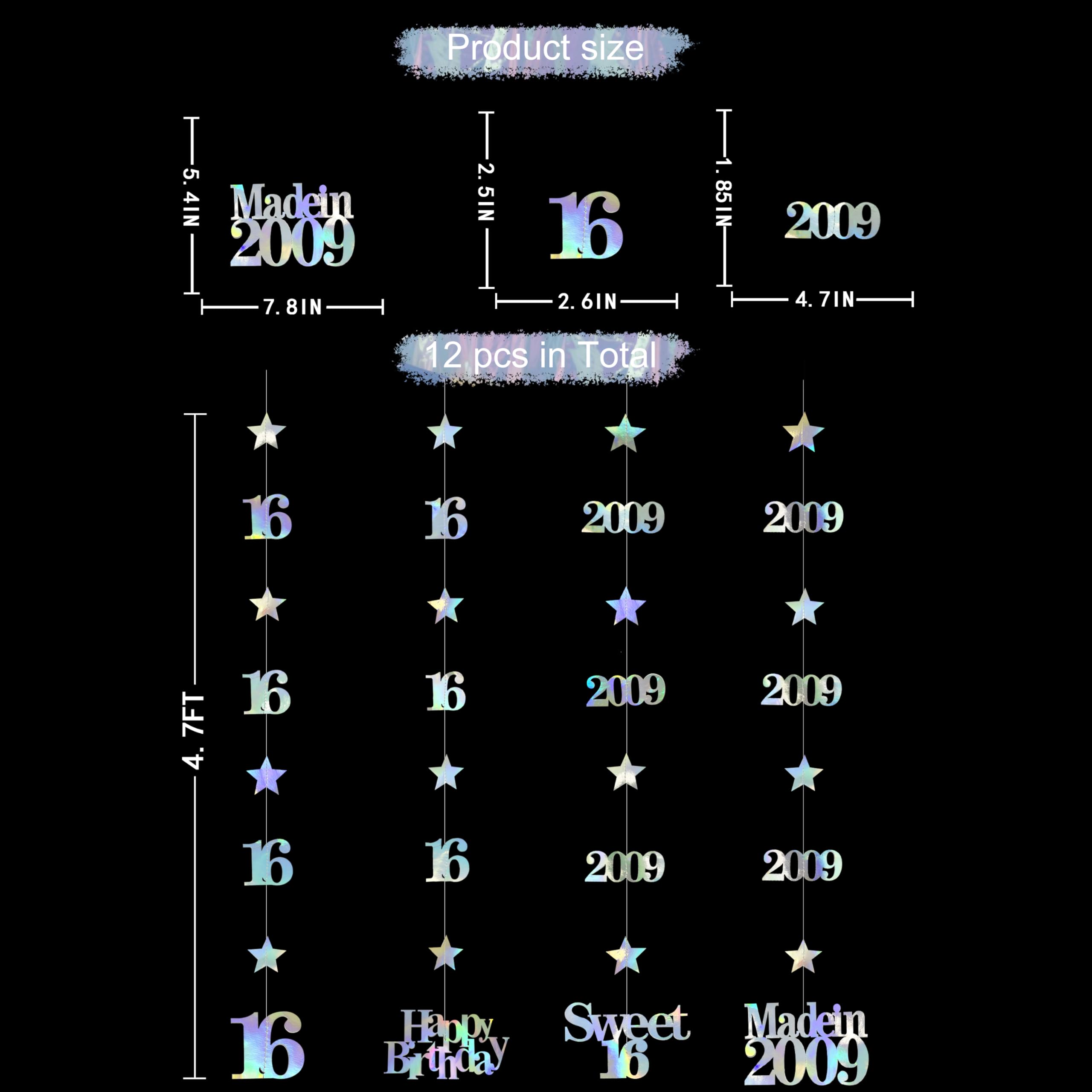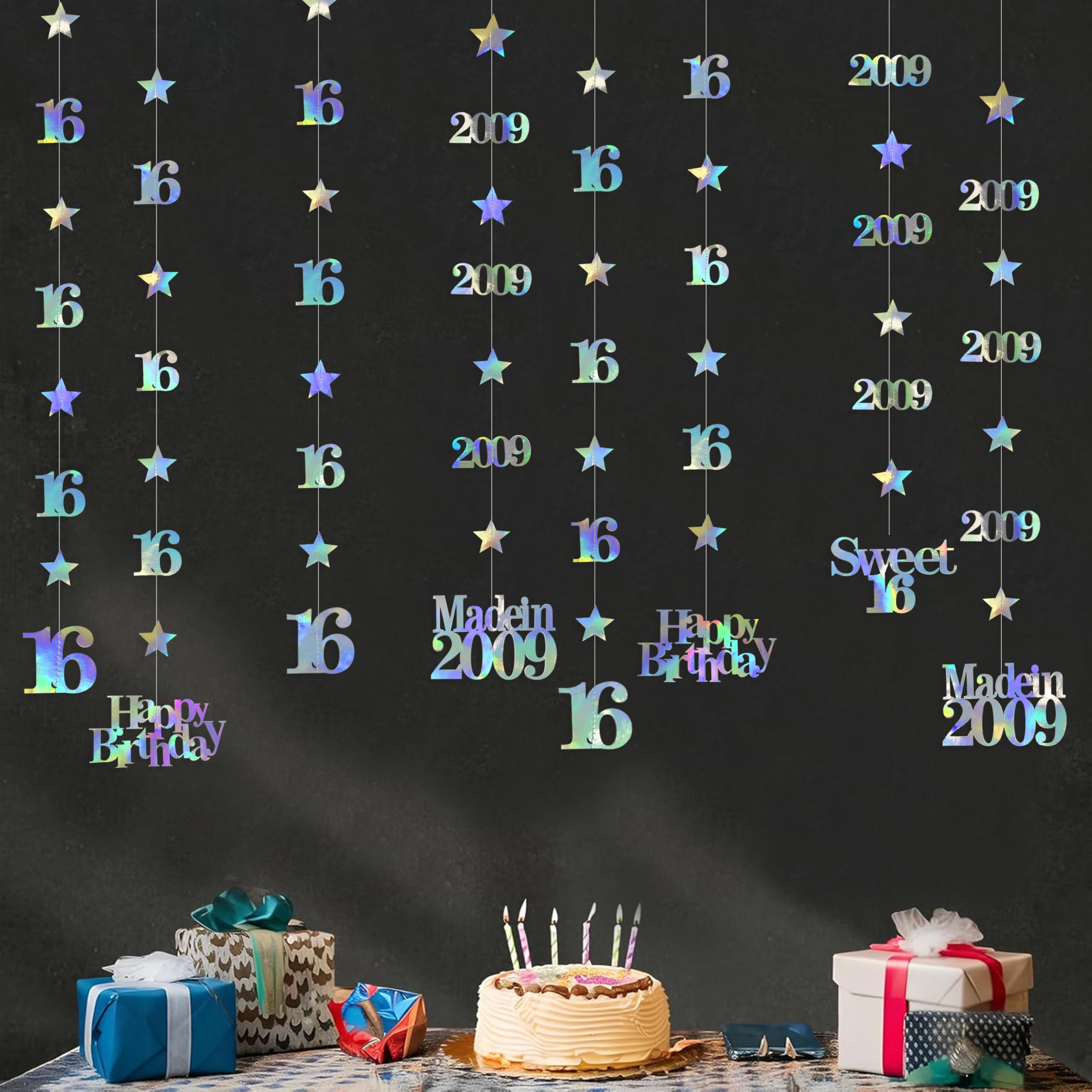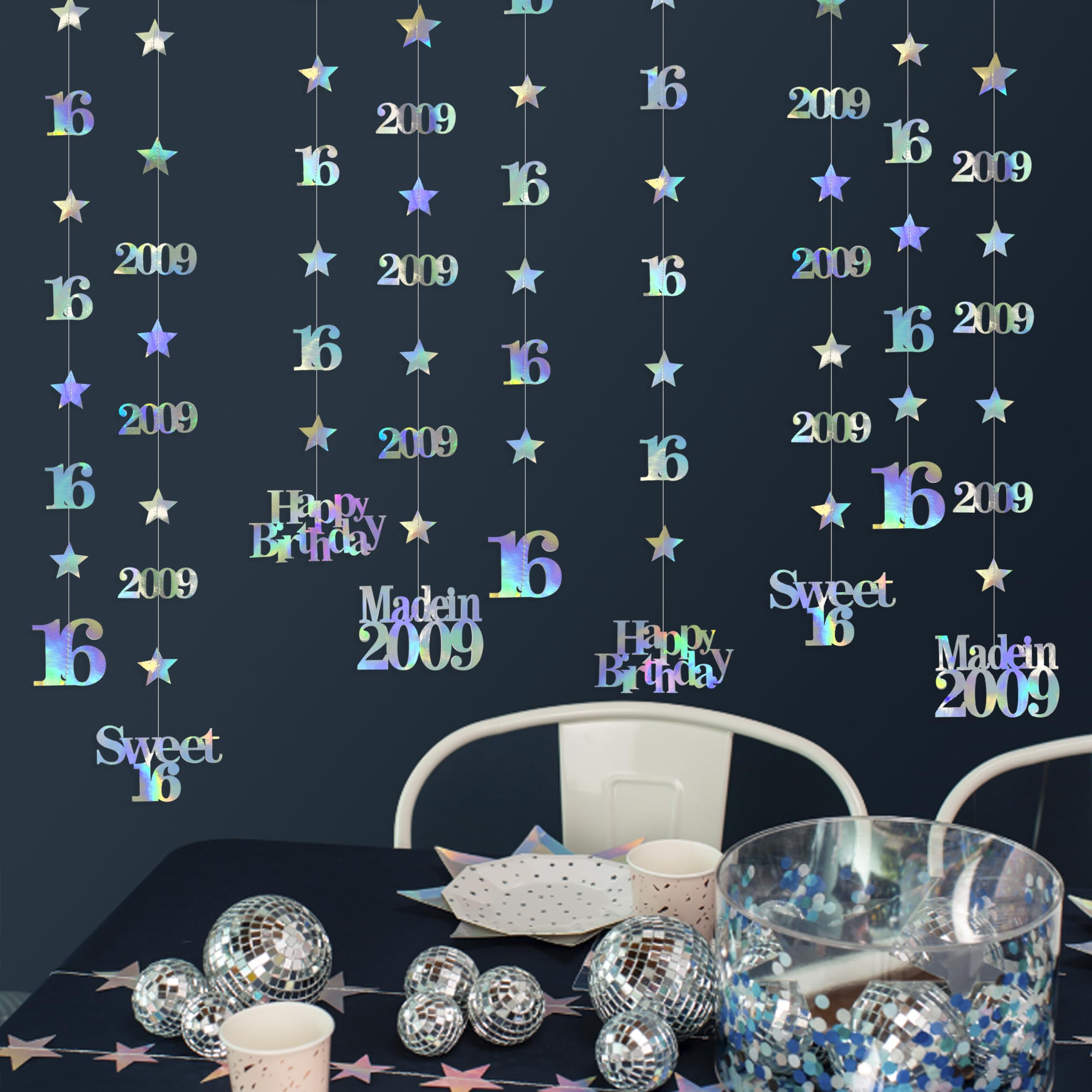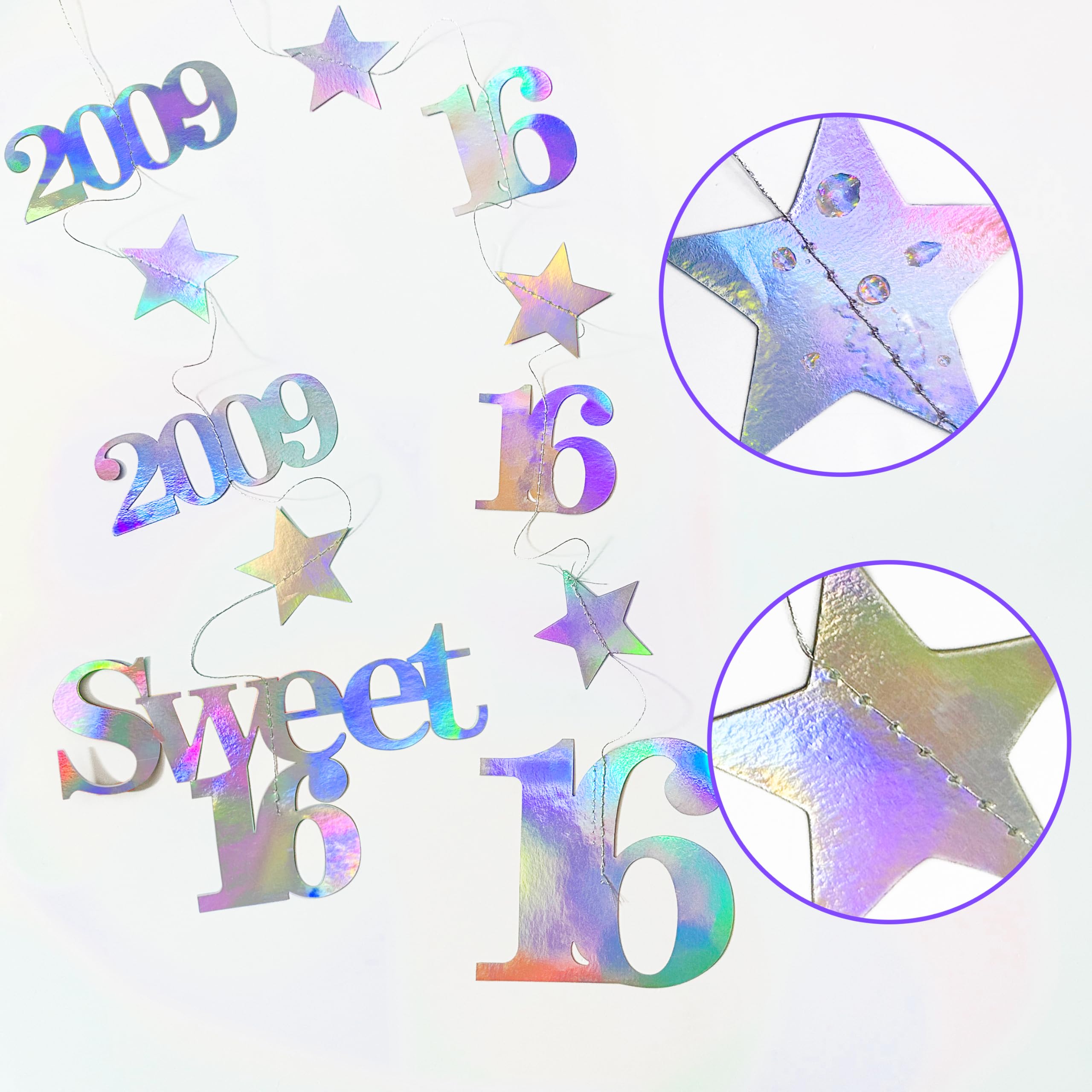 👍 Package includes - 12 strings of metallic iridescent 16th birthday theme sparkling twinkle star garlands with 16, Happy Birthday, Sweet 16 and Made in 2009 cutouts (in 4 styles) , each string is 4.7 feet/1.45 meters, totally is 56.4 feet/17 meters.