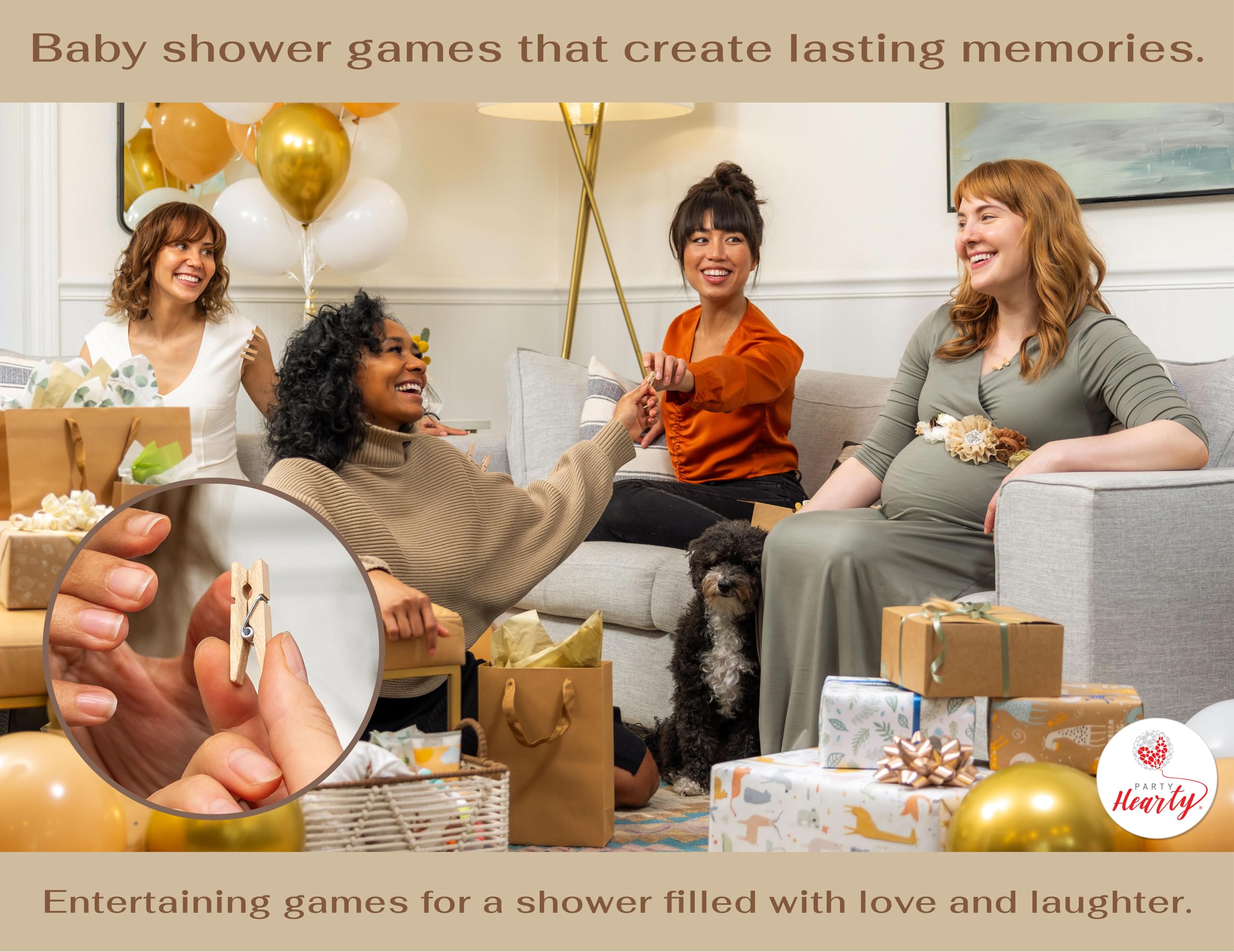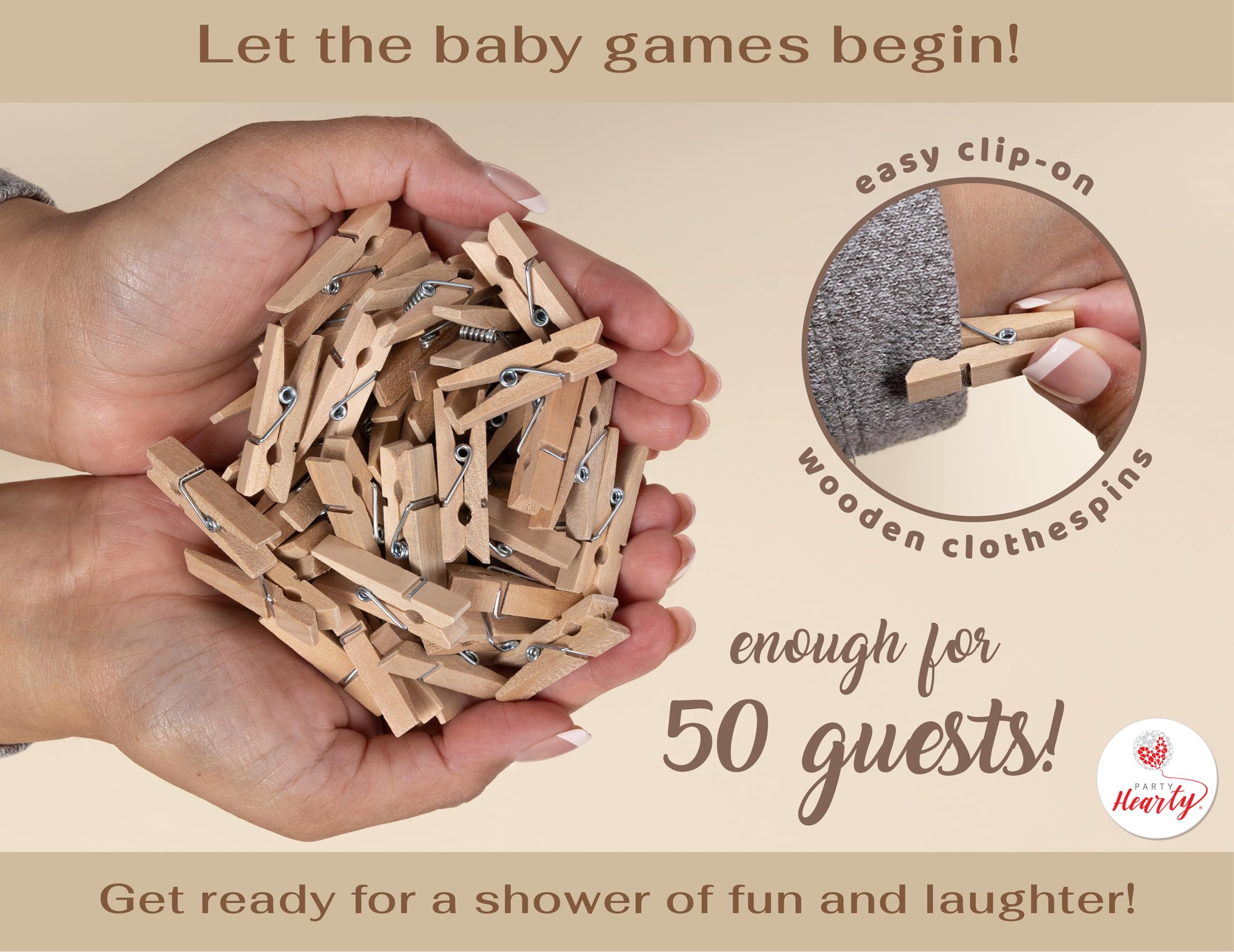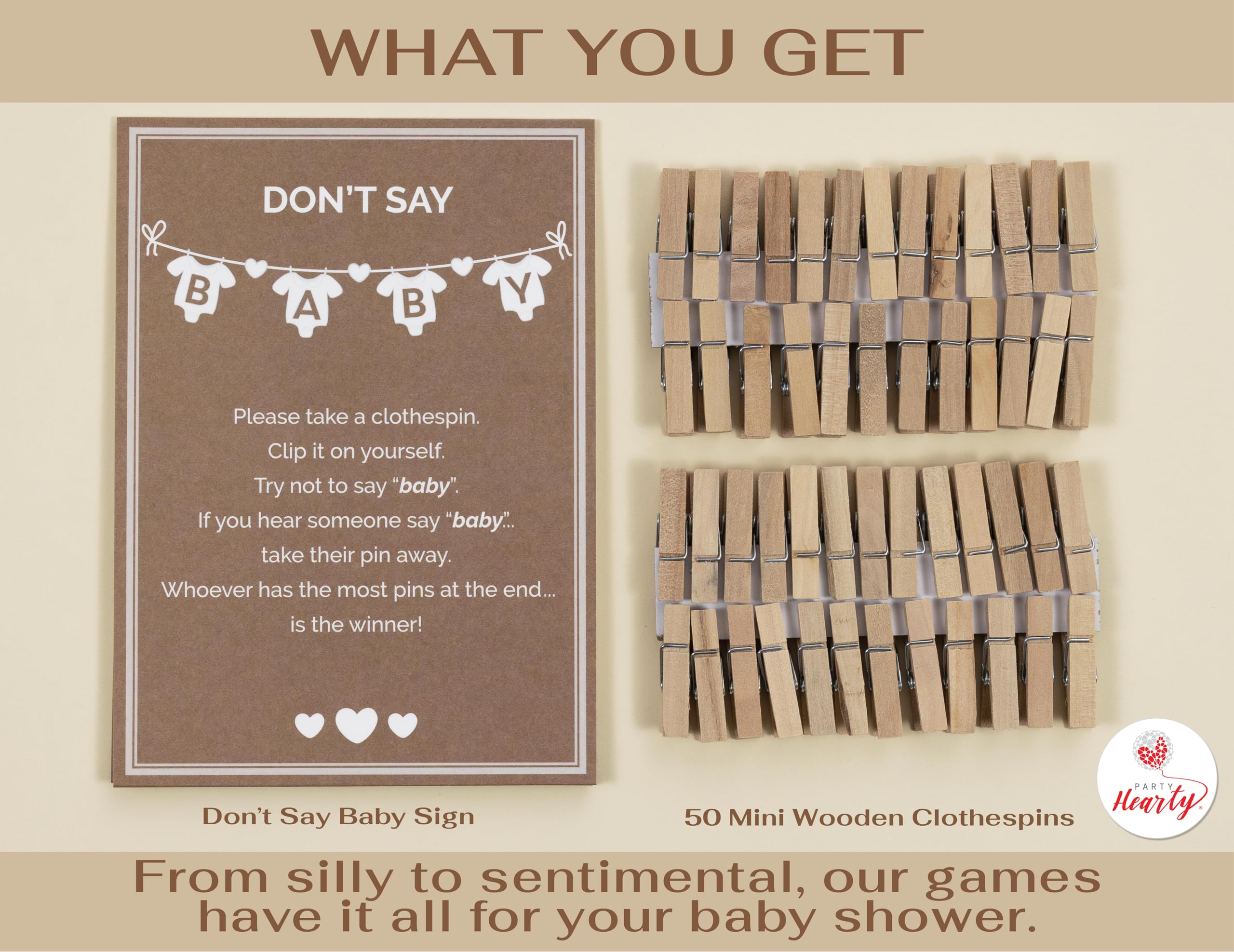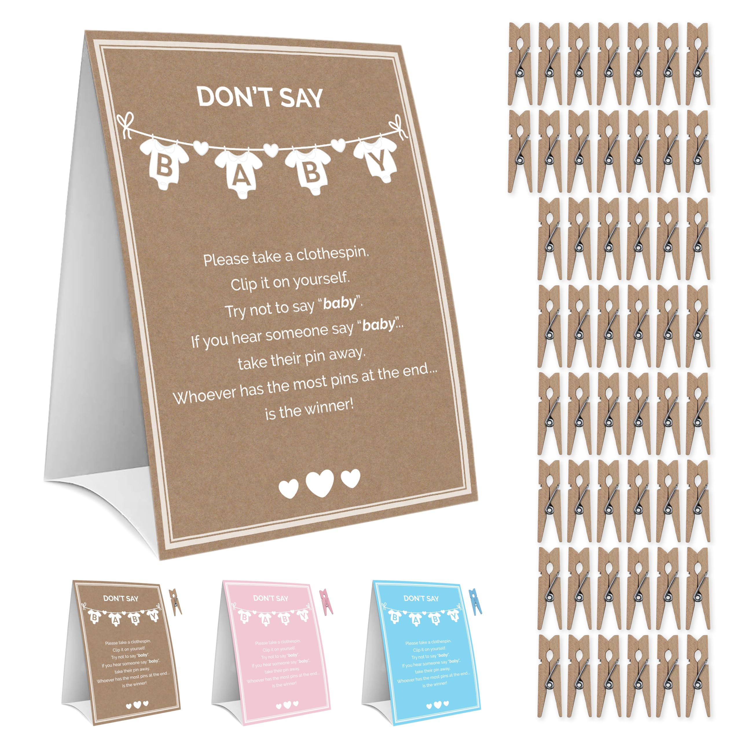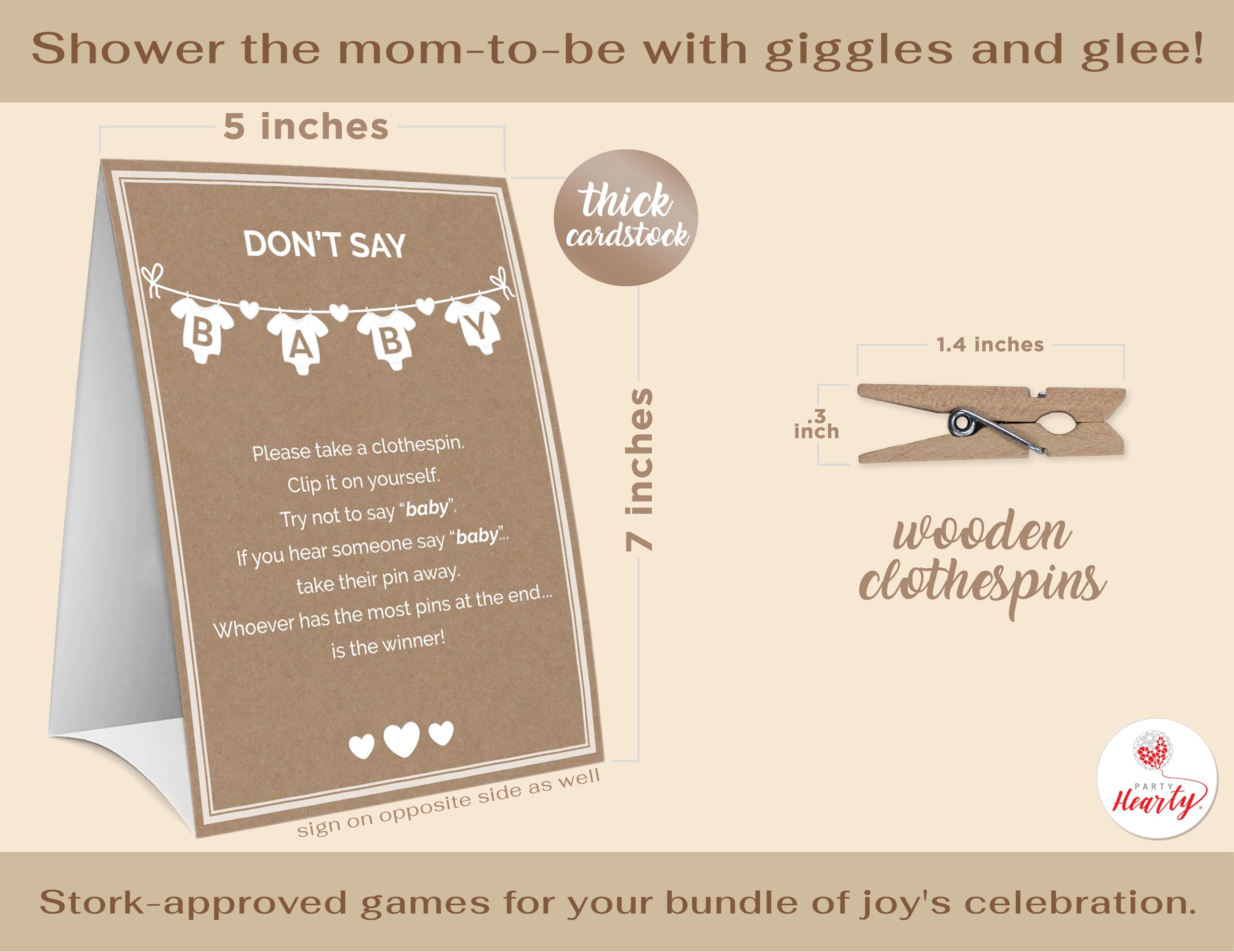 BABY SHOWER GAME EXTRAVAGANZA Includes: 1 Kraft Donβt Say Baby Sign (5x7 inches) professionally printed on premium paper and 50 Natural Wooden clothespins (1.4x0.3 inches) plenty for all your guests