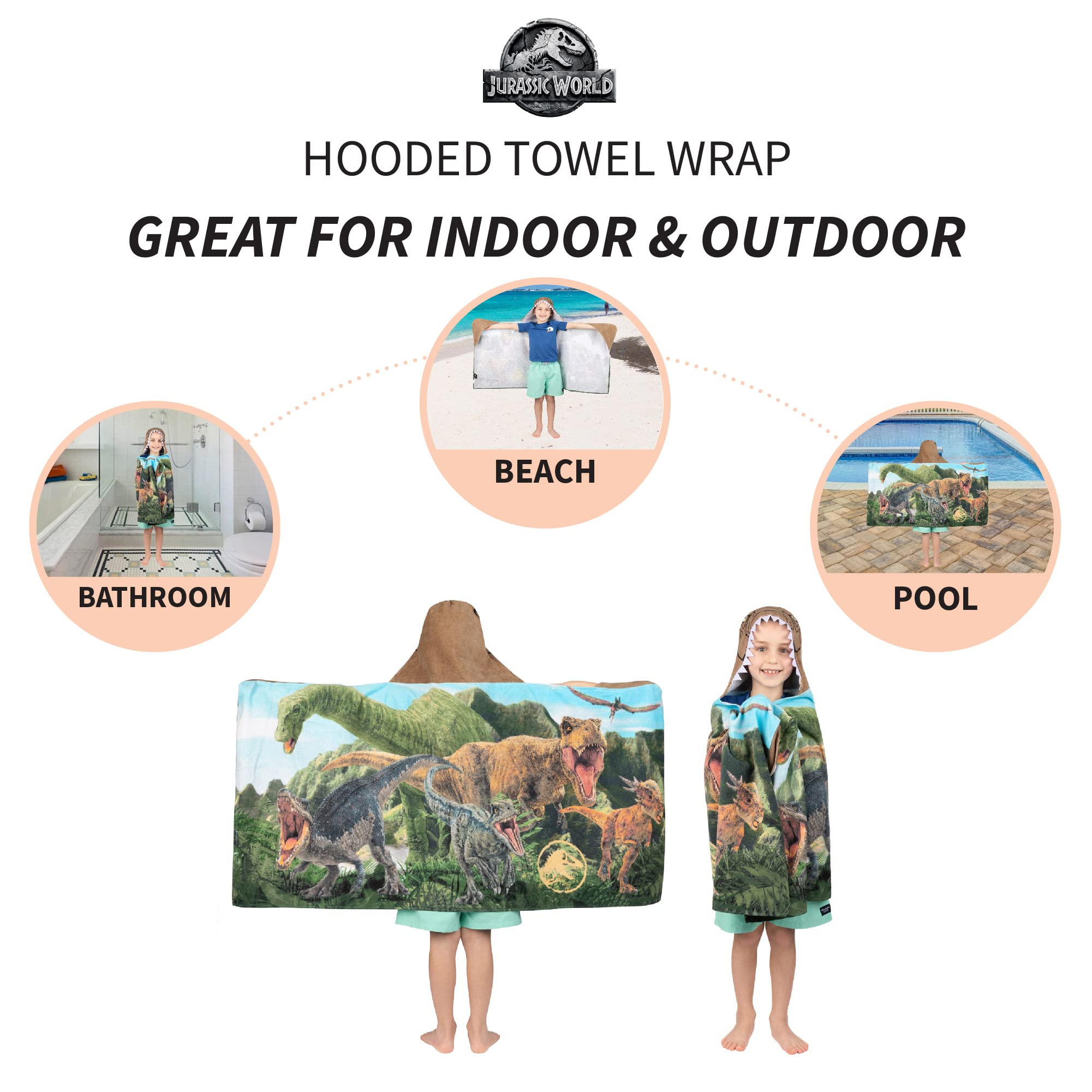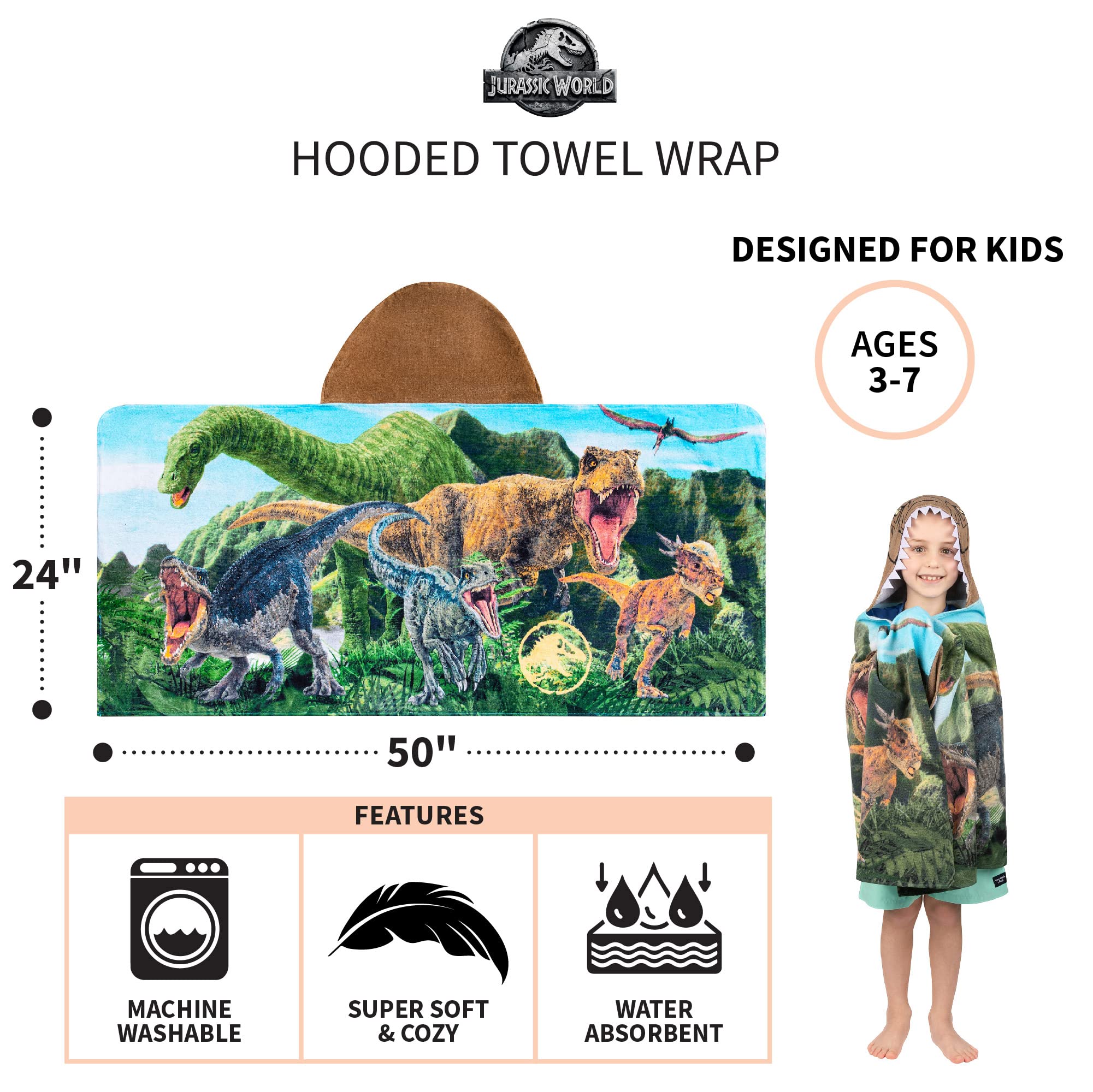 This soft and stylish Jurassic World Dominion hooded towel wrap is the perfect accessory for young dinosaur enthusiasts. Featuring an assortment of cretaceous creatures from the third film in the hit Universal series, this towel delivers fierce style for water-themed fun and adventure. Crafted from high-quality cotton terry fabric, this super soft hooded towel wrap delivers quick-drying absorbency. Kids will love wrapping themselves up in fun character artwork, featuring their favorite dinosaurs in their natural habitat. Whether theyβre toweling off at the pool, relaxing on the beach, or using this wrap as a poncho, bathrobe or washcloth, kids will get a kick out of the fun look and soft feel. In Jurassic World 3 Dominion, the future of mankind hangs in the balance as humans and dinosaurs attempt to co-exist. Fans of the thrilling Universal movie are sure to appreciate the bold dinosaur style of this "Jurassic Township" patterned hooded towel. Itβs a cool and colorful way to keep the magic of Jurassic World from becoming extinct.