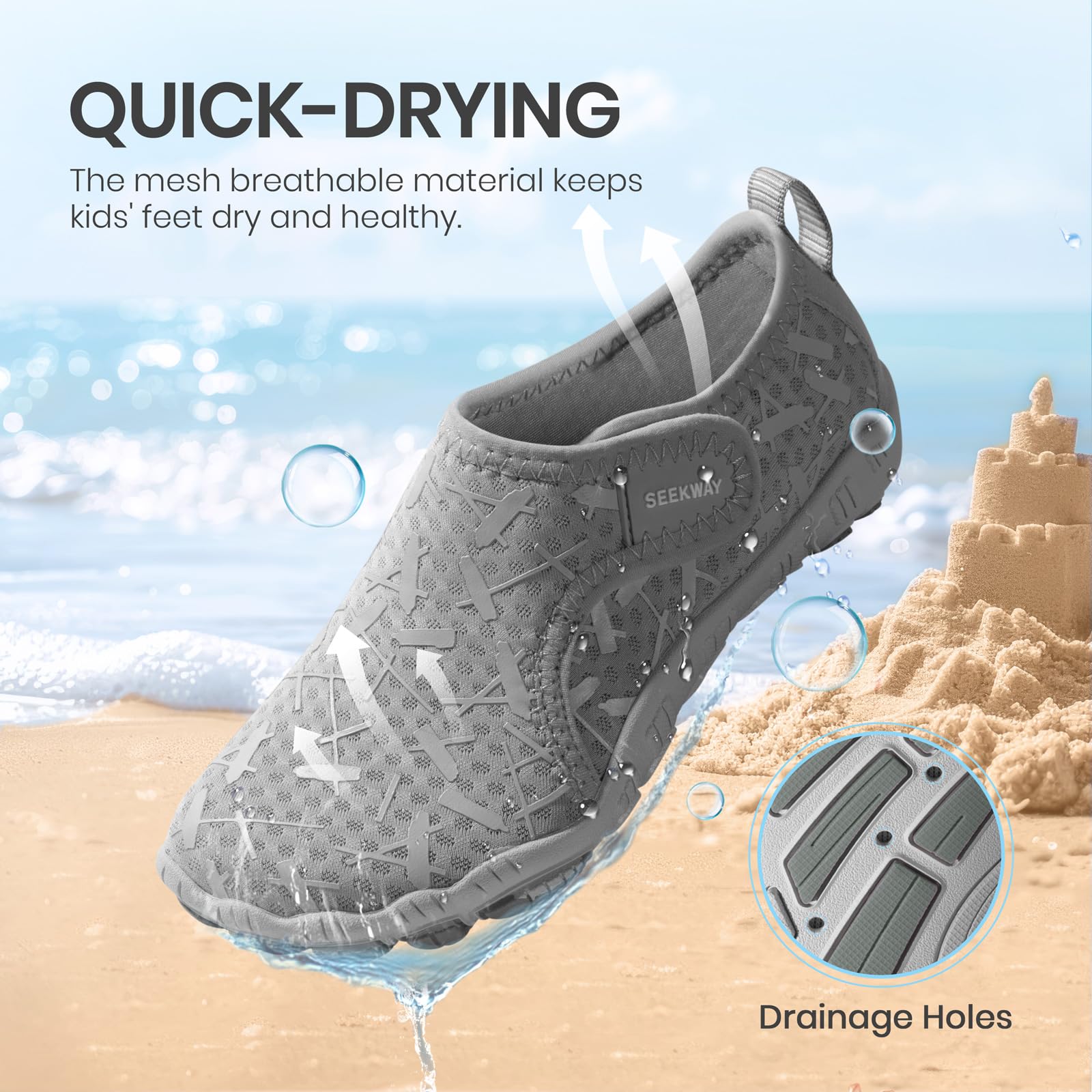 【Breathable & Permeable Material】: The mesh breathable material on the upper combined with drainage holes on the outsole keeps kids' feet dry and healthy.