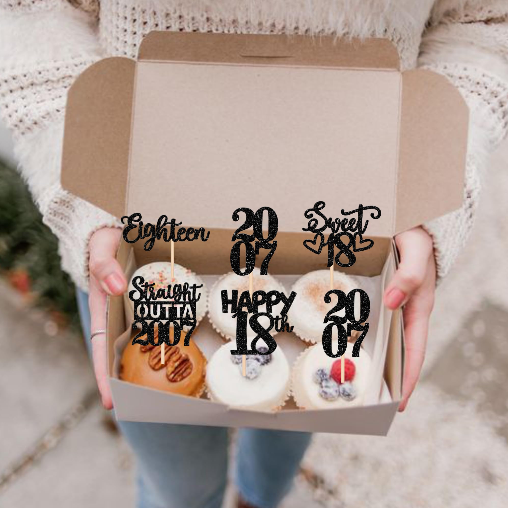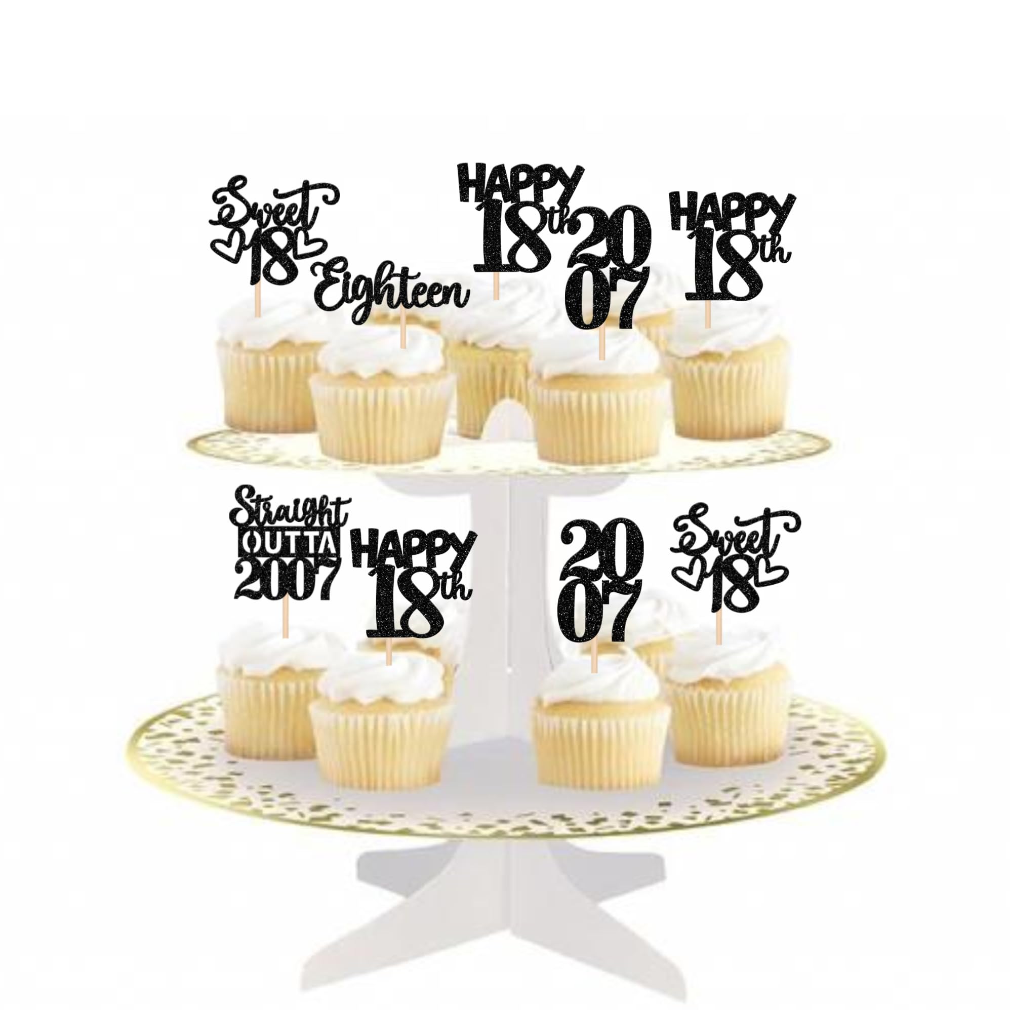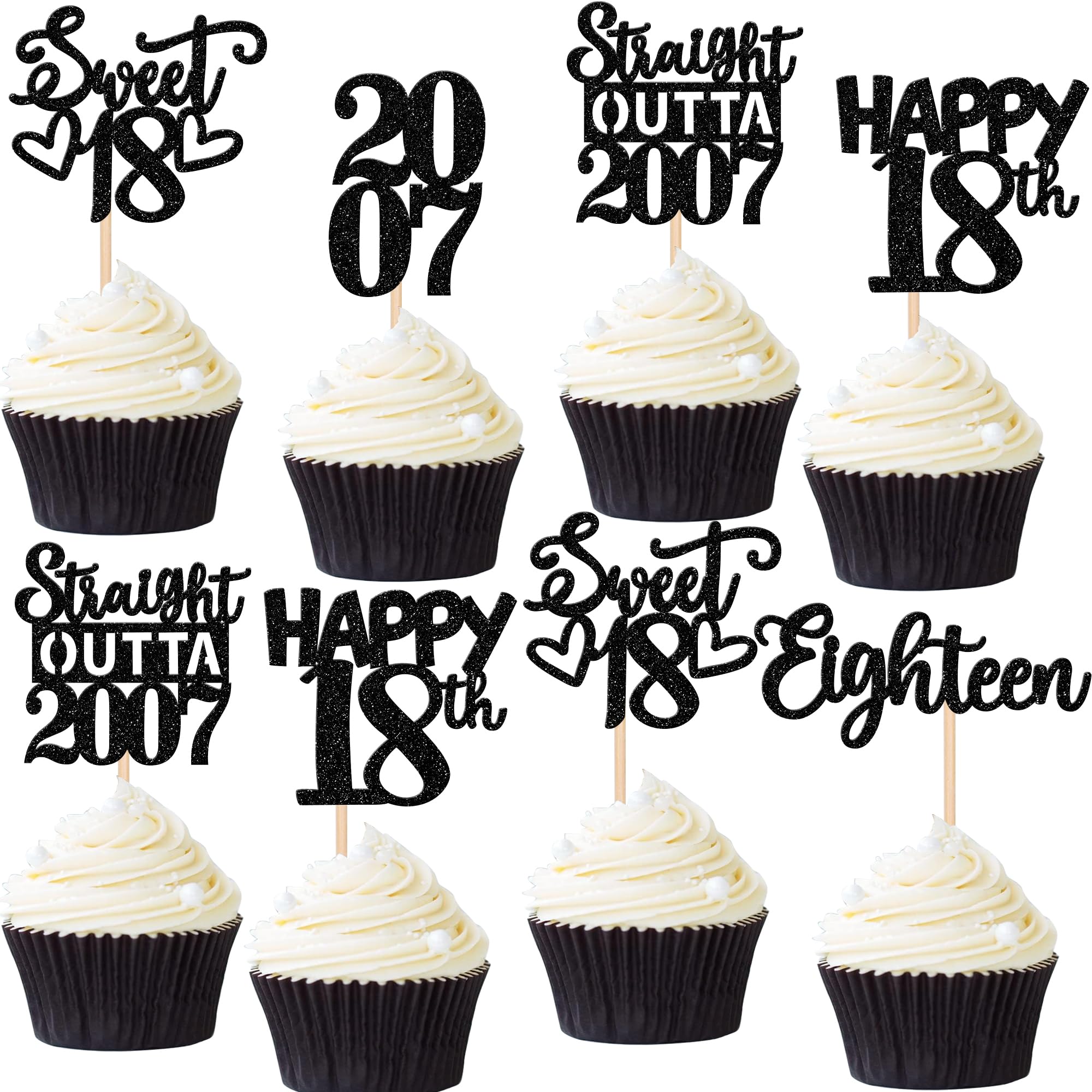 Straight Outta 2007 Cupcake Toppers for Happy 18th Birthday Anniversary Party Cake Decorations Supplies Perfect for happy 18th bithday theme party, straight outta 2007 theme party, 18th wedding anniversary theme party,cheers to 18 years theme party cupcake decorations supplies. Pack of 30 pcs,6 pcs of each design The size is 2.3*4.6/2.2*4.6/1.9*4.6/2.1*3.9/1.2*4.6 inch ( with stick ) Made of high quality paper card stock, thick and thick and sturdy. These cupcake toppers are single glitter, the back is white, and they are intended for decoration only, please do not put them in oven or microwave. If the item you received has any defects, please contact us immediately. we will deal with it within 24 hours.