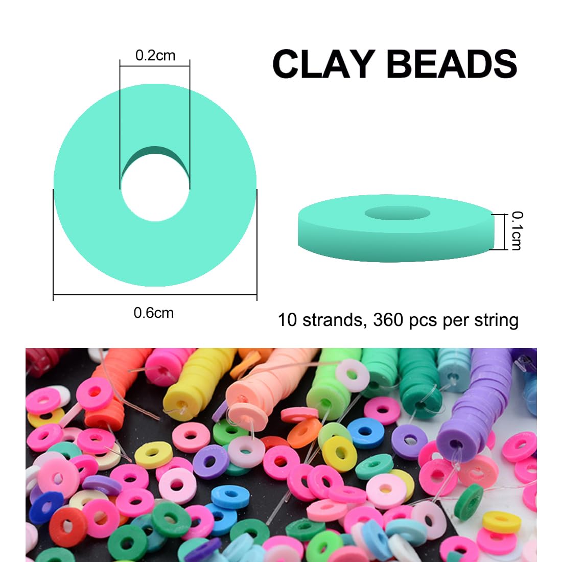 Package Contains: 10 strands of clay heishi beads for jewelry making, each string has about 360 pieces clay beads. The bracelet making beads are sized 6 mm in diameter, 2 mm in hole diameter. Enough quantities to creat 50 pcs bracelets.