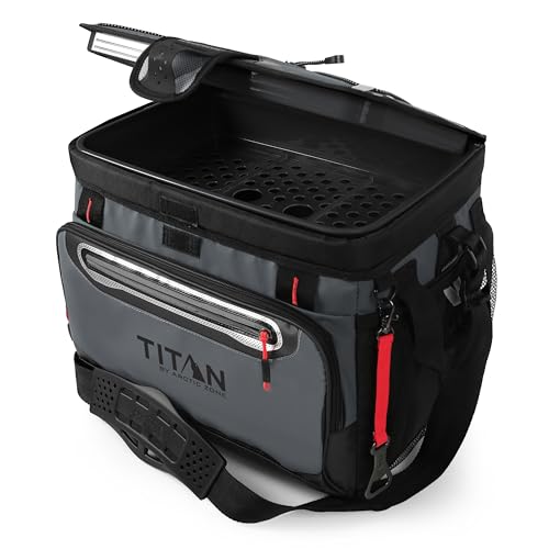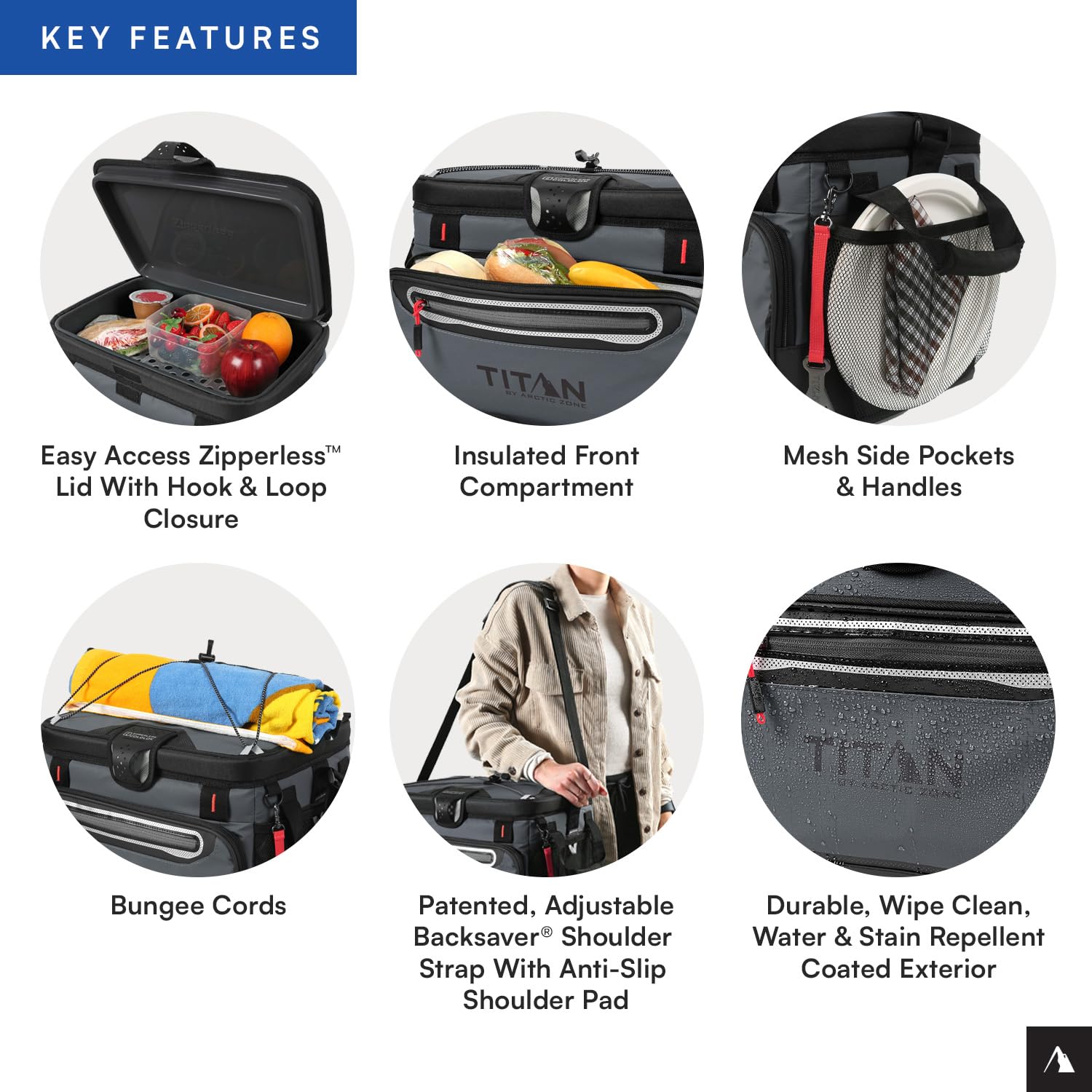 TITAN DEEP FREEZE ZIPPERLESS HARDBODY COOLER: Zipperless cooler features a patented, "flip-open" Zipperless lid for quick access to food and drinks; Keeps ice up to two days and holds up to 30 cans