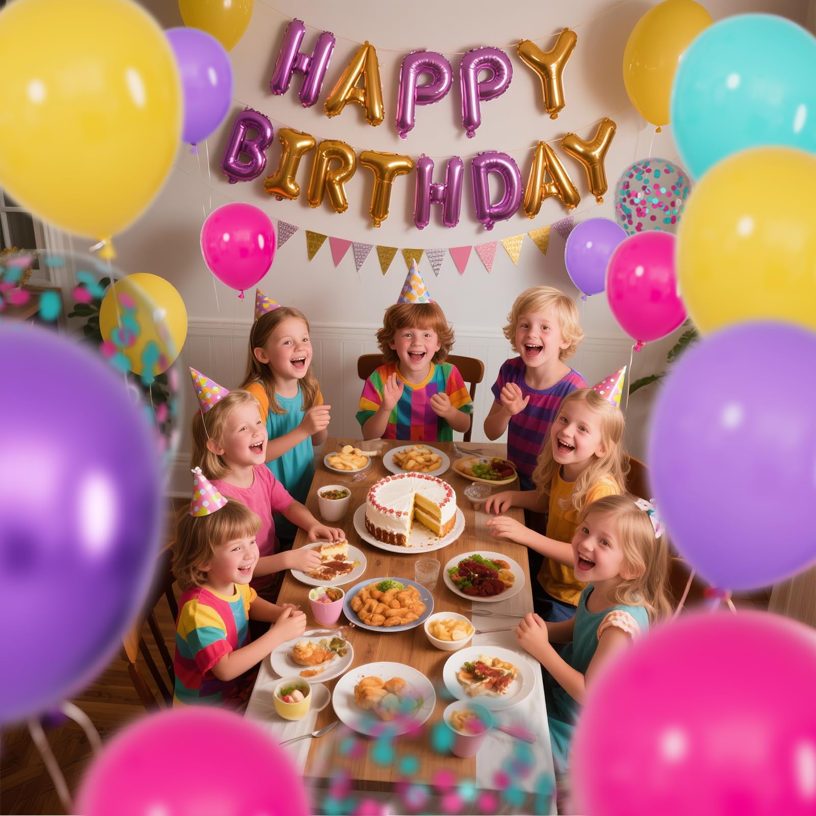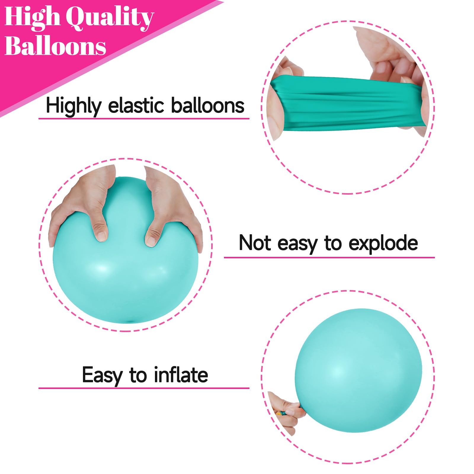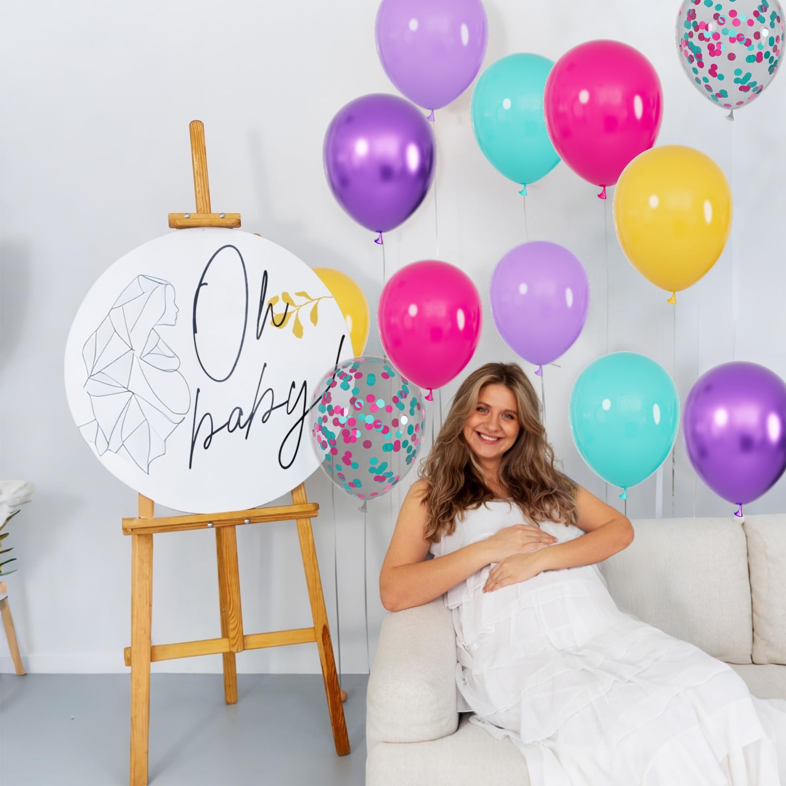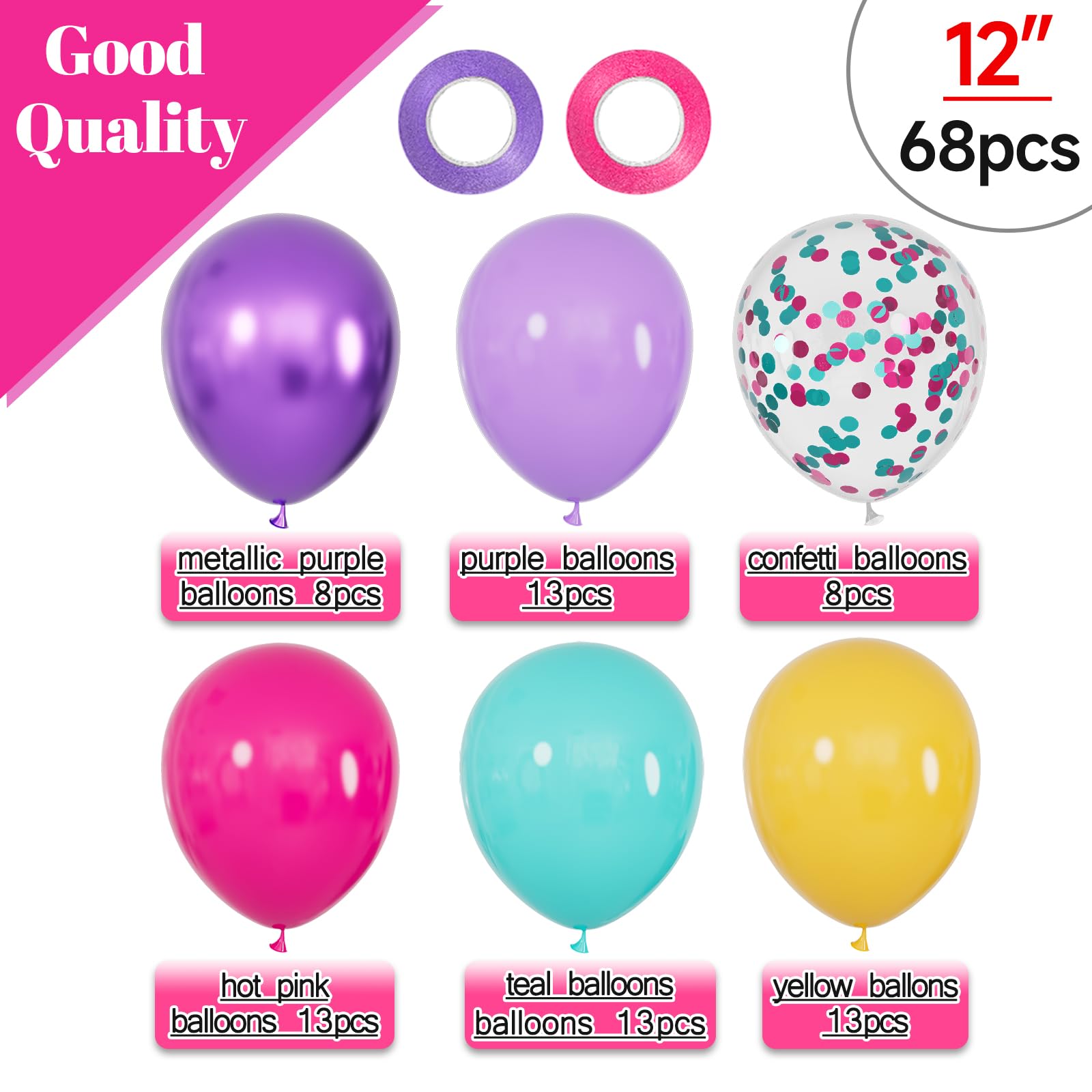 Simple balloon pack: Contains 68 pieces of 12-inch latex balloons, including 8 metallic purple balloons, 8 hot pink teal mixed confetti balloons, 13 teal balloons, 13 purple balloons, 13 yellow latex balloons, and 13 hot pink balloons.