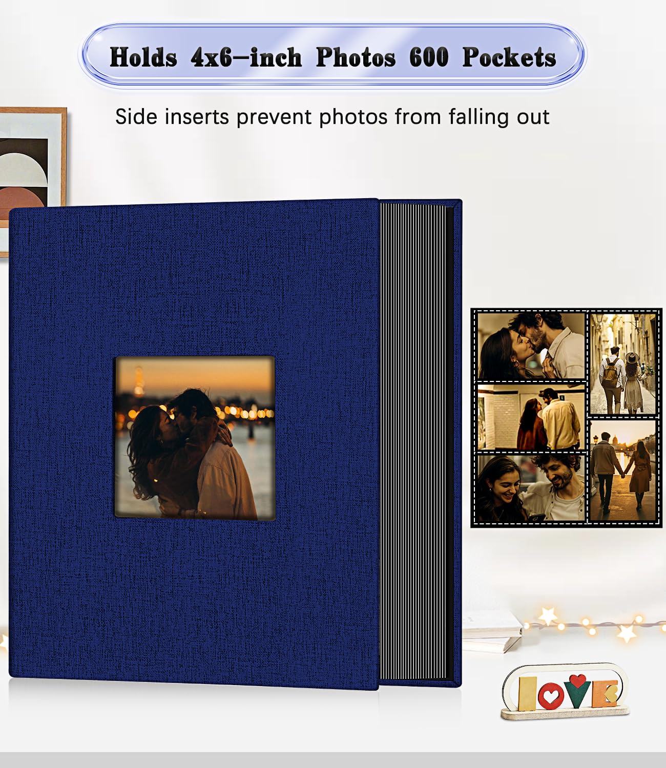 💖 Perfect Storage Capacity: This hardcover photo book is 13.2 L x 12.4 W x 2.25 Thick (inches) with 60 sheets/120 pages. Each page has 5 pockets that hold a total of 600 4x6 photos.Photos fit snugly in the pockets and won't slip out. Perfect for storing your family, wedding, anniversary, baby and holiday photos, so you can organise and display your photos beautifully and conveniently.