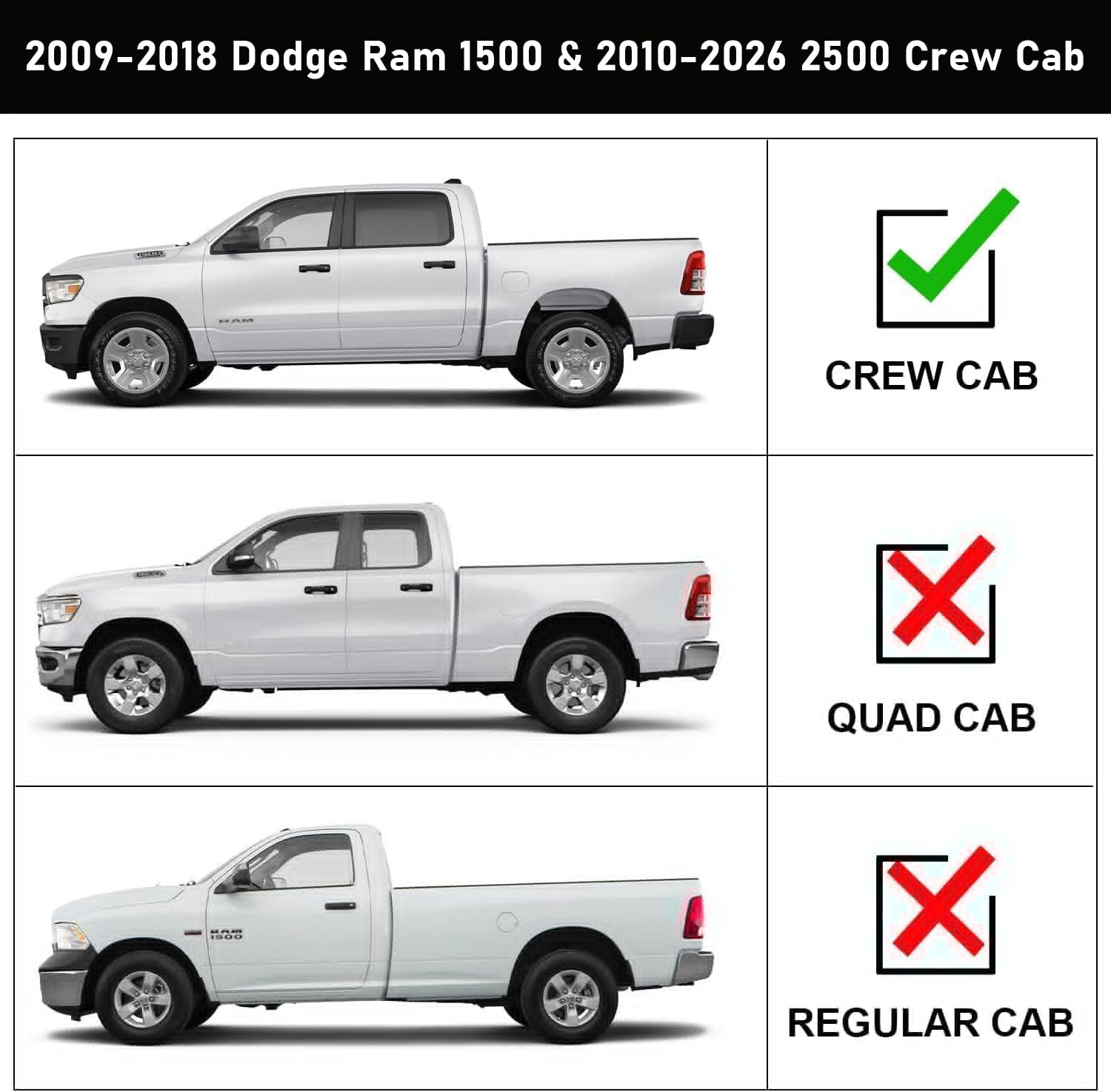 FITMENT: Running Boards Compatible with 2009-2018 Dodge Ram 1500 Crew Cab, 2010-2026 Ram 2500/3500 Crew Cab, 2019-2024 Ram 1500 Classic Crew Cab. The Bottom of The Truck Have Factory Holes. please Check The Cab Size Before Purchase.