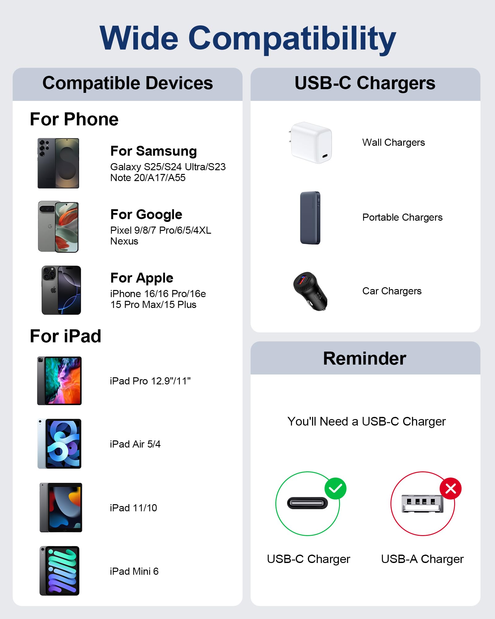 【Universal Compatibility】: Apple USB C Charging Cable provides high-speed charging for Type-C smartphones, tablets, including iPhone 17, 17Pro Max, Air, 17 Pro, 16, 16 Plus, 16e, 16 Pro, 16Pro Max, 15, 15 Pro, 15Pro Max, 15 Plus, iPad Pro 12.9 inch 6th 5th 4th 3rd gen, iPad Pro 11 inch 4th 3rd 2nd 1st gen, iPad Air 13/11 inch, iPad Air 5th 4th gen, iPad Mini 6, iPad 11 10, Galaxy S25, S24, S23 Ultra, S22, S21, A17, A16, A56, A36, Google Pixel 10, 10 Pro XL, 9, 9 Pro, 8, 7 Pro, 6a and more.