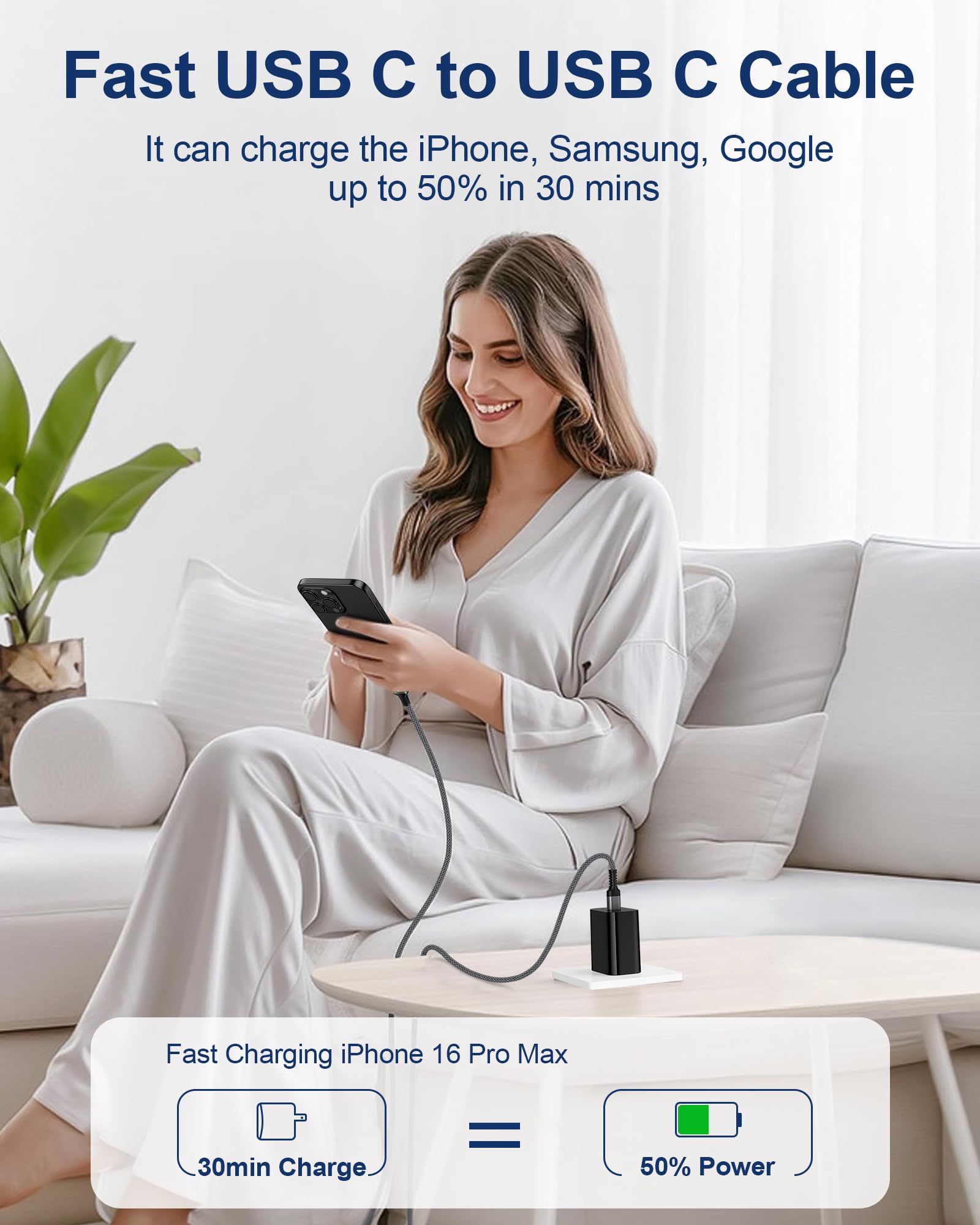【Fast and Safe】: The Nylon Braided iPhone 16 charging cord 6ft improves the charging and data transmission speed, lets you enjoy 60W fast charging and 480Mbps data transfer, and can power up iPhone 17/16/16 Plus/16Pro/15 from 0% to 50% within 30 minutes. This type c to c fast charge cable can provides stable voltage and current protection to ensure safety at the full fast charge.
