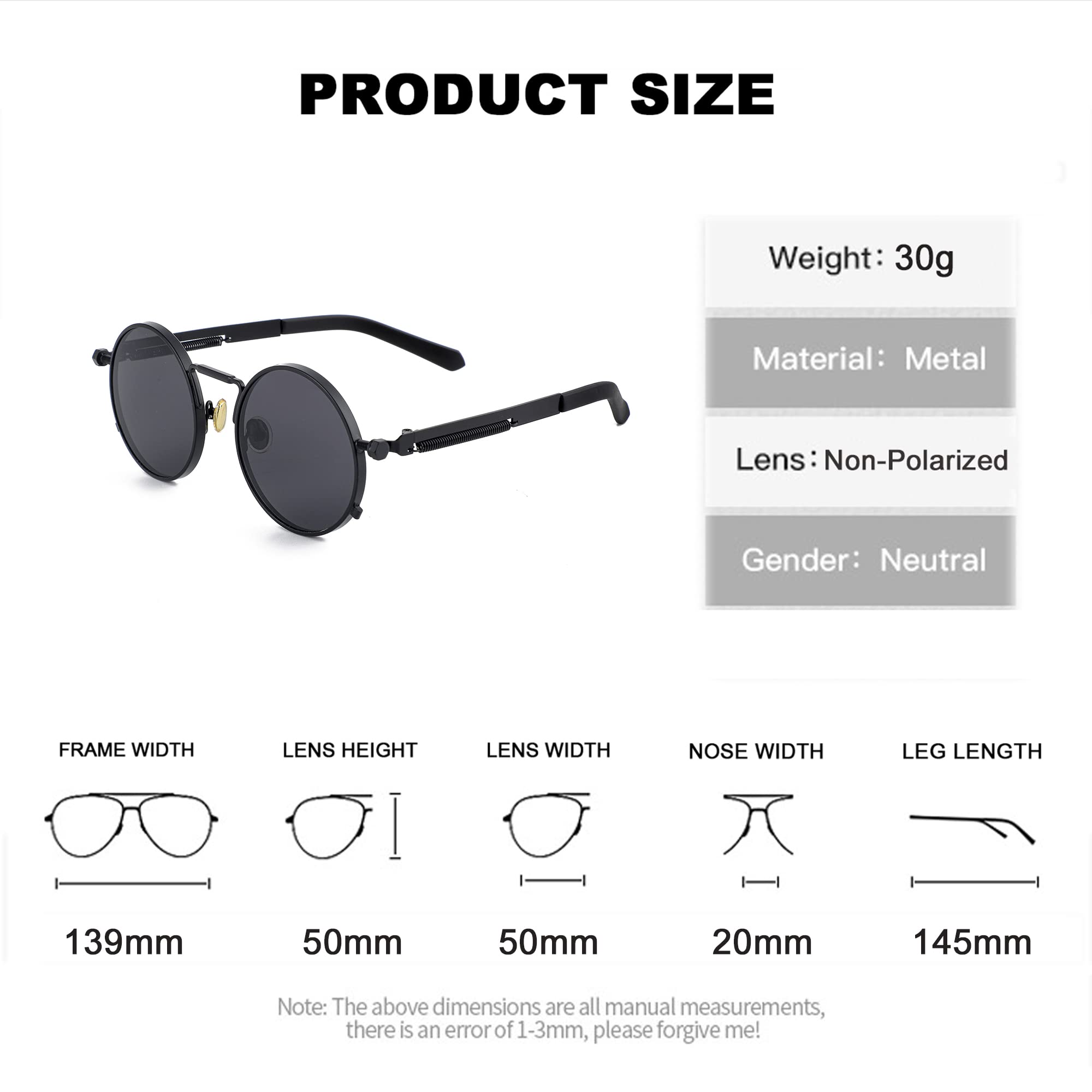 βCIRCLE FULL METAL FRAME DESIGN: The round sunglass uses a full stainless steel metal frame, reinforced metal hinges, soft nose pad materials, spring temples, and the overall classic steampunk design makes you more natural and beautiful when you wear it.