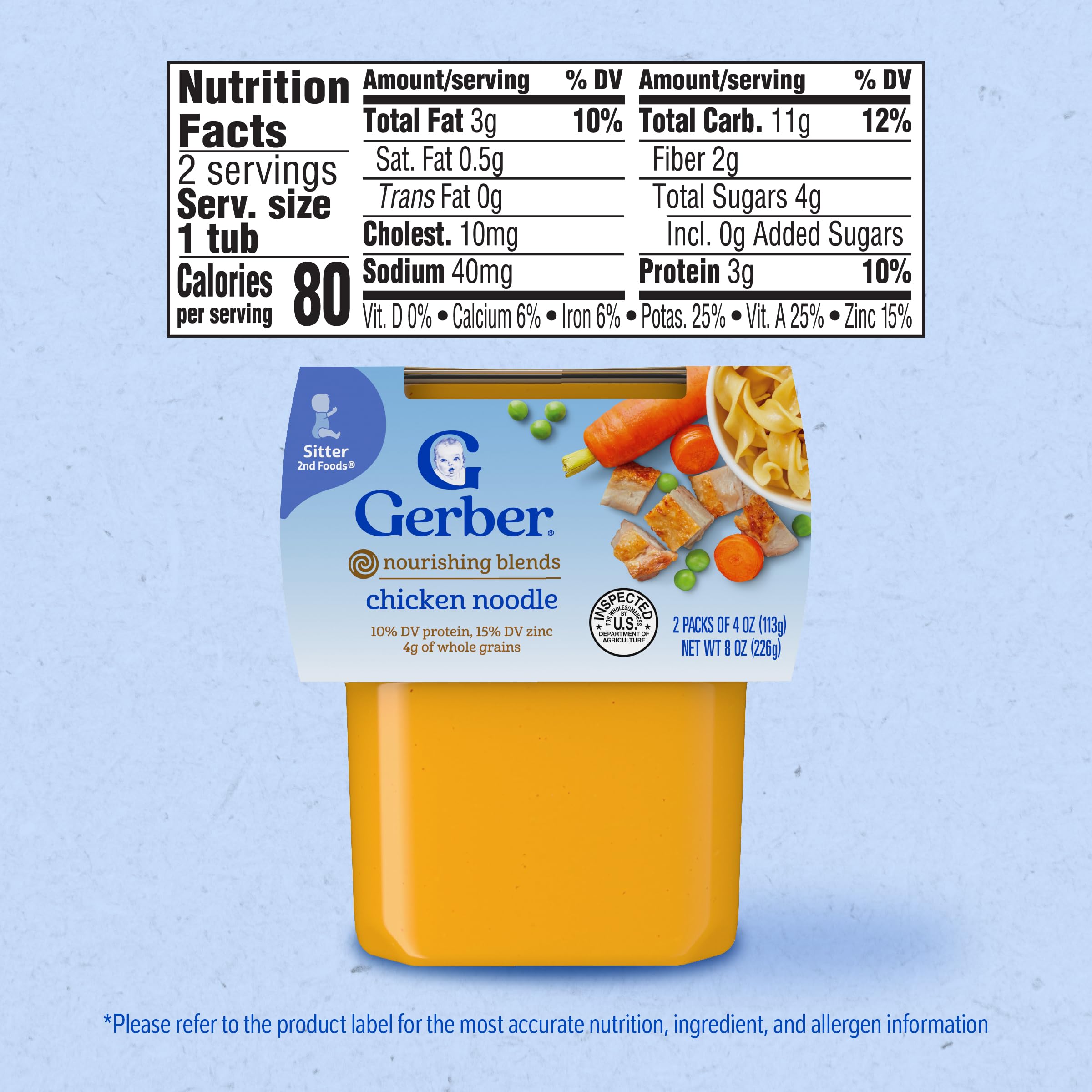 Gerber Stage 2 Baby Food, Chicken Noodle Puree Tubs are a premium choice for your child’s early stages. They are crafted to support a varied diet, along with meeting the busy lifestyle needs of caretakers and parents. Each baby puree tub comes in a portable, easy-to-store format – making it perfect for life’s busy moments. This stage 2 baby food puree is designed for babies who are ready to start introducing new textures and flavors into their diet. Gerber understands the importance of providing wholesome ingredients during the crucial developmental stages of your child's life -- that’s why these baby puree tubs are ideal for parents who seek a convenient and high-quality option in their baby's diet. These tubs need to be refrigerated after opening and must be used after 1 day.