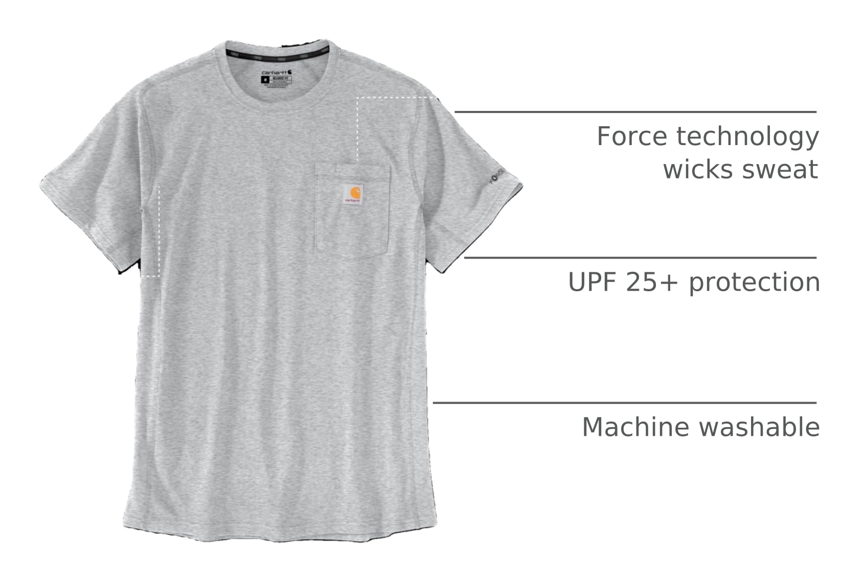 Description On the job or under the sun, this men's Carhartt t-shirt keeps you cool and comfortable. UPF-rated jersey fights off sweat and dries fast so you can stay focused on the task at hand. Ventilated panels keep the air circulating, and a drop-tail hem provides extra coverage.