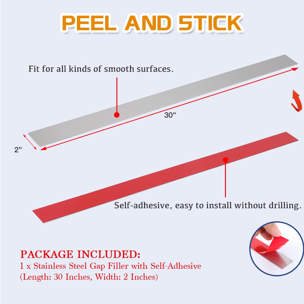 ✔VERSATILE AND MULTIPURPOSE - NOTE: Package Included: 1 X Stainless Steel Gap Filler with Self-Adhesive (Length: 30 Inches, Width: 2 Inches). This 304 Brushed Stainless Steel Sheet Gap Filler is used to fill space between wall and range or built-in microwave/ oven. 30" long design fits for most top brand stove/ range / oven/ microwave. Creates a custom, built-in look between your new stainless appliances and cabinet.