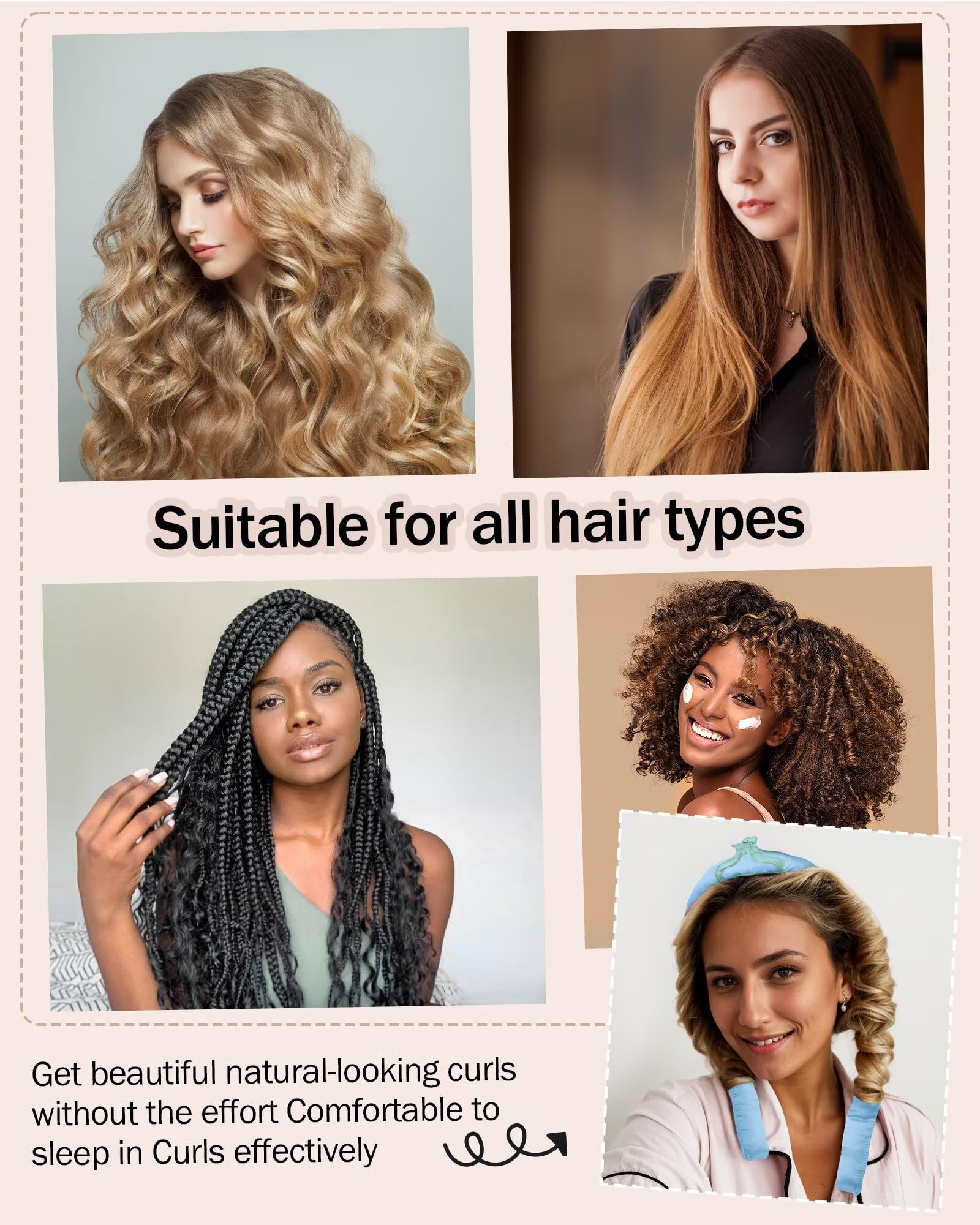 Achieve Natural Curly Looks:Our heatless hair curler combines the luxury of satin material on the outside with ultra-soft padding on the inside,it ensures gentler, more comfortable for overnight wear, and carries no chemical odors.It holds your hair securely in place for flawless curls