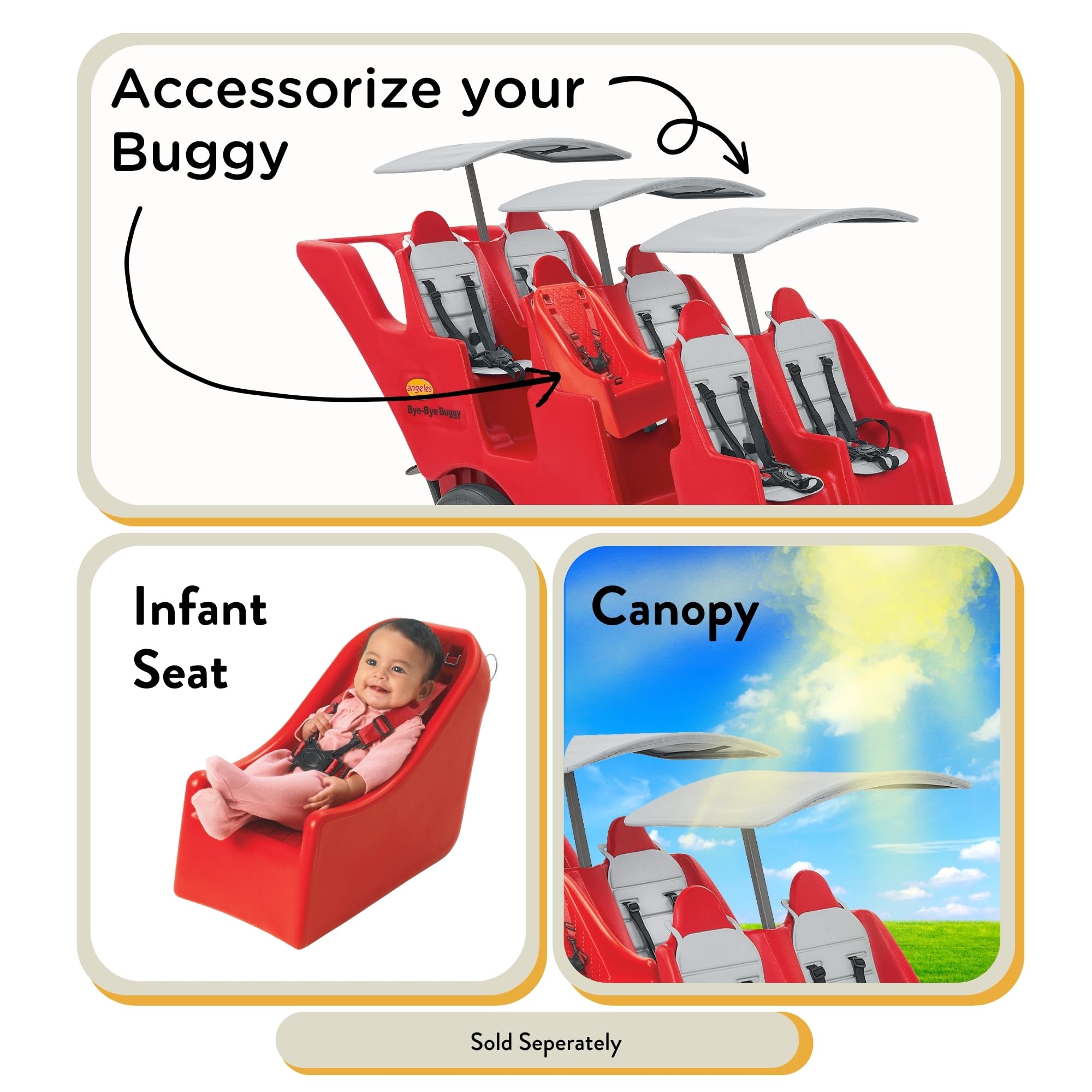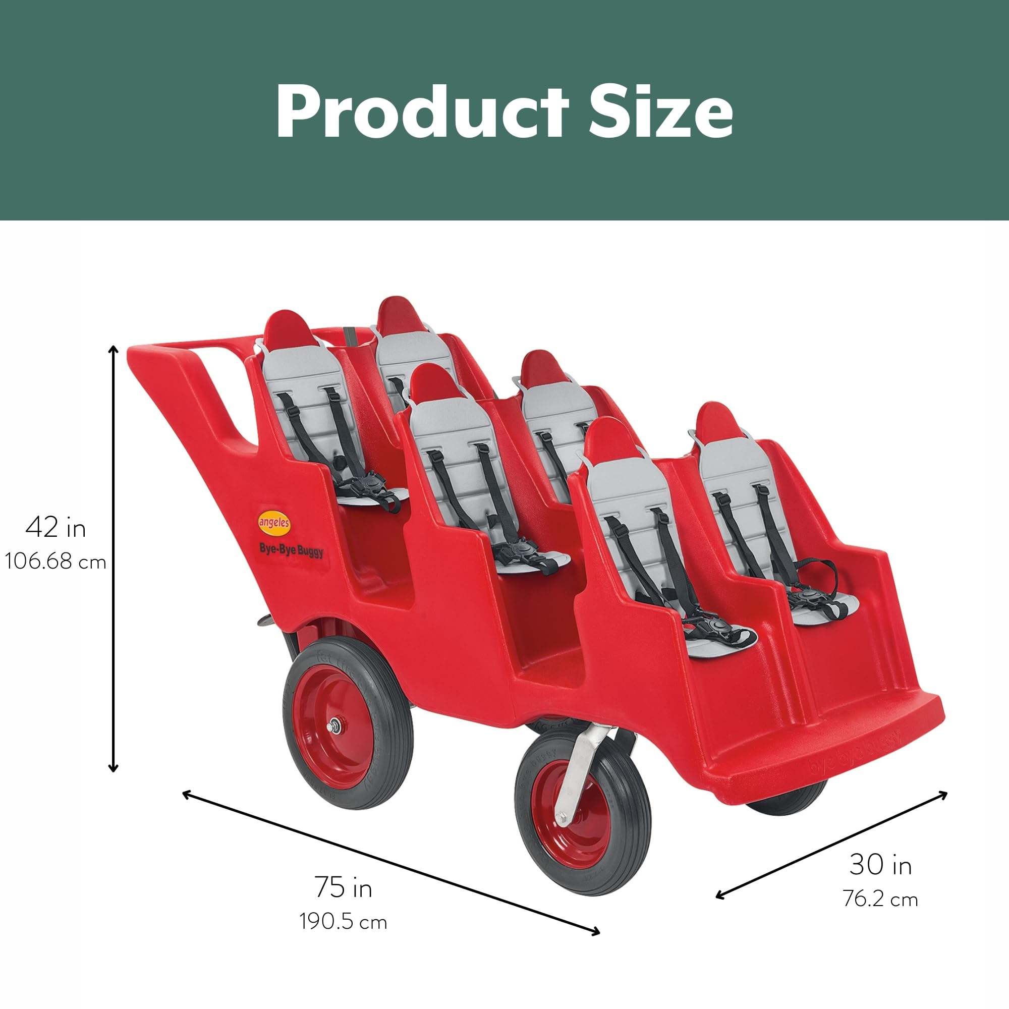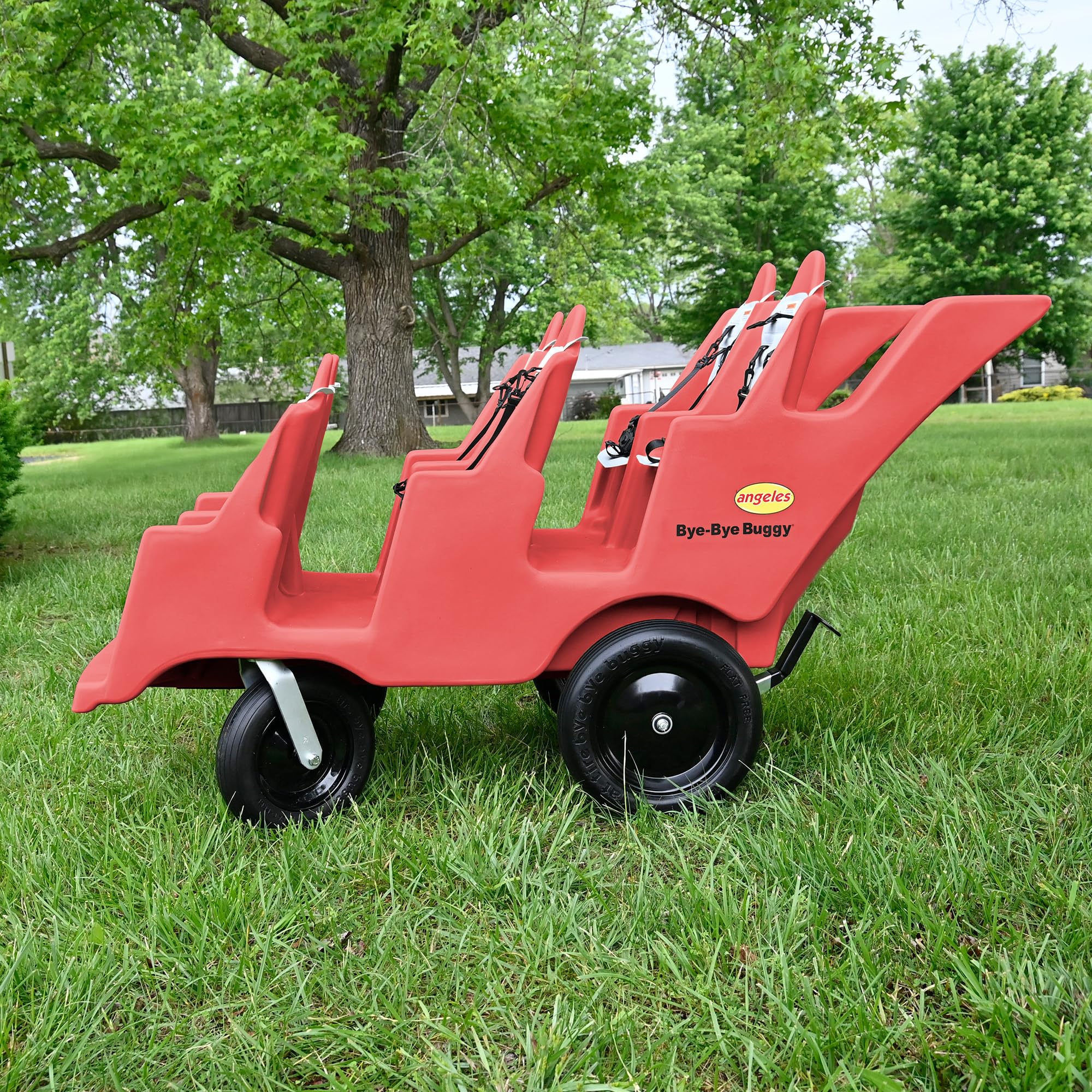 Children's Factory Angeles Bye-Bye Buggy: 6-Passenger Stroller for Daycare Daycare providers, this one's for you. The Angeles Bye-Bye Buggy is a multi-passenger stroller designed to make transporting young children easier and safer. This spacious buggy comfortably fits up to 6 children, each weighing up to 40 pounds. No more struggling with multiple single strollers, the Bye-Bye Buggy keeps everyone together for smoother outings. Each seat features replaceable, 5-point harnesses that are easy to fasten and keep kids securely buckled in during rides. Forget about flat tires! The Bye-Bye Buggy boasts special "fat tires" that are puncture-proof. Whether you're strolling on pavement, grass, or uneven ground, these tires ensure a comfortable ride for both you and the children. The 360-degree swiveling front wheels allow for tight turns and easy navigation through narrow hallways or crowded playgrounds. The sturdy, one-piece molded frame of the Bye-Bye Buggy is built to last, providing a secure and comfortable environment for your little passengers. A parking brake keeps the buggy secure when stopped, giving you peace of mind. The Bye-Bye Buggy is designed to fit through standard doorways, allowing for easy movement between rooms or outdoor adventures. Canopies are sold separately and a separate seat is required for children under 6 months old.