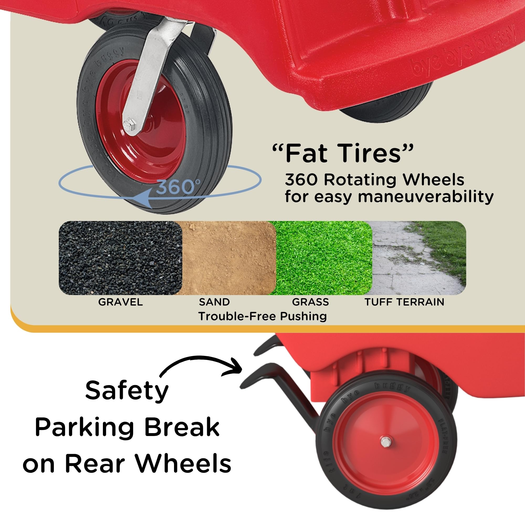 Puncture-Proof Tires: Bye Bye Buggy features "fat tires" that are designed to never go flat, even on uneven terrain. The front wheels swivel a full 360 degrees, allowing for effortless maneuvering on all surfaces, including bumpy grass or gravel paths