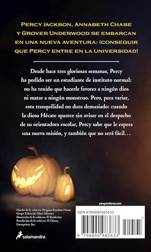 Continuan las aventuras de Percy Jackson, el protagonista estrella de Rick Riordan Percy Jackson, Annabeth Chase y Grover Underwood se embarcan en una nueva aventura: ¡conseguir que Percy entre en la universidad! Desde hace tres gloriosas semanas, Percy ha podido ser un estudiante de instituto normal: no ha tenido que hacerle favores a ningún dios ni matar a ningún monstruo. Pero, para variar, esta tranquilidad no dura demasiado: cuando la diosa Hécate aparece sin avisar en el despacho de su orientadora escolar, Percy sabe que le espera una nueva misión, y también que no será fácil… ENGLISH DESCRIPTION In his continuing quest to earn college recommendation letters from the gods, Percy has to pet sit the goddess Hecate's polecat and giant mastiff during Halloween week. What could go wrong? Rick Riordan’s newest Percy Jackson adventure is full of hilarious set pieces, a diverse cast of gods and monsters, and many other delightful tricks and treats. Percy Jackson, now a high school senior, needs three recommendation letters from the Greek gods in order to get into New Rome University. He earned his first one by retrieving Ganymede’s chalice. Now the goddess Hecate has offered Percy another “opportunity”—all he has to do is pet sit her polecat, Gale, and mastiff, Hecuba, over Halloween week while she is away. Piece of cake, right? Percy, Annabeth, and Grover settle into Hecate’s seemingly endless mansion and start getting acquainted with the fussy, terrifying animals. The trio has been warned not to touch anything, but while Percy and Annabeth are out at school, Grover can’t resist drinking a strawberry-flavored potion in the laboratory. It turns him into a giant frenzied goat, and after he rampages through the house, damaging everything in sight, and passes out, Gale and Hecuba escape. Now the friends have to find Hecate’s pets and somehow restore the house, all before Hecate gets back on Saturday. It’s going to take luck, demigod wiles, and some old and new friends to hunt down the animals and set things right again.