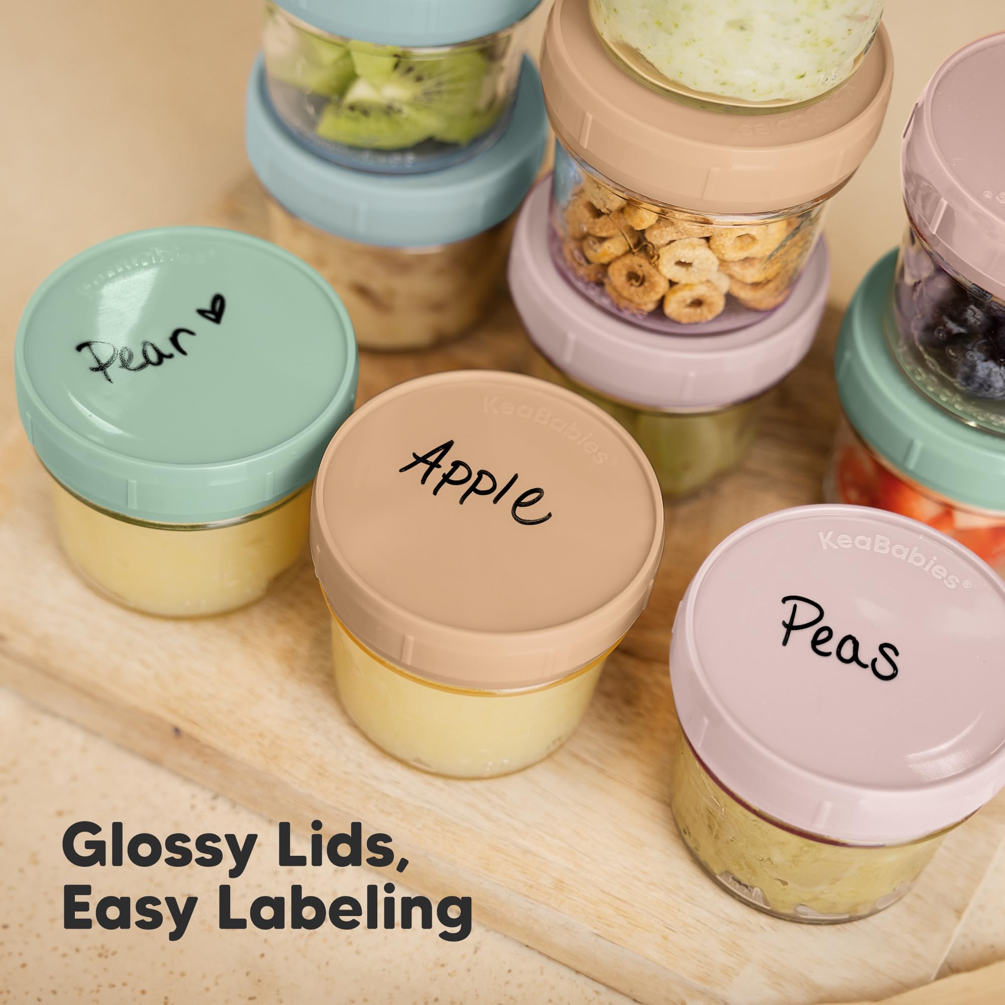 Perfect Portions, Smart Stacking – KeaBabies Prep Baby Food Storage Containers Glass has measurement markings and writeable lids for easy labeling. The smart stacking lid acts as a fall guard, keeping these baby puree jars glass secure when stacked.