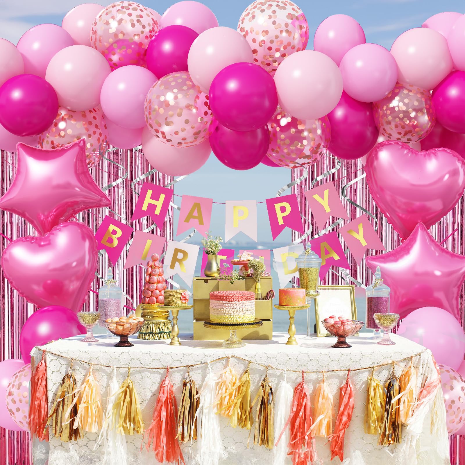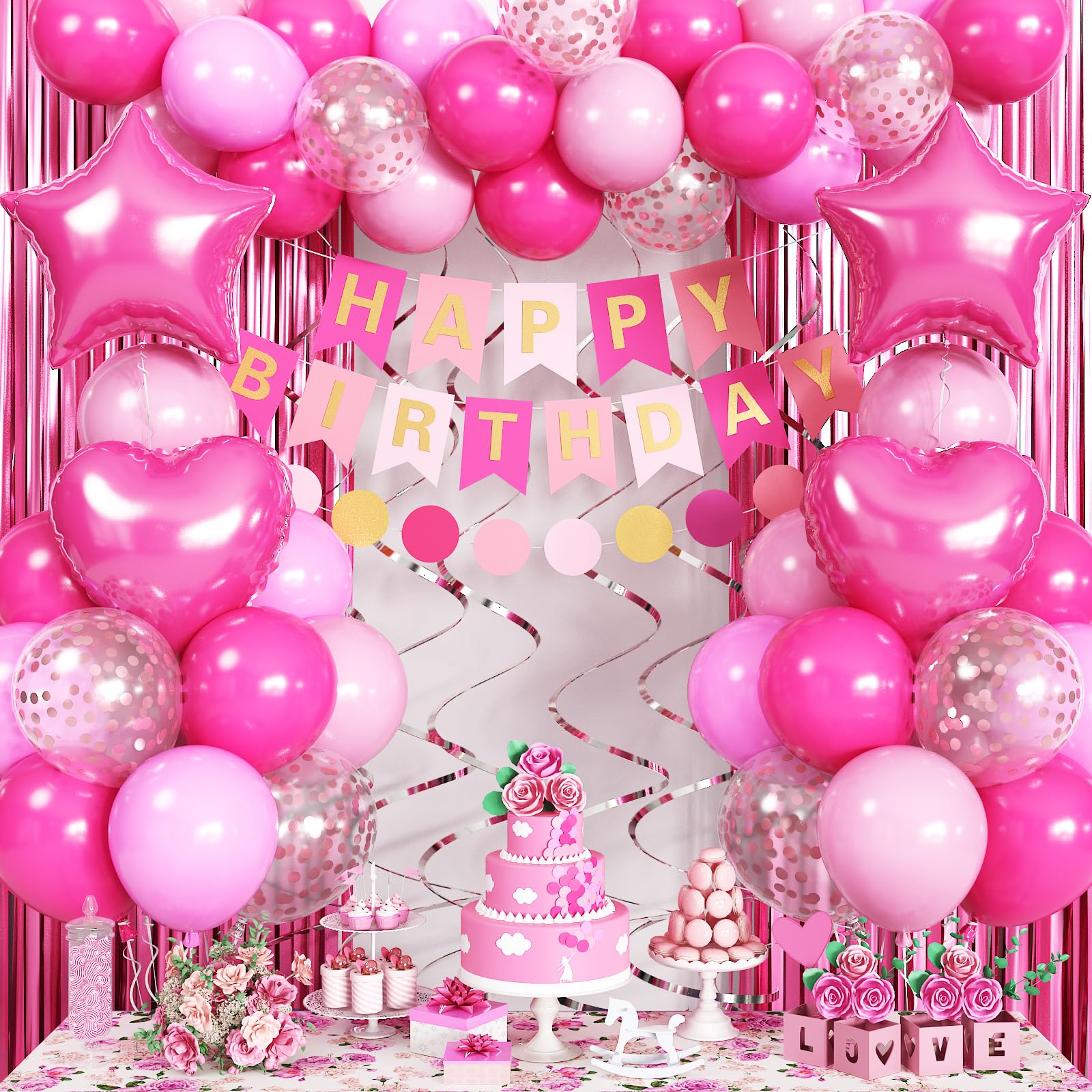 🎂 birthday decorations pink for Girls Women Men Boys - Create Unforgettable Celebrations 🎉 Make birthday a truly memorable occasion with our stunning hot pink birthday party decorations for her or him. 🎈 This comprehensive baby pink party decorations set is perfect for birthday party decoration, birthday party, wedding party decoration, baby shower, bridal showing, wedding, engagement, anniversary, girls graduation party decoration etc. 🎉 What's in a birthday decoration set? 🎈 2pcs 18 inches stars foil balloons 🎈 2pcs 18 inches hearts foil balloons 🎈 1pc pink birthday banner bunting 🎈 2pcs dark pink foil fringe curtains 🎈 6pcs silver hanging swirls 🎈 1pc dot paper garland 🎈 10pcs 12 inch pink party balloons 🎈 10pcs 12 inch fuschia pink balloons 🎈 10pcs 12 inch baby pink balloons 🎈 6pcs 12 inch rose gold confetti balloons 🎈 16ft balloon strip tape (1 roll), 100pc glue dot (1 roll), 1pc balloon ribbon. ✨ Specification- 🎉 Material: Crafted with high-quality latex and thick cardboard materials, our pink happy birthday decorations are built to last and create a lasting impression. 🎉 Inflatable- Air or Helium. Large quantity of pink birthday balloons set are perfect for creating a stunning balloon arch, balloon garland, or balloon bouquet. You can mix and match the number to create a unique and personalized look that matches your event's theme. Warm Tips - ⚠ Please do not over-inflate the balloon to avoid pop. ⚠ Due to the display of the monitor, the color may be slightly different from the actual item. ⚠ The confetti balloons come with confetti inside. After inflating, please rub carefully with carpet, silk, hair and roll the balloons. ⚠ Please do not inflate the baby pink balloons too much. 85% is optimal.